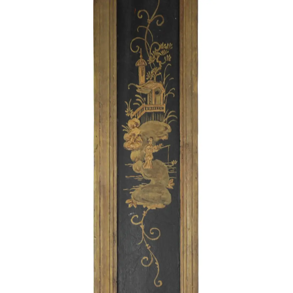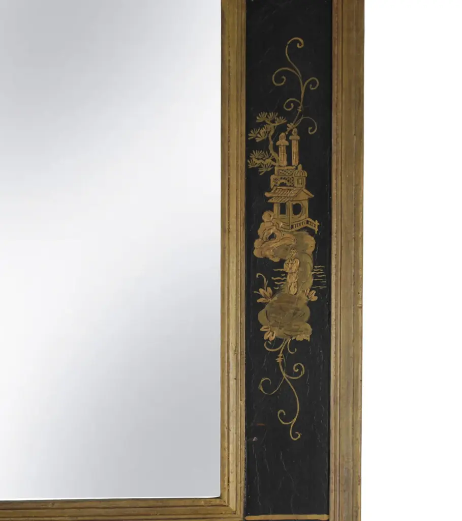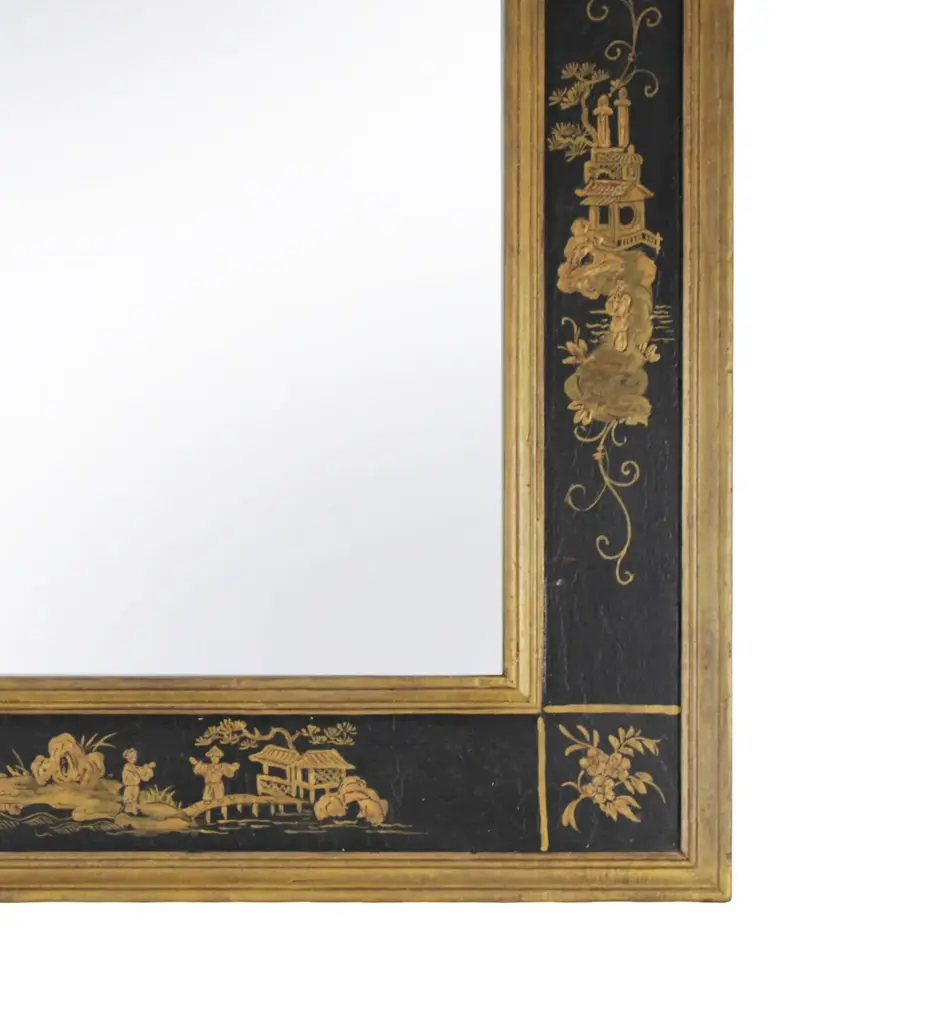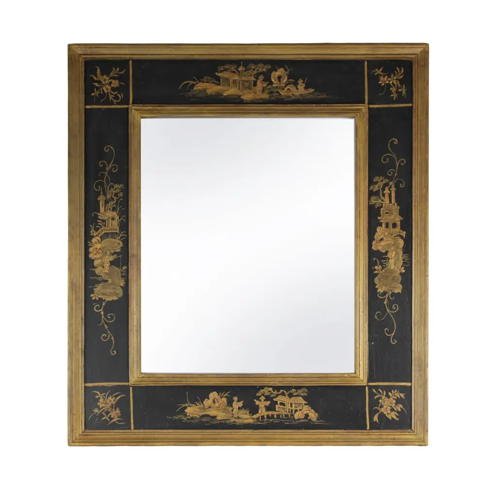 Antique Gilt black Chinoiserie Mirror. vintage gilt black Chinoiserie mirror. This mirror is a very typical European chinoiserie art form from the 17th to 18th century. It is a work of art anywhere in the interior, it is hand-painted by the artist, with lots of gilding, Chinese patterns and figures, and magnificent landscapes. Chinoiserie became popular in Europe in the mid-18th century. Today, chinoiserie remains a widely imitated design trend because its whimsical, incredible landscapes and playful embellishments create a charming decorative aesthetic. less 33ʺW × 1ʺD × 37ʺH