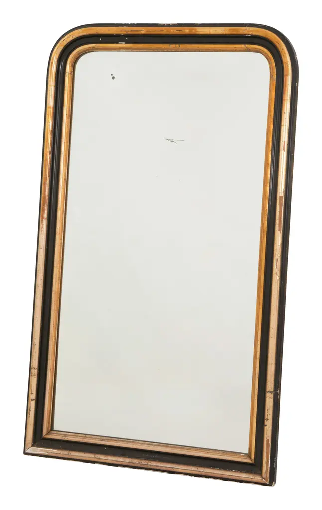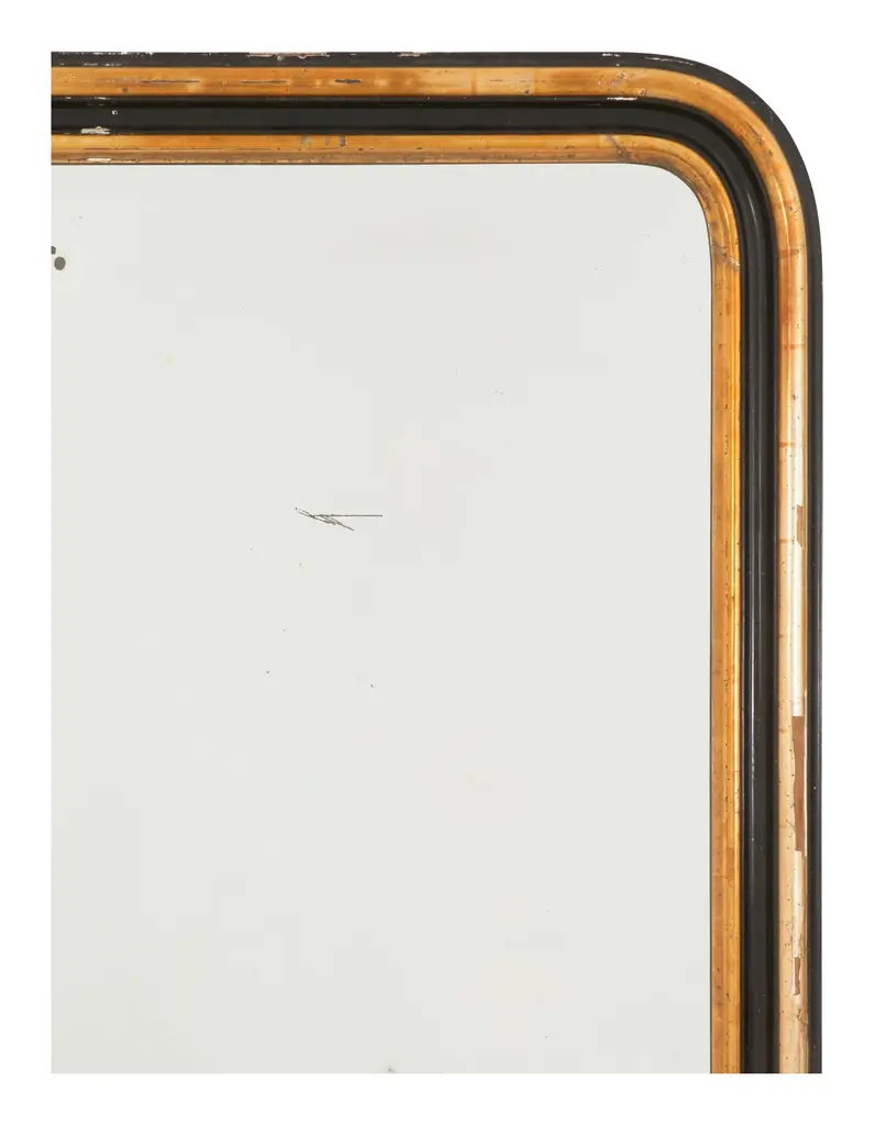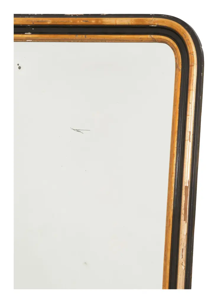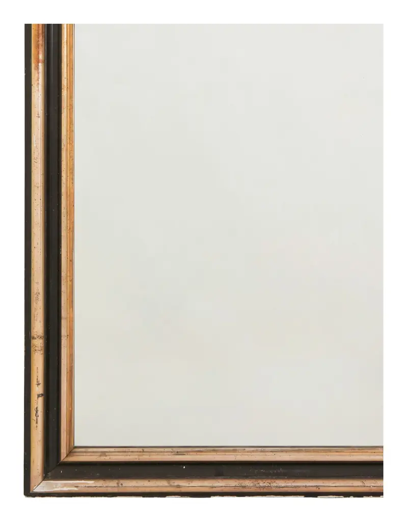 •gilt and black painted wood frame.•original mirror.•patinaed finish. •late 19th centuryfrance. Dimensions•38"w x 2"d x 63.75"h