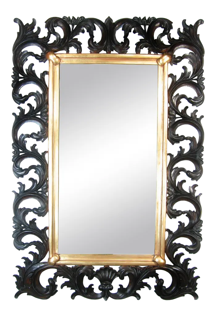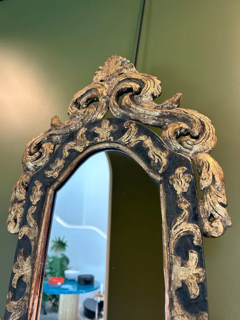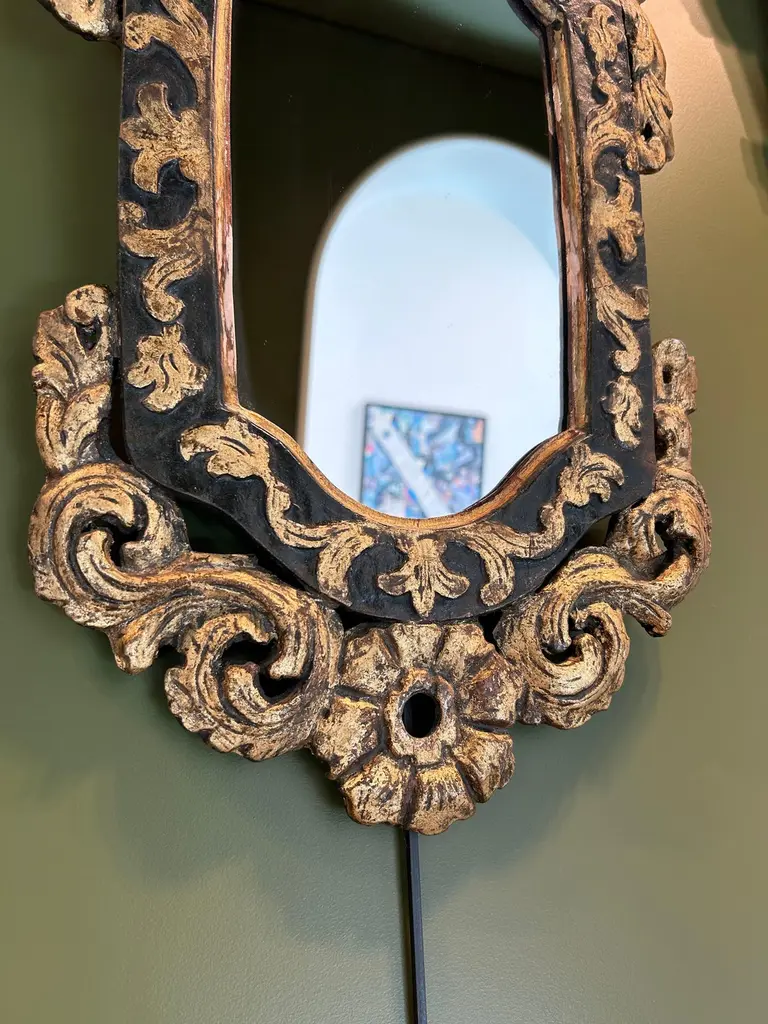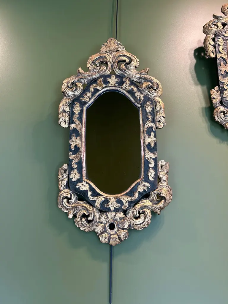 Exquisite 19th-century antique mirrors from Portugal. Crafted with painted and gilded wood, they feature intricate decorations of volutes and palmettes, showcasing the artistic elegance of the era. These mirrors bear signs of use and old restorations, adding to their unique charm and authenticity. Perfect for collectors and those looking to infuse a touch of historical grandeur into their spaces.