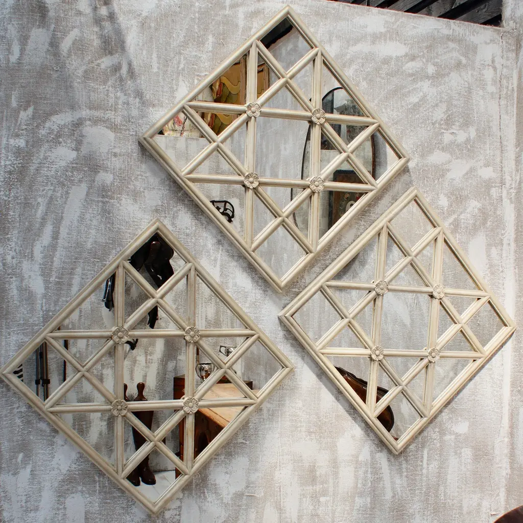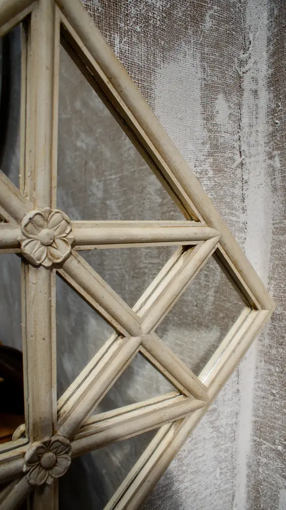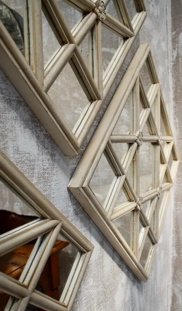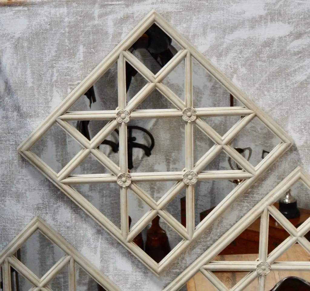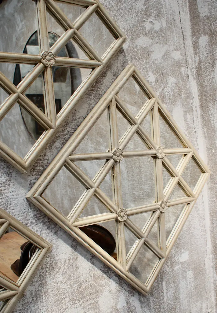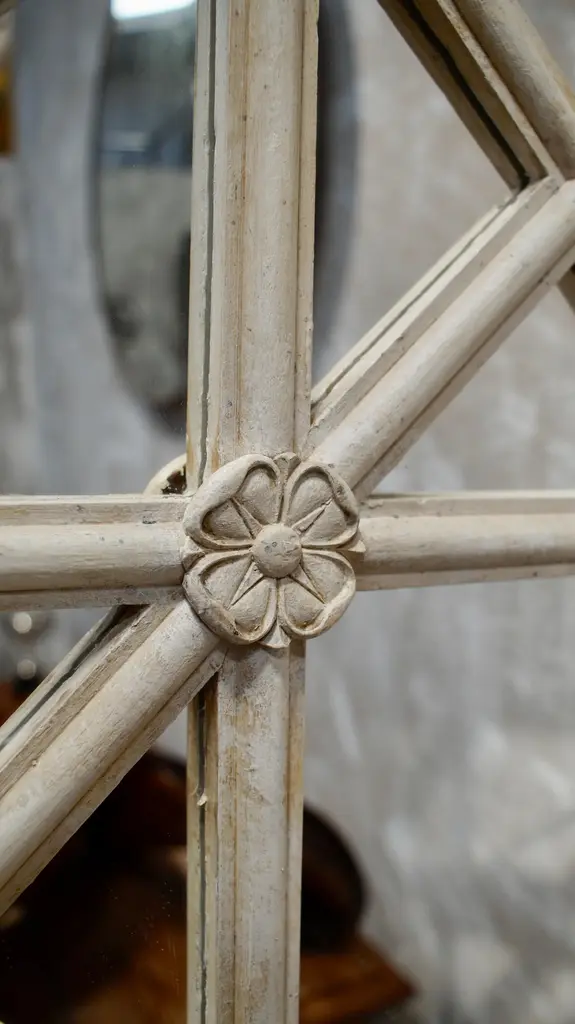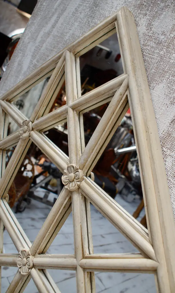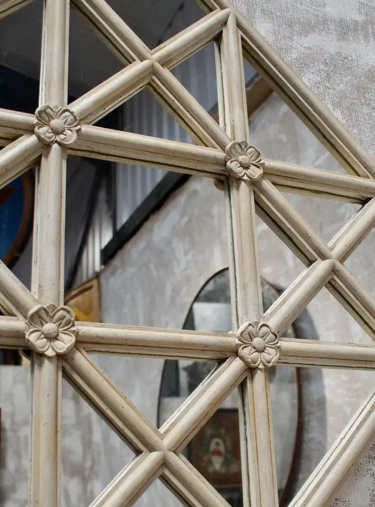 This is a stylish turn of the century panelled window mirror with decorative panelling and rose detailing. The surrounding oak frame retains the original paint and a beautiful patina. The mirror would look lovely in any hallway, lounge or shop setting. The mirror has been reclaimed from a country home in Ayr Scotland and is a wonderful example of an antique window mirror.