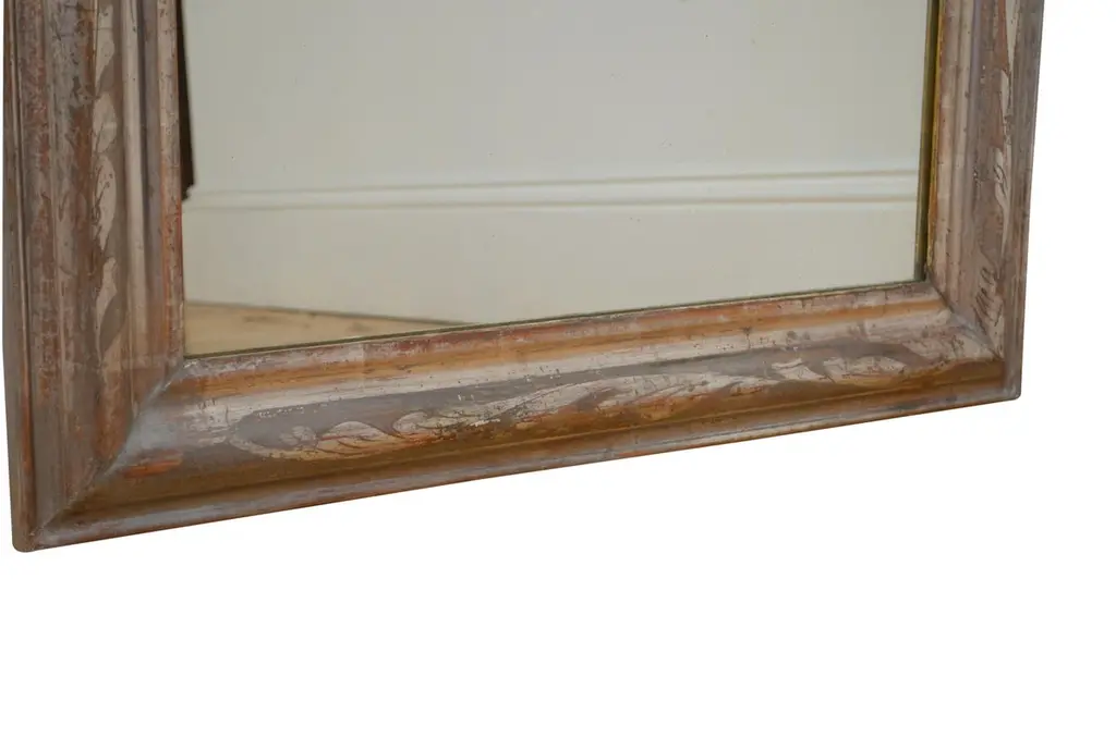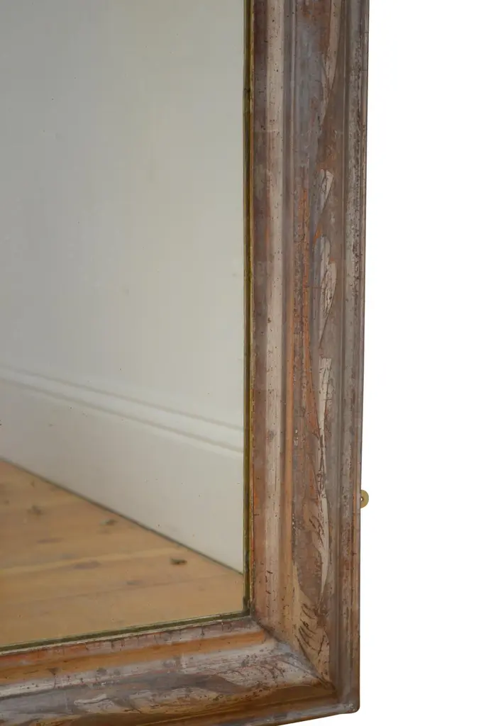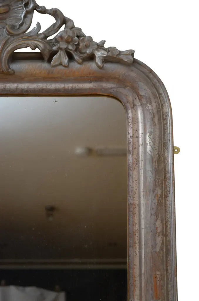P0219 Rare XIXth century wall mirror, having original glass with minor foxing and moulded silver frame with engrave flower motifs and foliage crest to the centre. This antique mirror retains its original glass, original silvering with some touching up and original backboards. All fitted with four wall brackets, ready to place at home. c1860 H54.5" w28" D3.5"H139cm W71cm D9cm