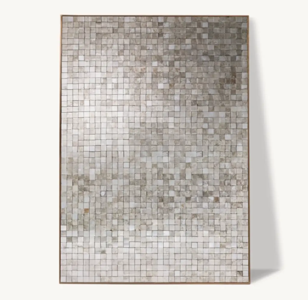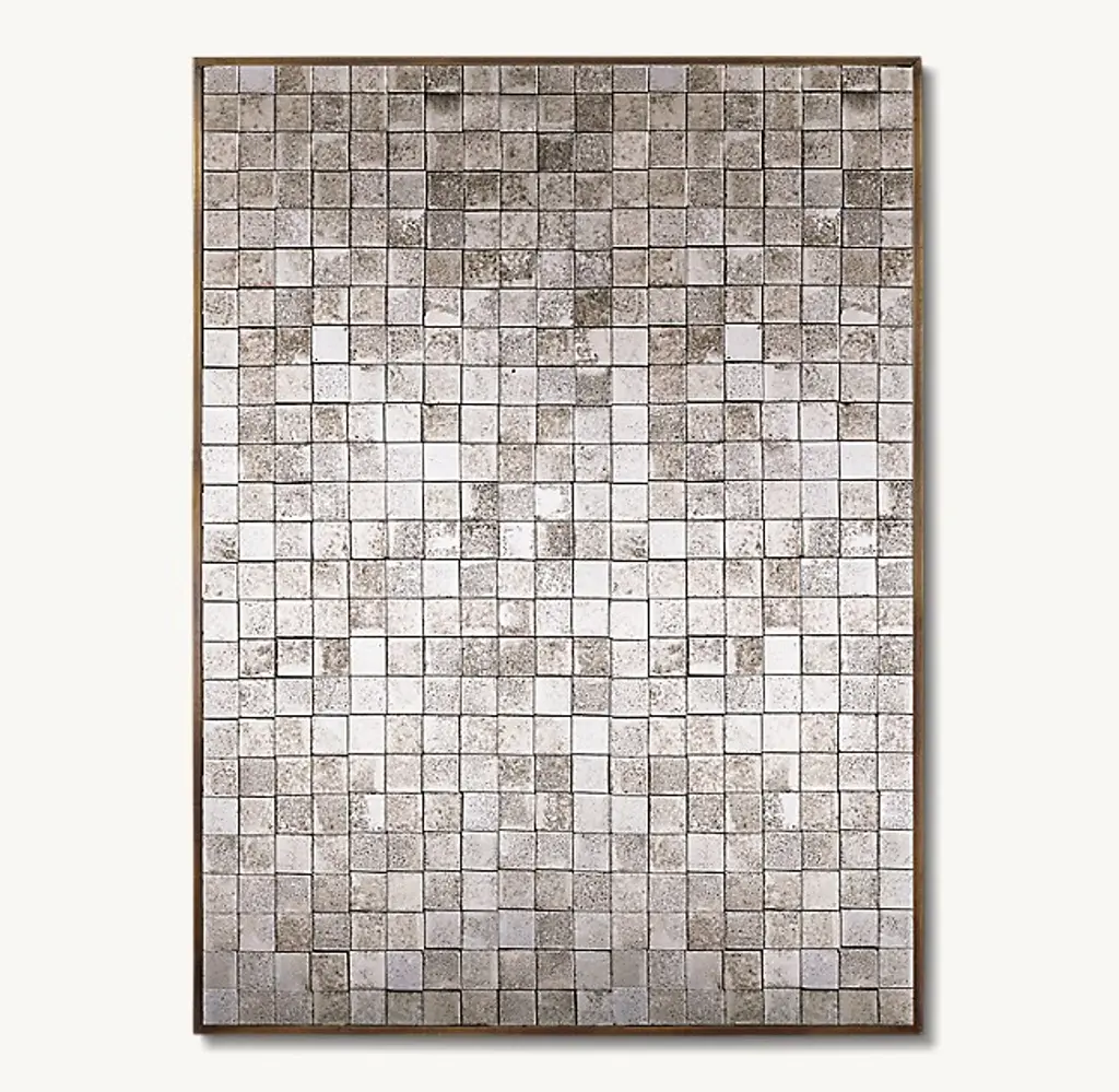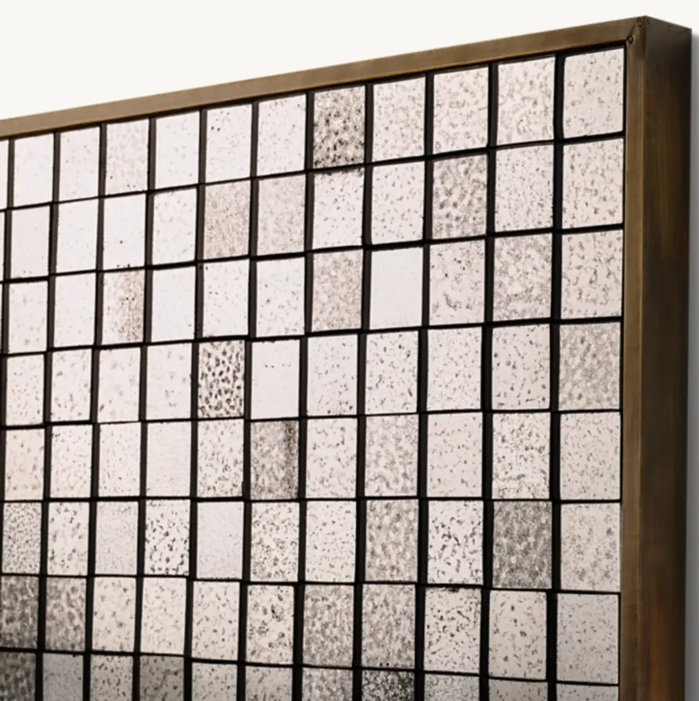 Artisan crafted from antiqued glass tiles, our mirror exemplifies the bold scale and exuberance of 1970s design. The light-reflecting mosaic is counterbalanced by the burnished warmth of an aged brass frame.