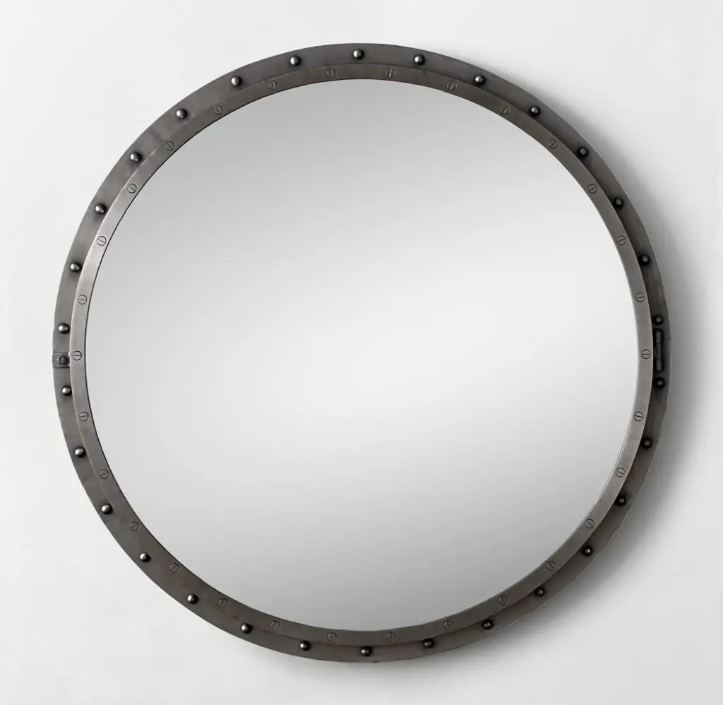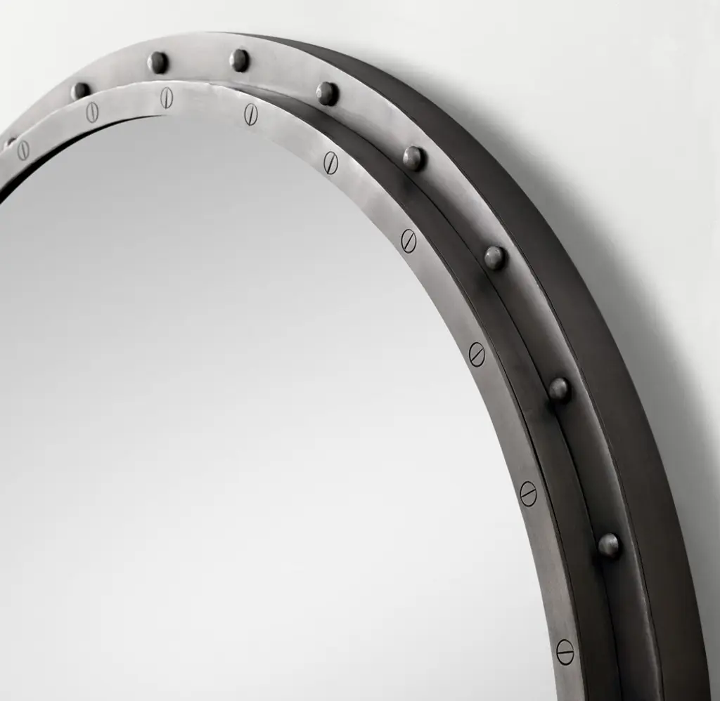 Our riveted mirror is functional décor with an industrial-inspired twist. Its antiqued metal frame features a stepped design for extra heft and is trimmed all around in rivets.