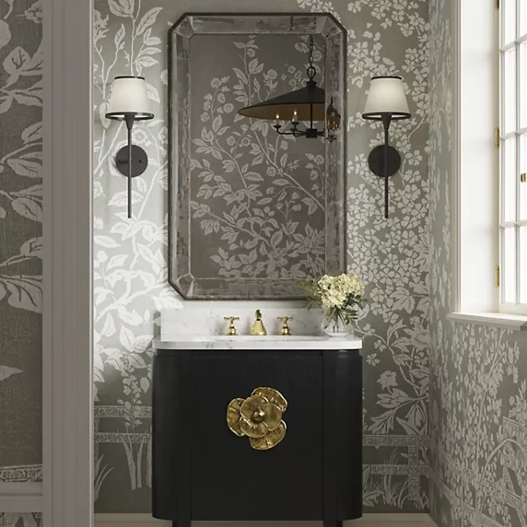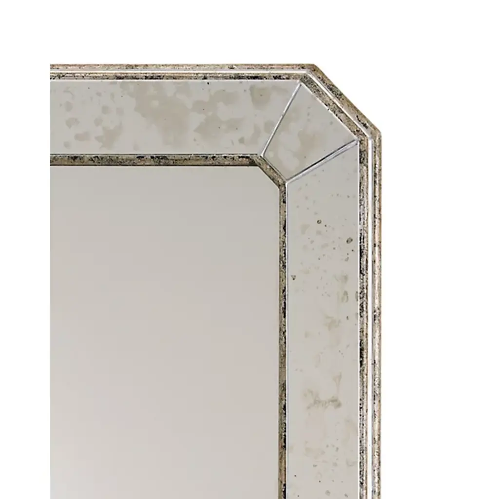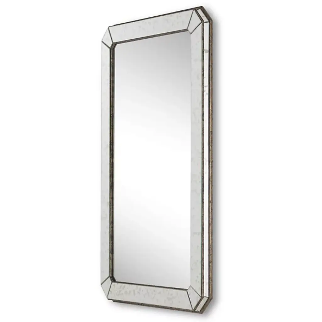 The Antiqued Wall Mirror from Currey & Company brings a Venetian-inspired touch to its surroundings. Its faceted frame features mottled glass strips around a central reflector, creating a layered, dimensional effect with vintage appeal. The mirror mounts vertically and blends contemporary style with rustic modern influences, adding character and warmth to its surroundings, rich with aged detailing and reflective depth.