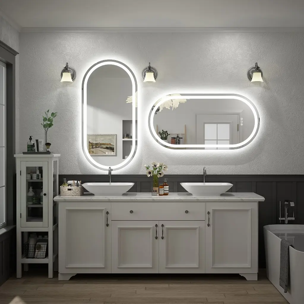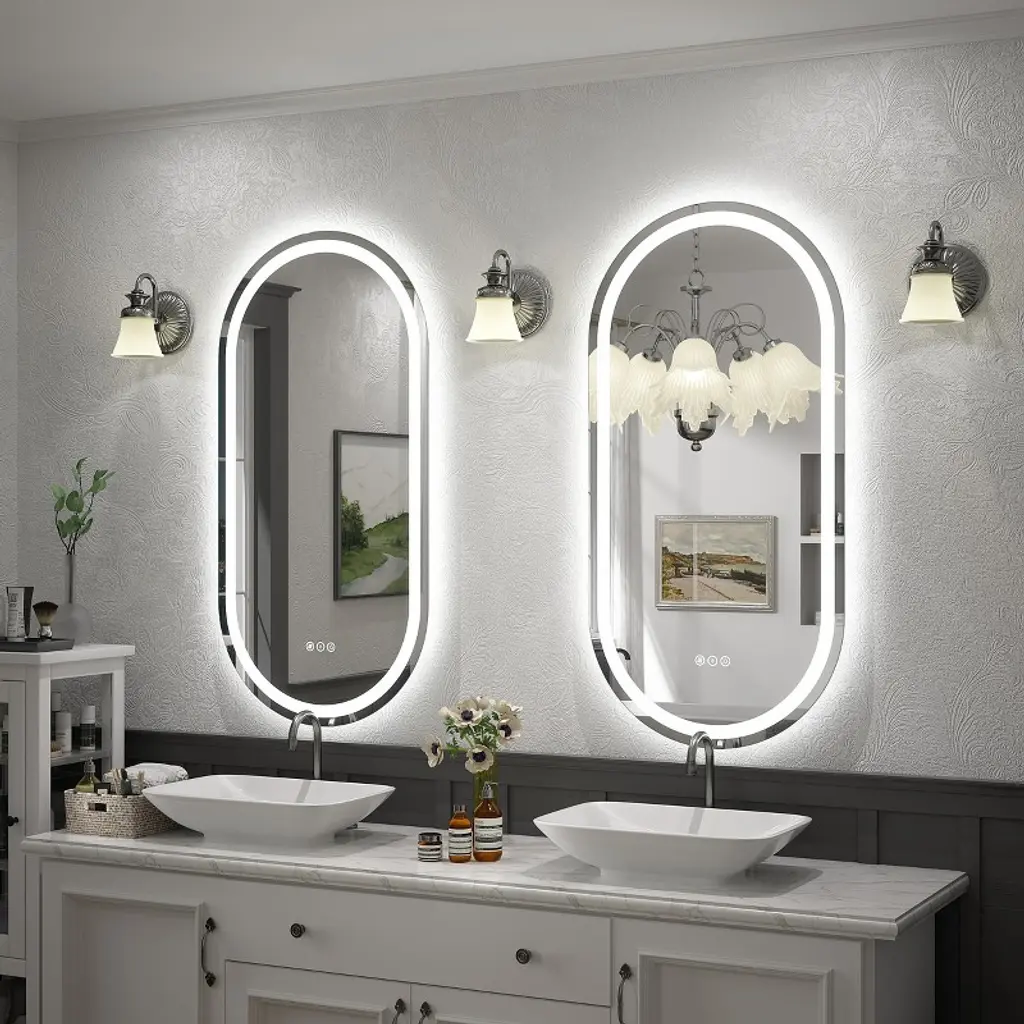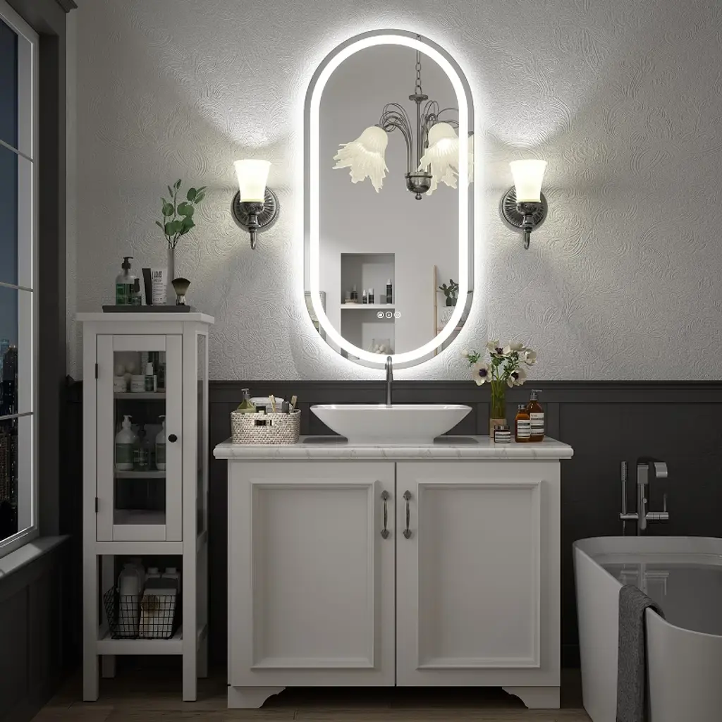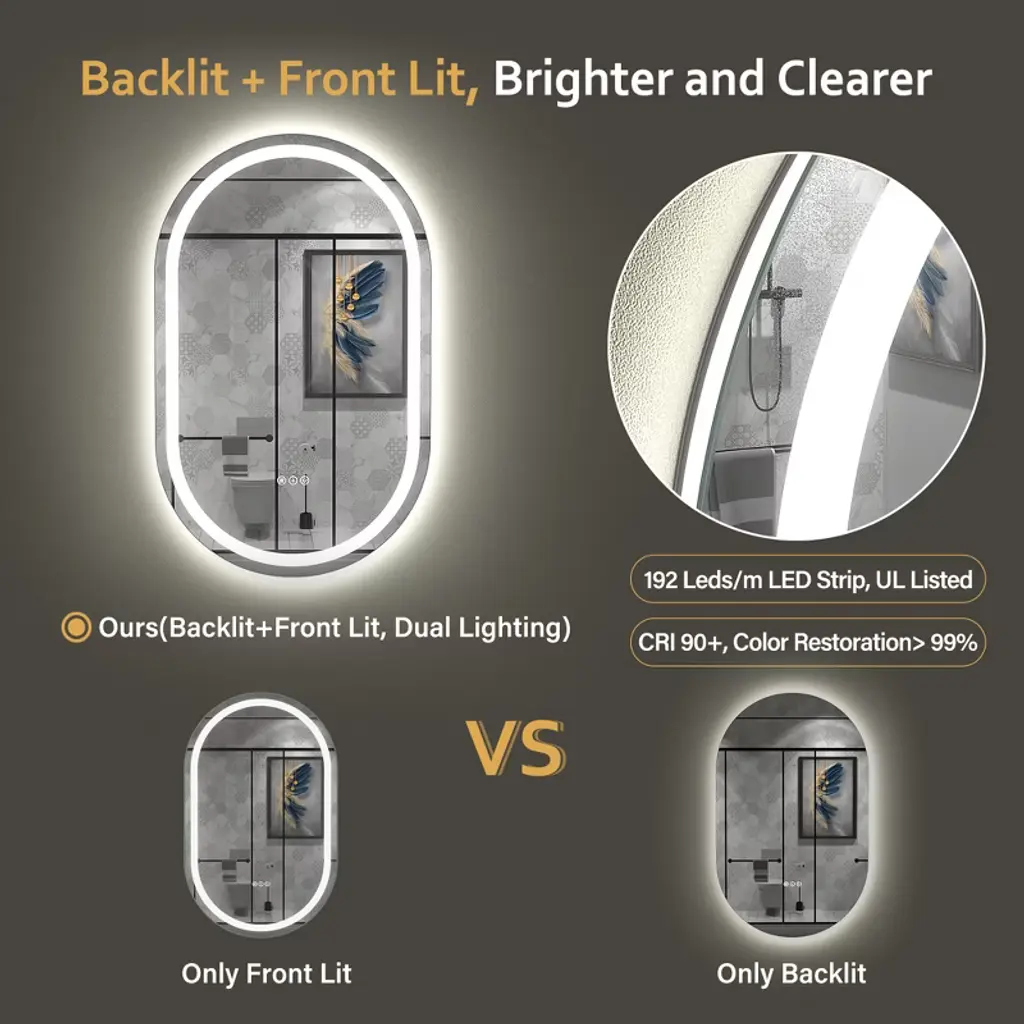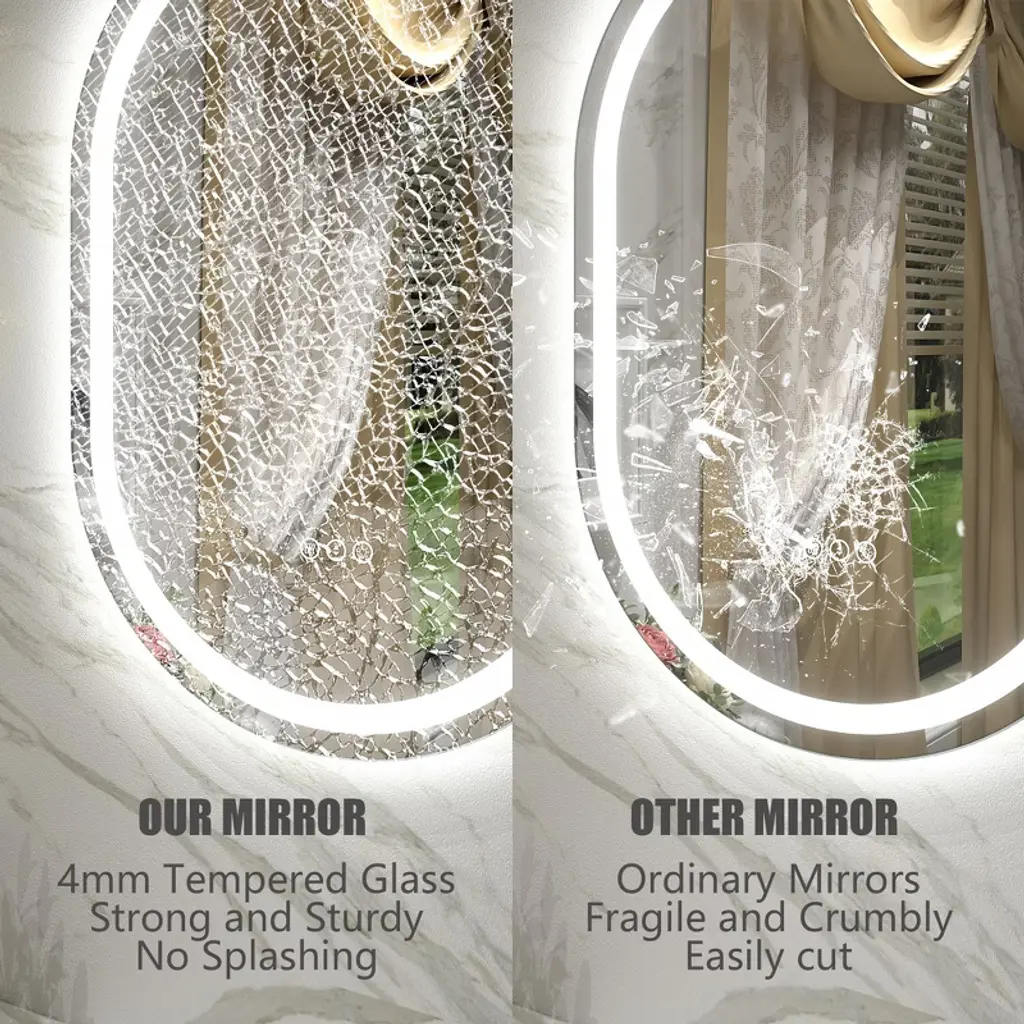 Upgrade your bath with this 3-year warranty LED oval mirror, featuring 24-volt output voltage super-bright real cri90+ 192 leds/m light strip (others are 12-volt low-power light strips, which are not bright enough.), tempered glass material and custom packaging (almost unbreakable). 3 color temperature and brightness adjustment, smart anti-fog design, brings a modern look to your space.