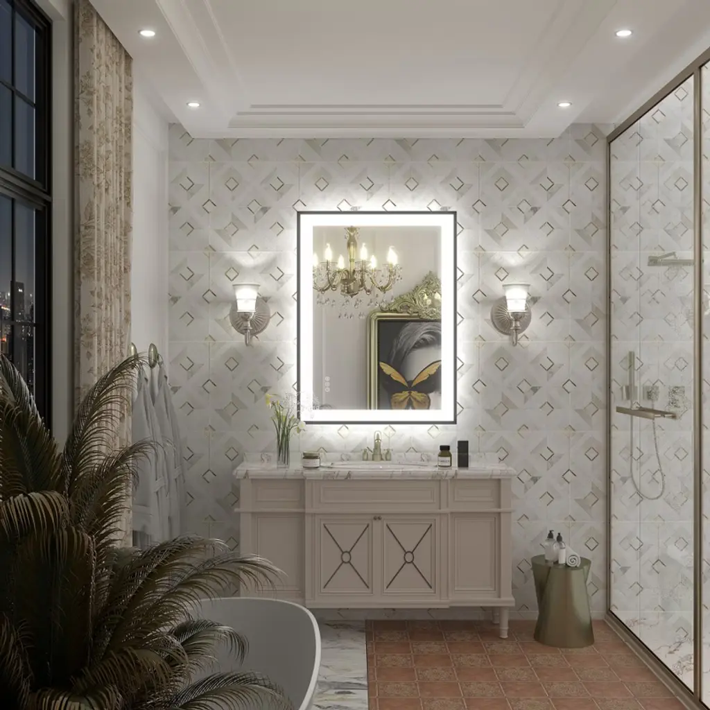 Upgrade your bath with this 3-year warranty LED framed mirror, featuring 24-volt output voltage super-bright real cri90+ 192 leds/m light strip (others are 12-volt low-power light strips, which are not bright enough.), high-strength & durable space aluminum frame and tempered glass material (almost unbreakable). 3 color temperature, brightness adjustment and anti-fog design to meet your smart needs. Sharp and sturdy frame designs can be matched with various decoration styles (modern, glam, industrial, farmhouse, rustic, etc.) and usage scenarios (bathroom, living room, bedroom, dressing room, hallway, aisle, etc.), highlighting the beauty of space.