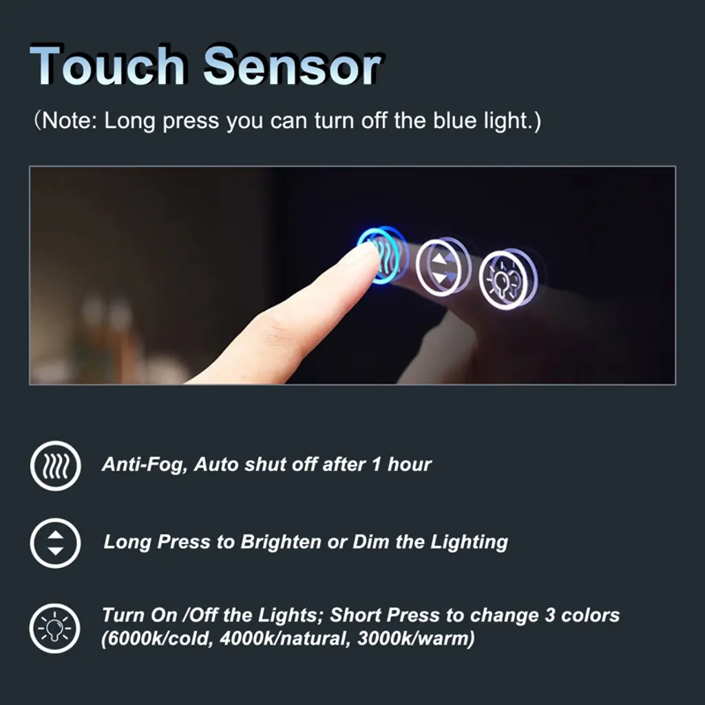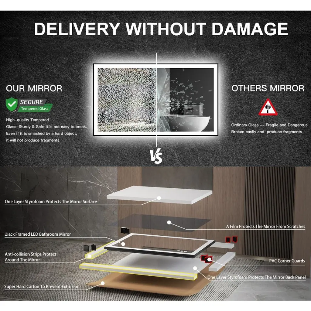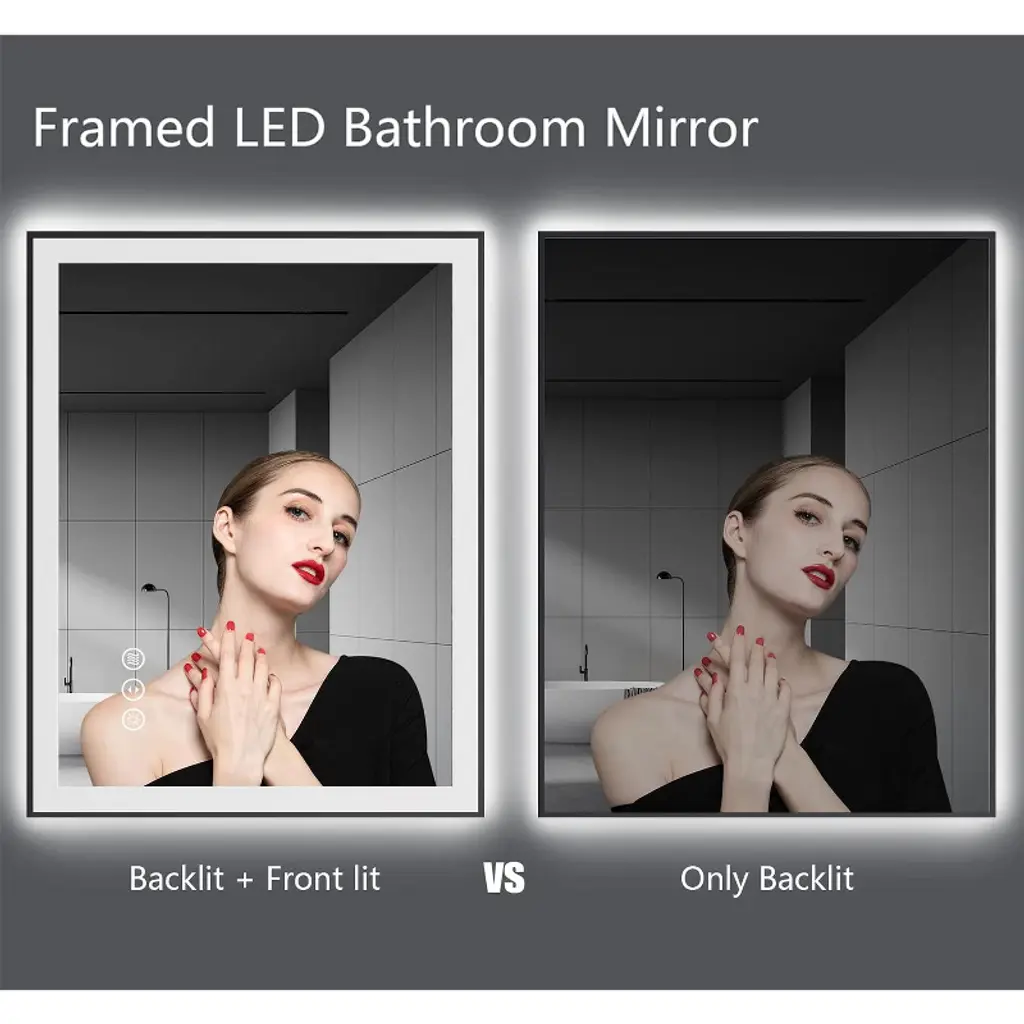Upgrade your bath with this 3-year warranty LED framed mirror, featuring 24-volt output voltage super-bright real cri90+ 192 leds/m light strip (others are 12-volt low-power light strips, which are not bright enough.), high-strength & durable space aluminum frame and tempered glass material (almost unbreakable). 3 color temperature, brightness adjustment and anti-fog design to meet your smart needs. Sharp and sturdy frame designs can be matched with various decoration styles (modern, glam, industrial, farmhouse, rustic, etc.) and usage scenarios (bathroom, living room, bedroom, dressing room, hallway, aisle, etc.), highlighting the beauty of space.