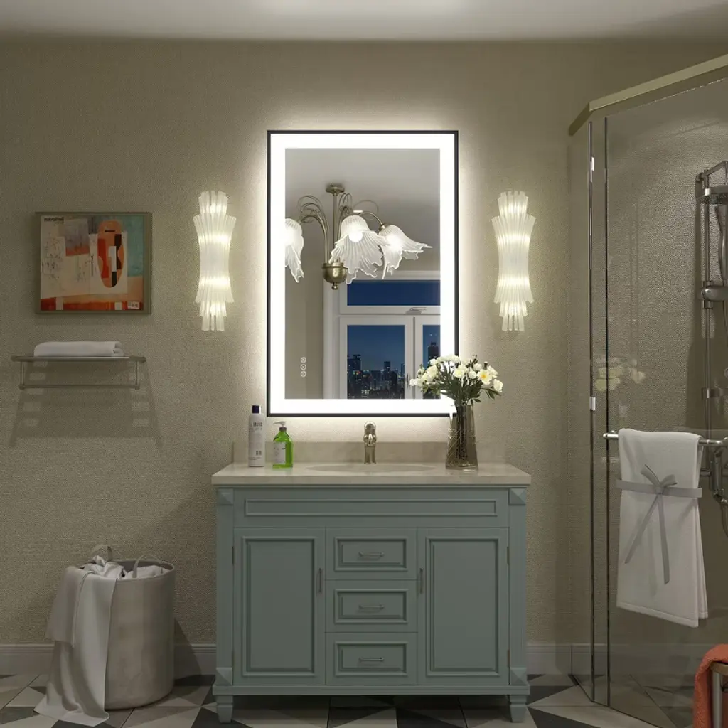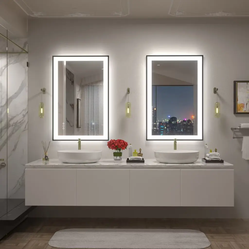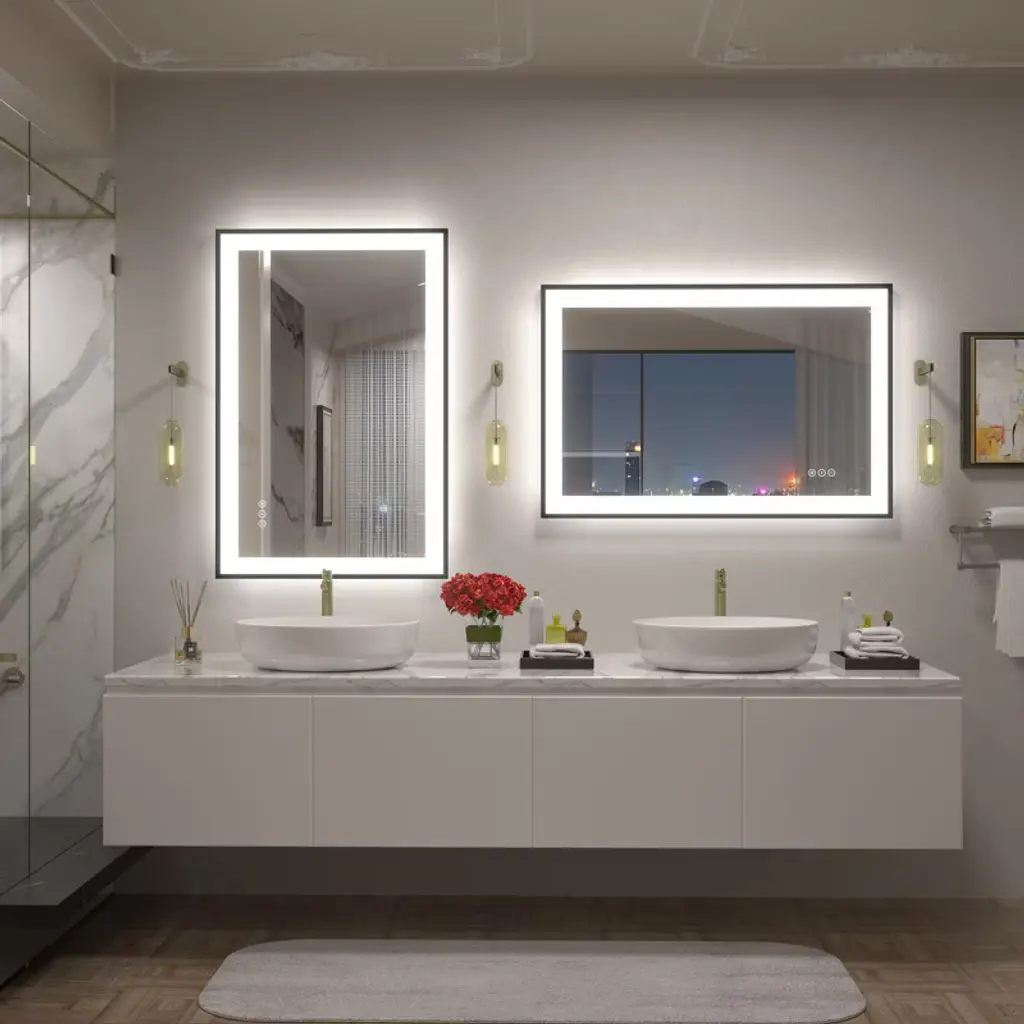 Upgrade your bath with this 3-year warranty LED framed mirror, featuring 24-volt output voltage super-bright real cri90+ 192 leds/m light strip (others are 12-volt low-power light strips, which are not bright enough.), high-strength & durable space aluminum frame and tempered glass material (almost unbreakable). 3 color temperature, brightness adjustment and anti-fog design to meet your smart needs. Sharp and sturdy frame designs can be matched with various decoration styles (modern, glam, industrial, farmhouse, rustic, etc.) and usage scenarios (bathroom, living room, bedroom, dressing room, hallway, aisle, etc.), highlighting the beauty of space.