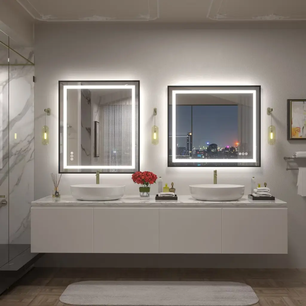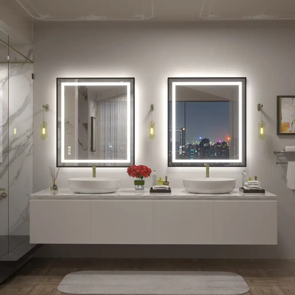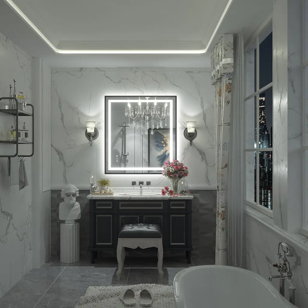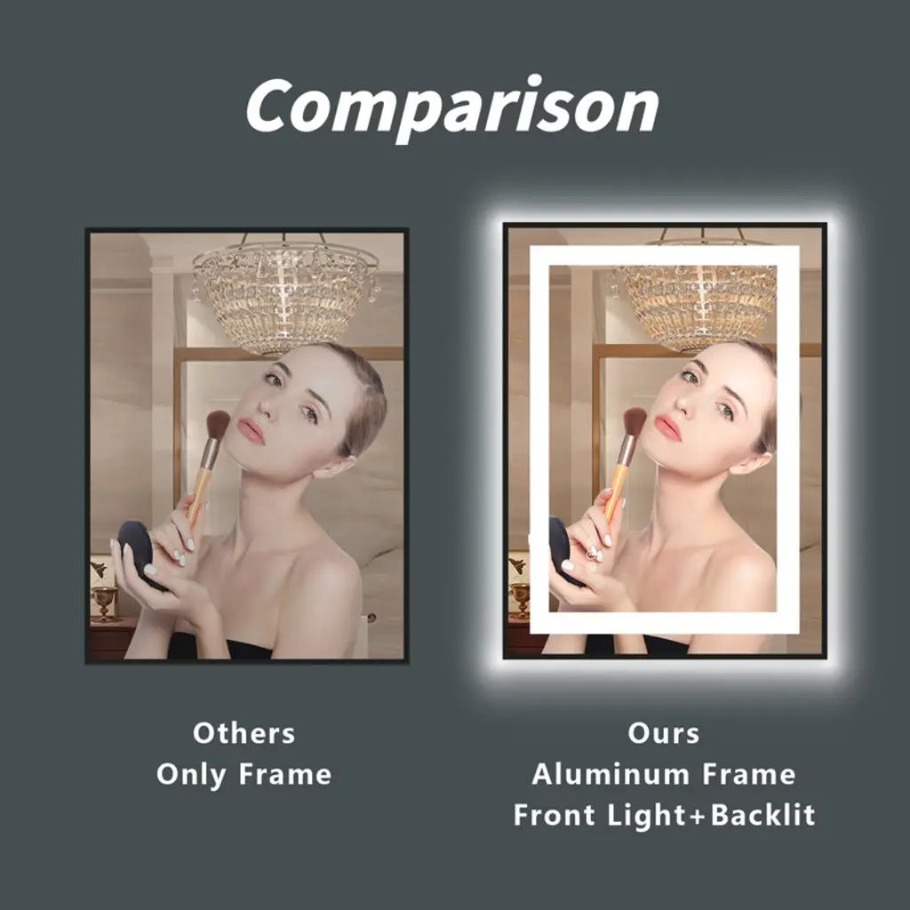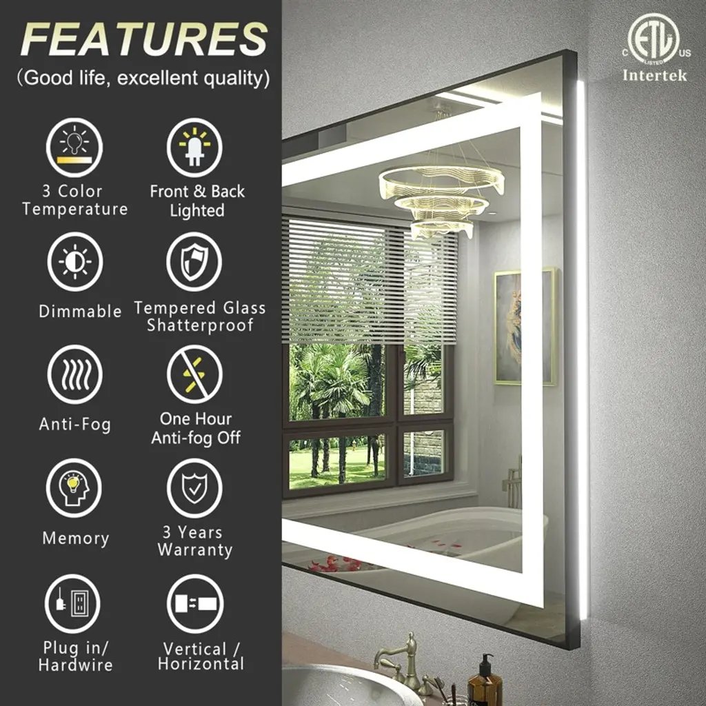 Upgrade your bath with this 3-year warranty LED framed mirror, featuring 24-volt output voltage super-bright real cri90+ 192 leds/m light strip (others are 12-volt low-power light strips, which are not bright enough.), high-strength & durable space aluminum frame and tempered glass material (almost unbreakable). 3 color temperature, brightness adjustment and anti-fog design to meet your smart needs. Sharp and sturdy frame designs can be matched with various decoration styles (modern, glam, industrial, farmhouse, rustic, etc.) and usage scenarios (bathroom, living room, bedroom, dressing room, hallway, aisle, etc.), highlighting the beauty of space.