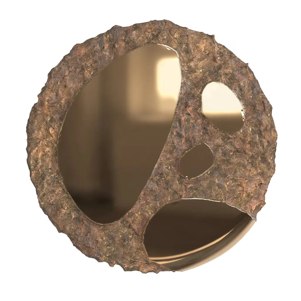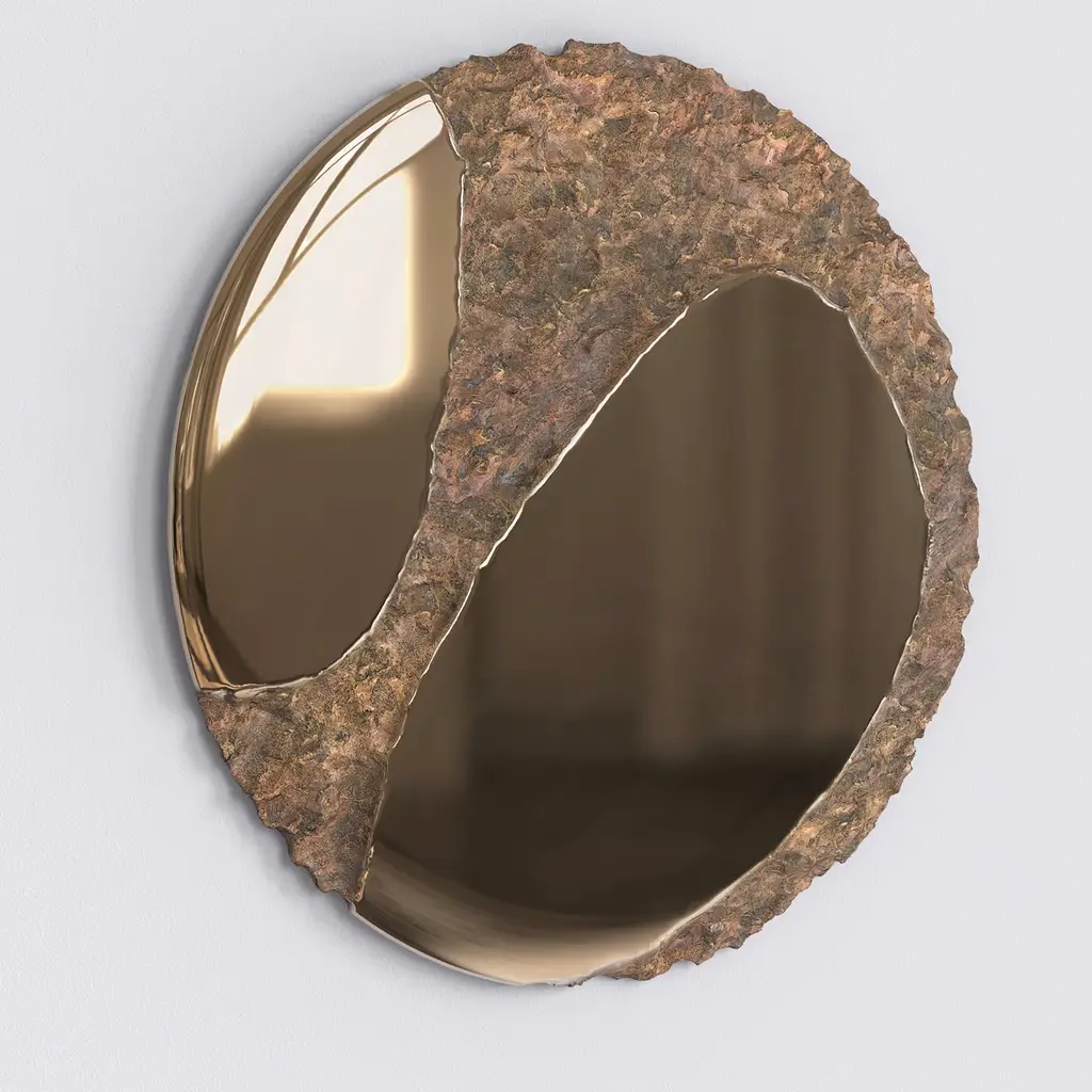 The Apollo sculptural wall mirror, crafted from cast bronze, tells a story of erosion and emergence. Its design contrasts mirror-polished areas with patinated, hollowed-out sections. Limited edition of 15+3, each piece features a numbered metal plaque for authenticity. Customization options are available, please contact the concierge for more information.