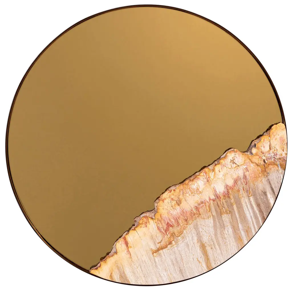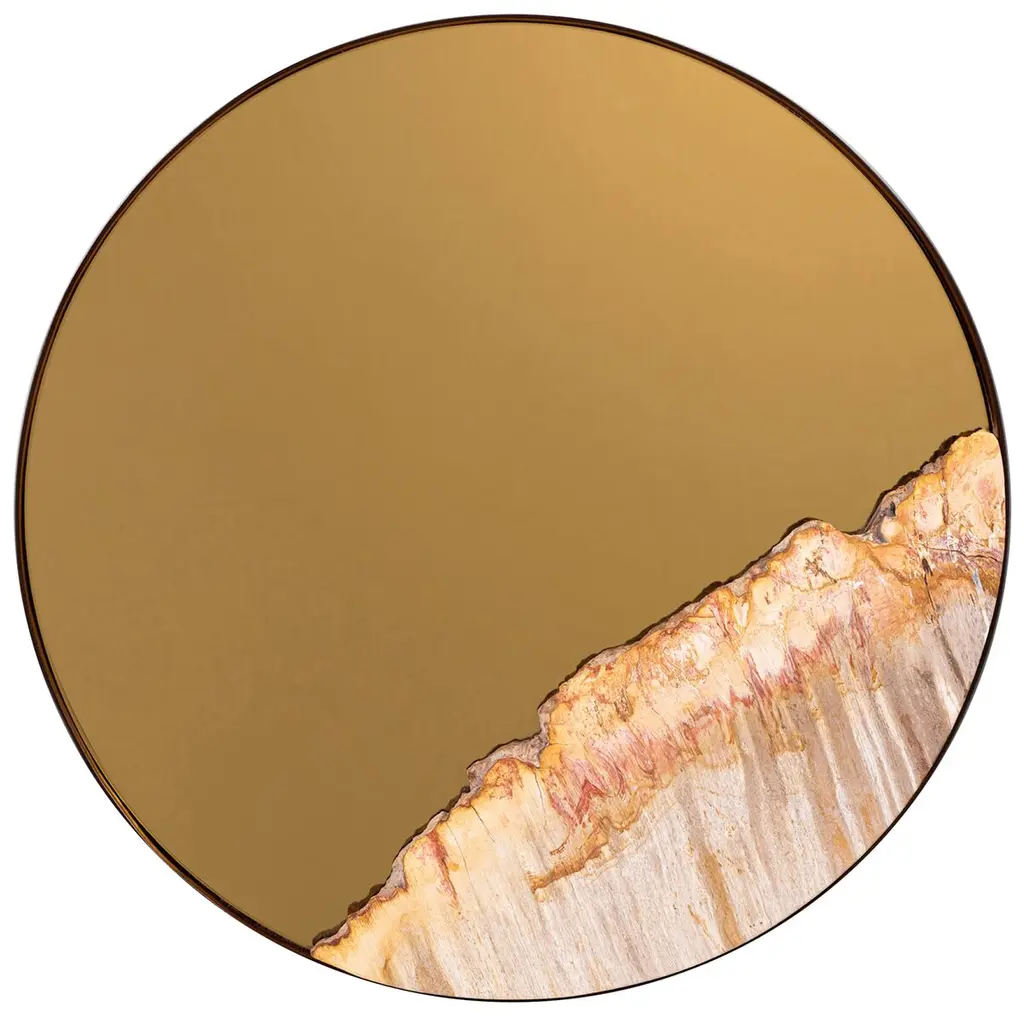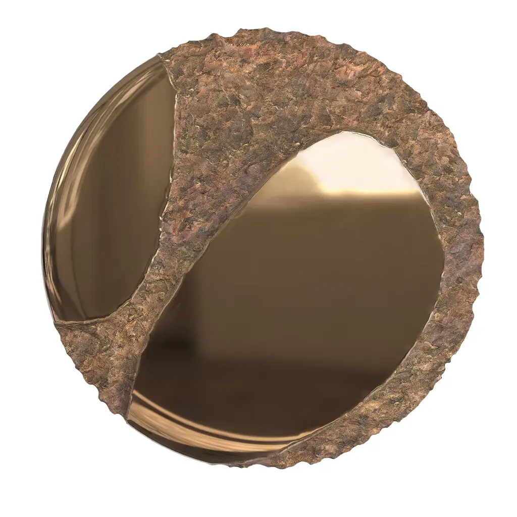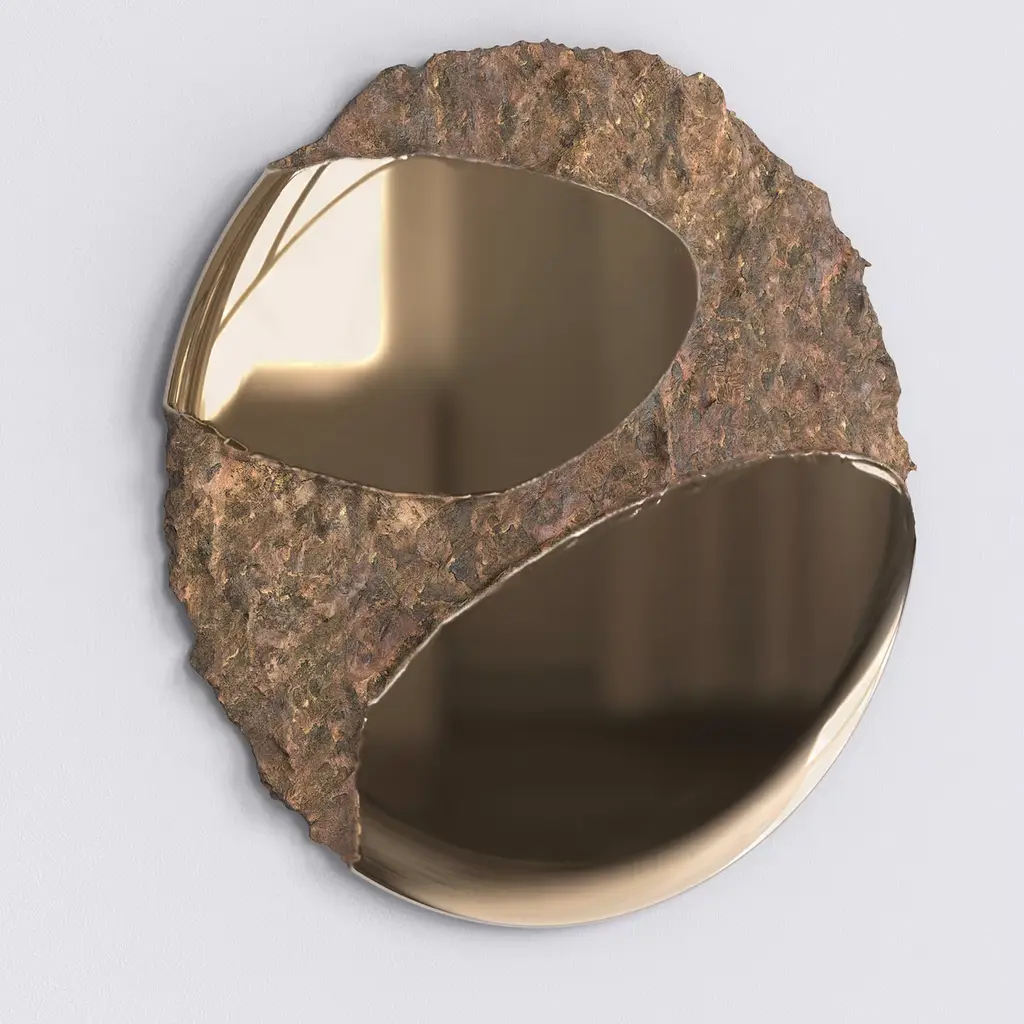 Apollo sculptural wall mirror, crafted from cast bronze, tells a story of erosion and emergence. Its design contrasts mirror-polished areas with patinated, hollowed-out sections. Limited edition of 15+3, each piece features a numbered metal plaque for authenticity. Customization options are available, please contact the concierge for more information.