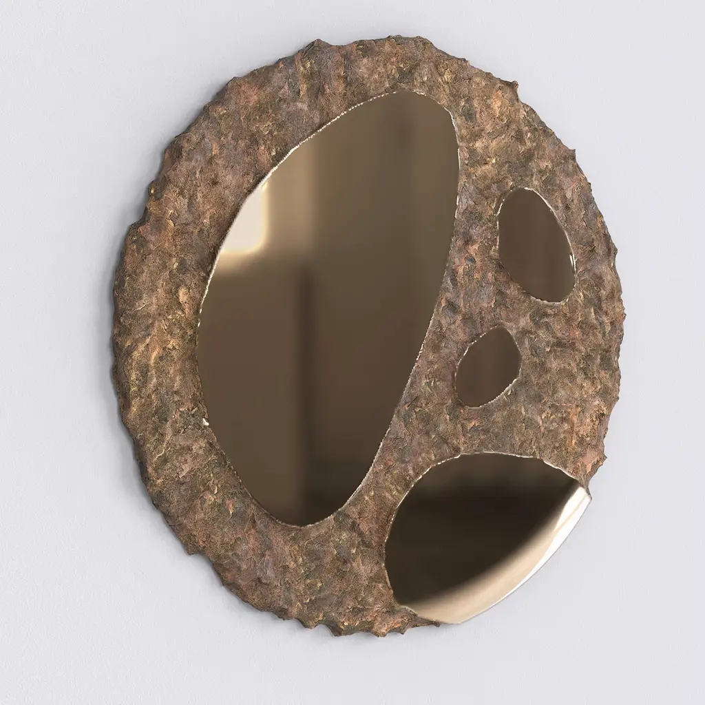 Apollo sculptural wall mirror, crafted from cast bronze, tells a story of erosion and emergence. Its design contrasts mirror-polished areas with patinated, hollowed-out sections. Limited edition of 15+3, each piece features a numbered metal plaque for authenticity. Customization options are available, please contact the concierge for more information.