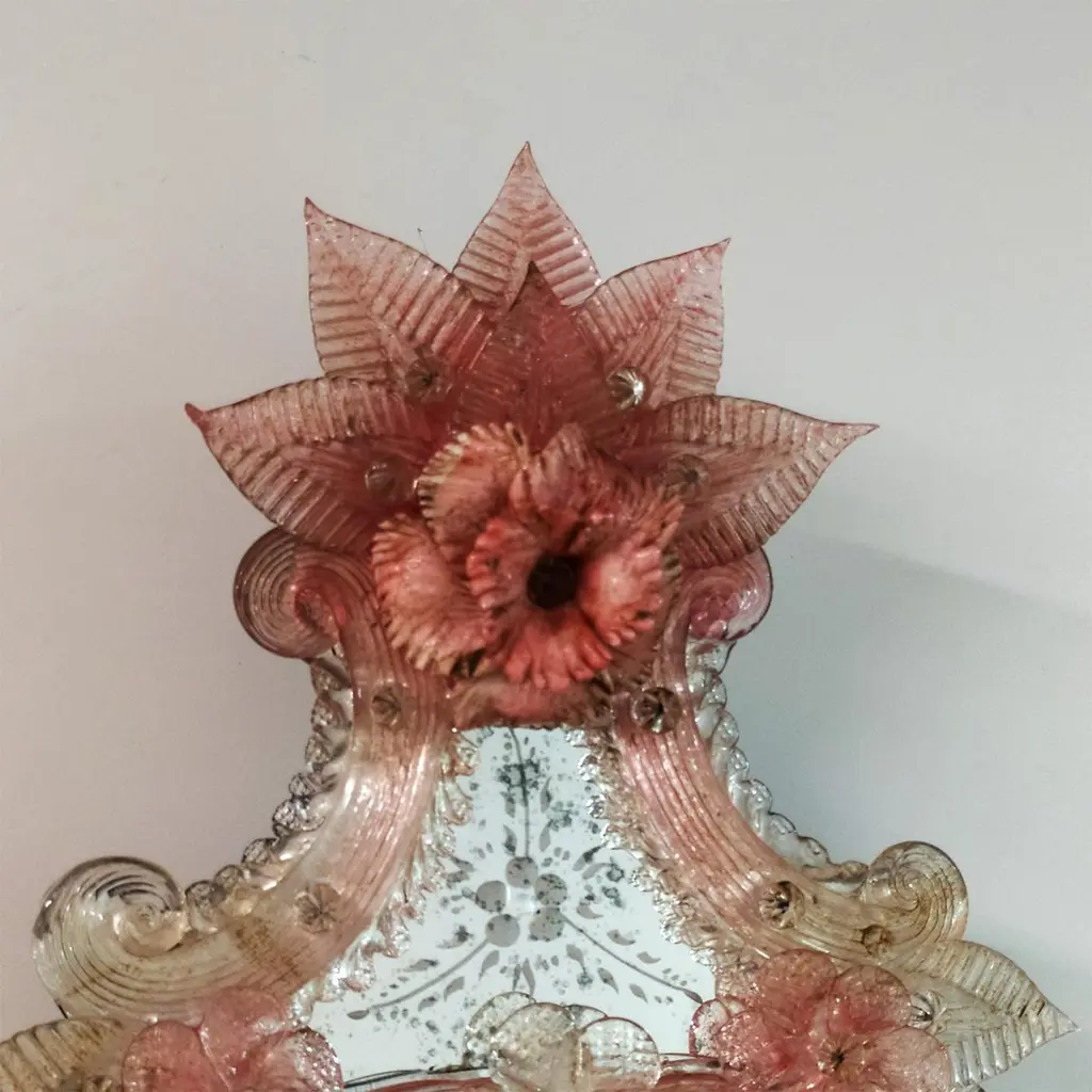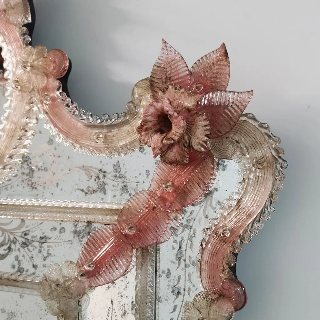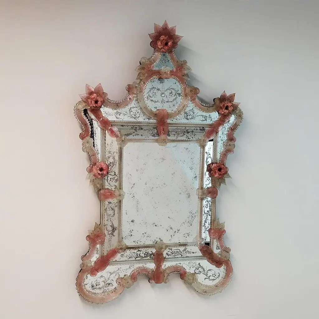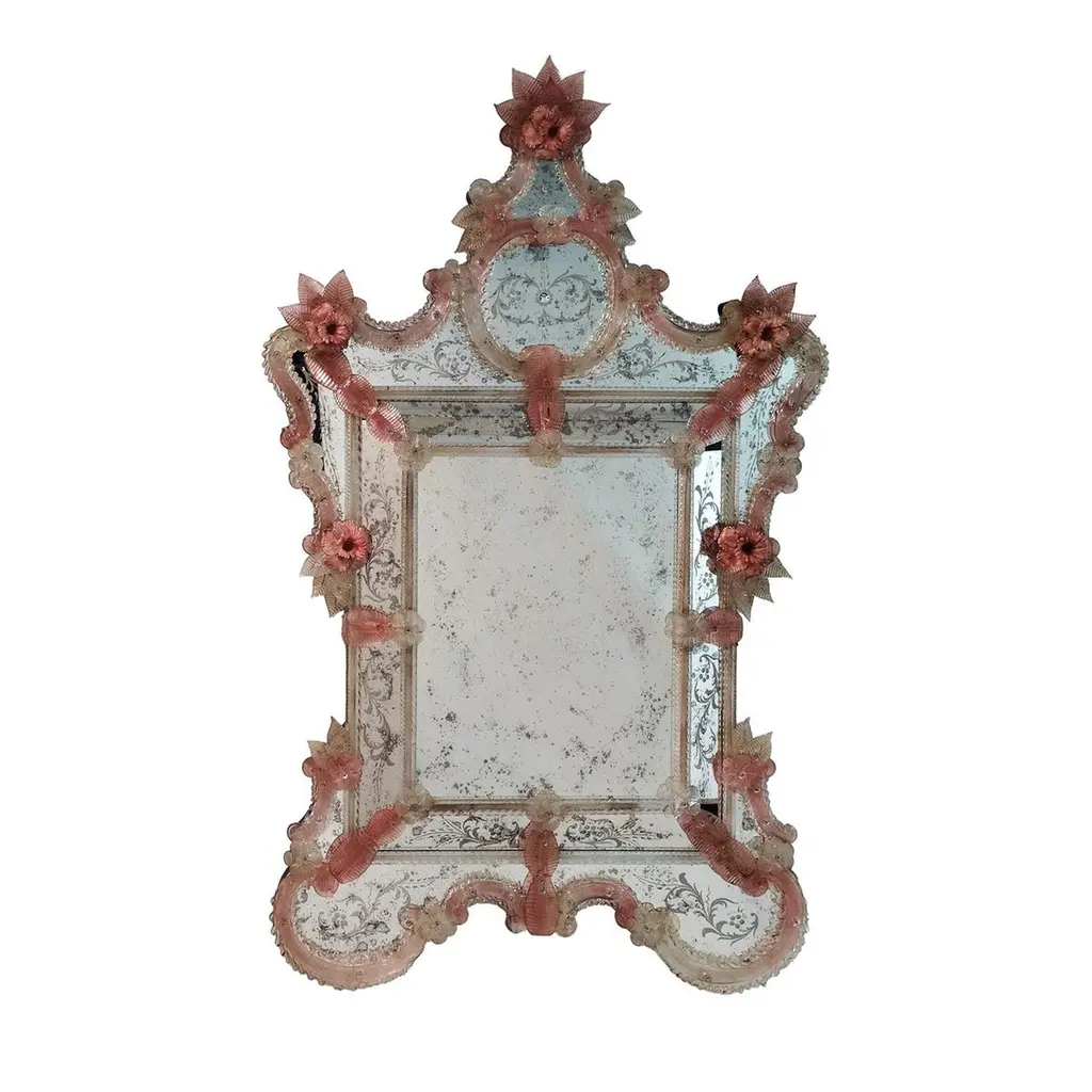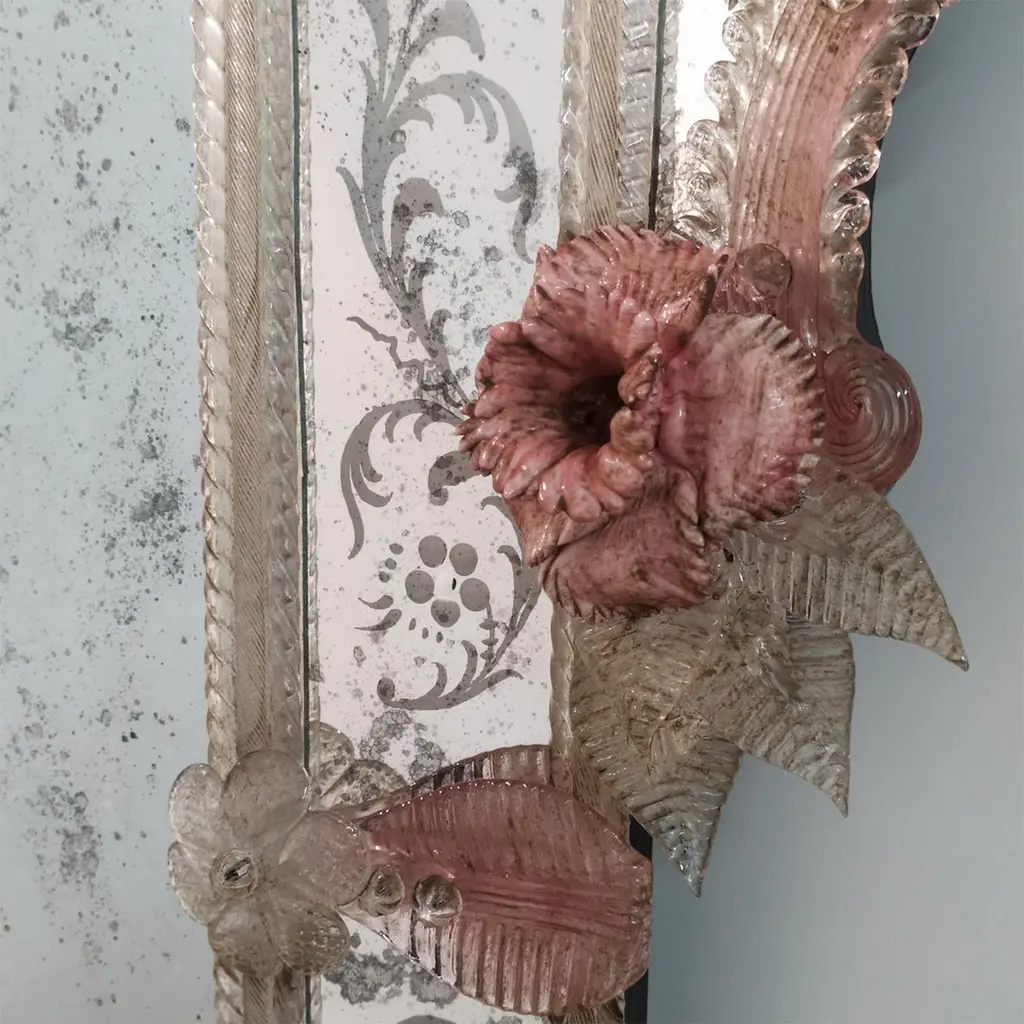 A masterpiece of Venetian elegance, this Murano glass mirror is a tribute to tradition and artistry. Hand-engraved with intricate floral motifs, its antique-finished glass is framed by soft pink Murano glass flowers, adding a romantic and delicate touch. Crafted by the renowned Fratelli Tosi, this timeless piece evokes the charm of a bygone era, making it the perfect statement for refined interiors seeking a touch of history and luxury.