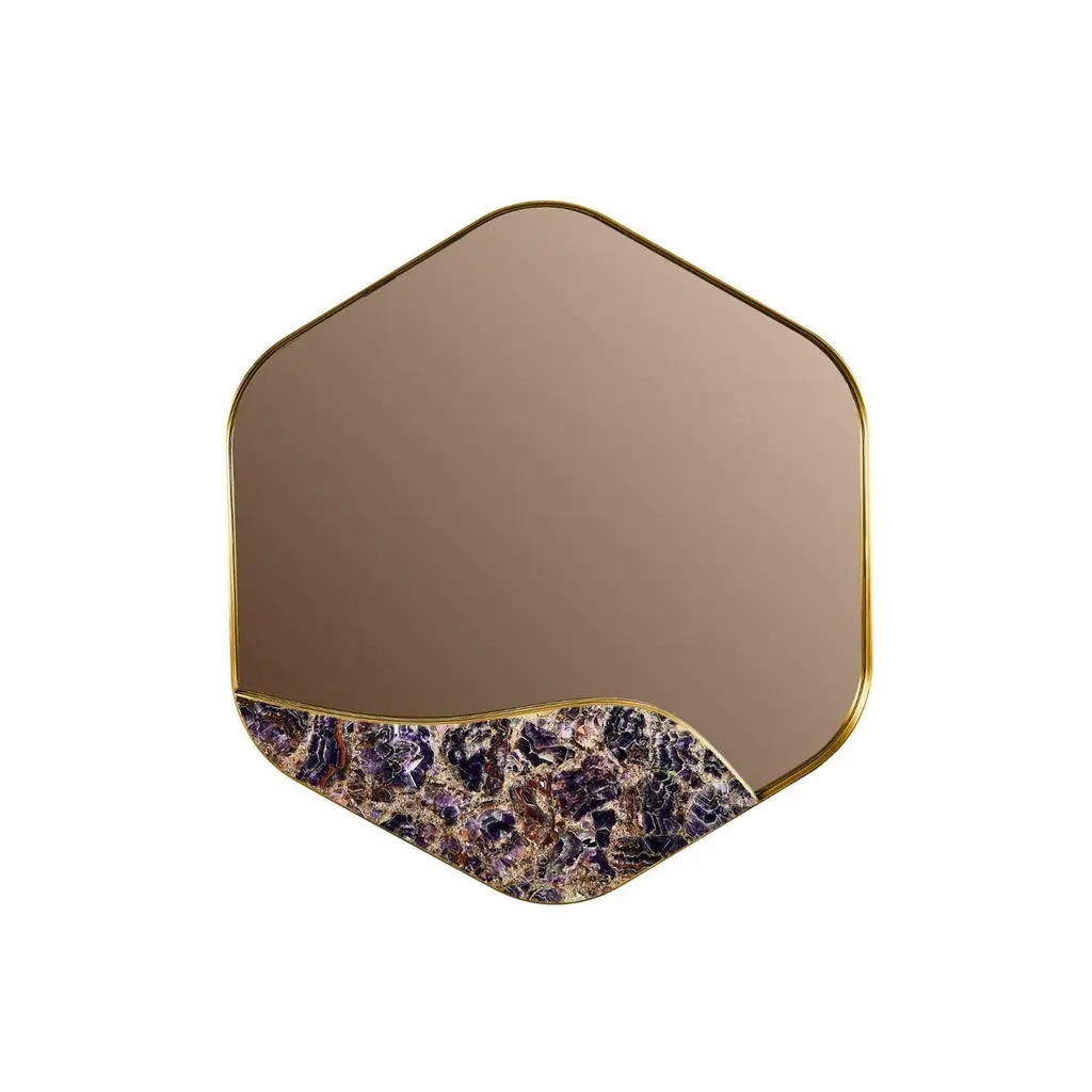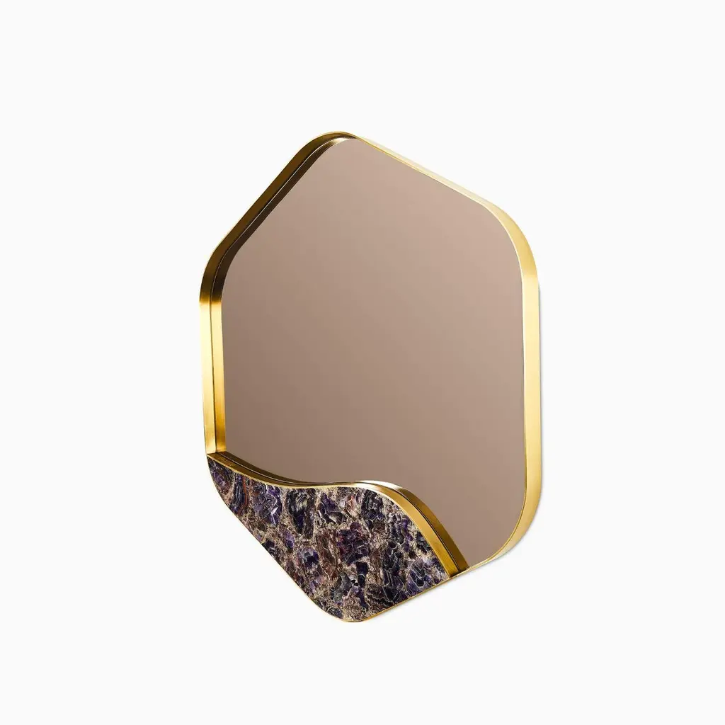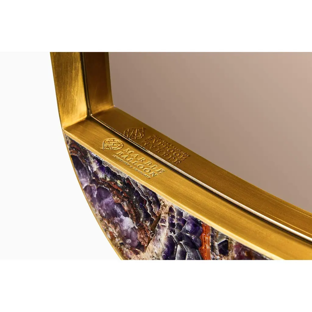 Aras mirror amethyst by Marble Balloon Dimensions: L 5cm x W 83.5cm x H 76.5cmMaterials: Brass, semi-precious amethyst stone.100% Brass material is used in the frame and semi-precious amethyst stone is used in the lower part.Marble Balloon is an interior design and high end furniture brand based in Istanbul. We are devoted to create refined and sophisticated designs bringing the premium quality materials and finest craftsmanship together. Adhering to a design philosophy cherishing organic and asymmetrical forms whilst challenging the nature of marbles implying fluidity, we incorporate only the extraordinary marbles and natural stones into our handcrafted and timeless creations.