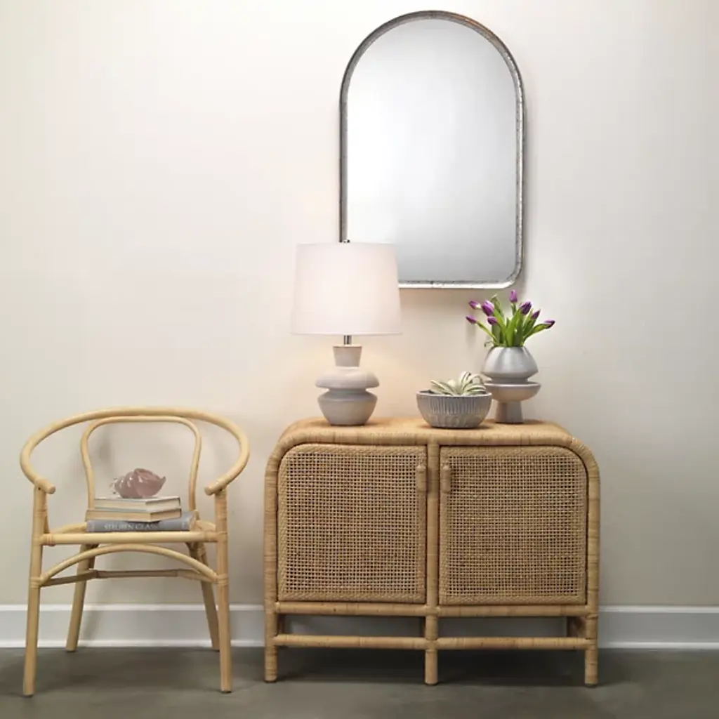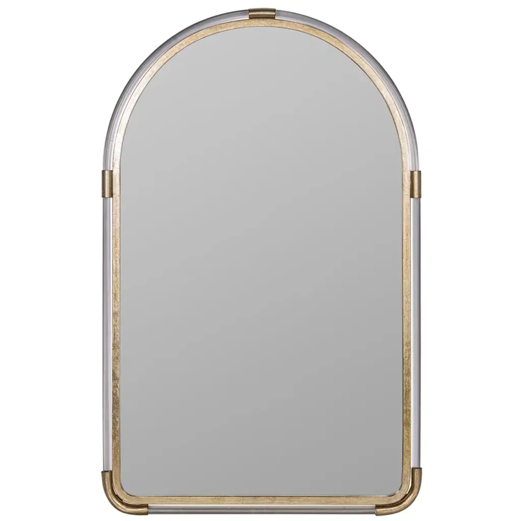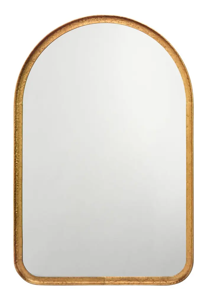 The Arch Mirror by Jamie Young Co. elevates the allure of the decorative mirror by infusing its metal frame with genuine iron leaf layers, meticulously applied to achieve a rustic aesthetic. With a commanding height of three feet, its fusion of architectural inspiration and sleek simplicity creates a striking statement piece that effortlessly captivates attention, adding a touch of refinement to any space.