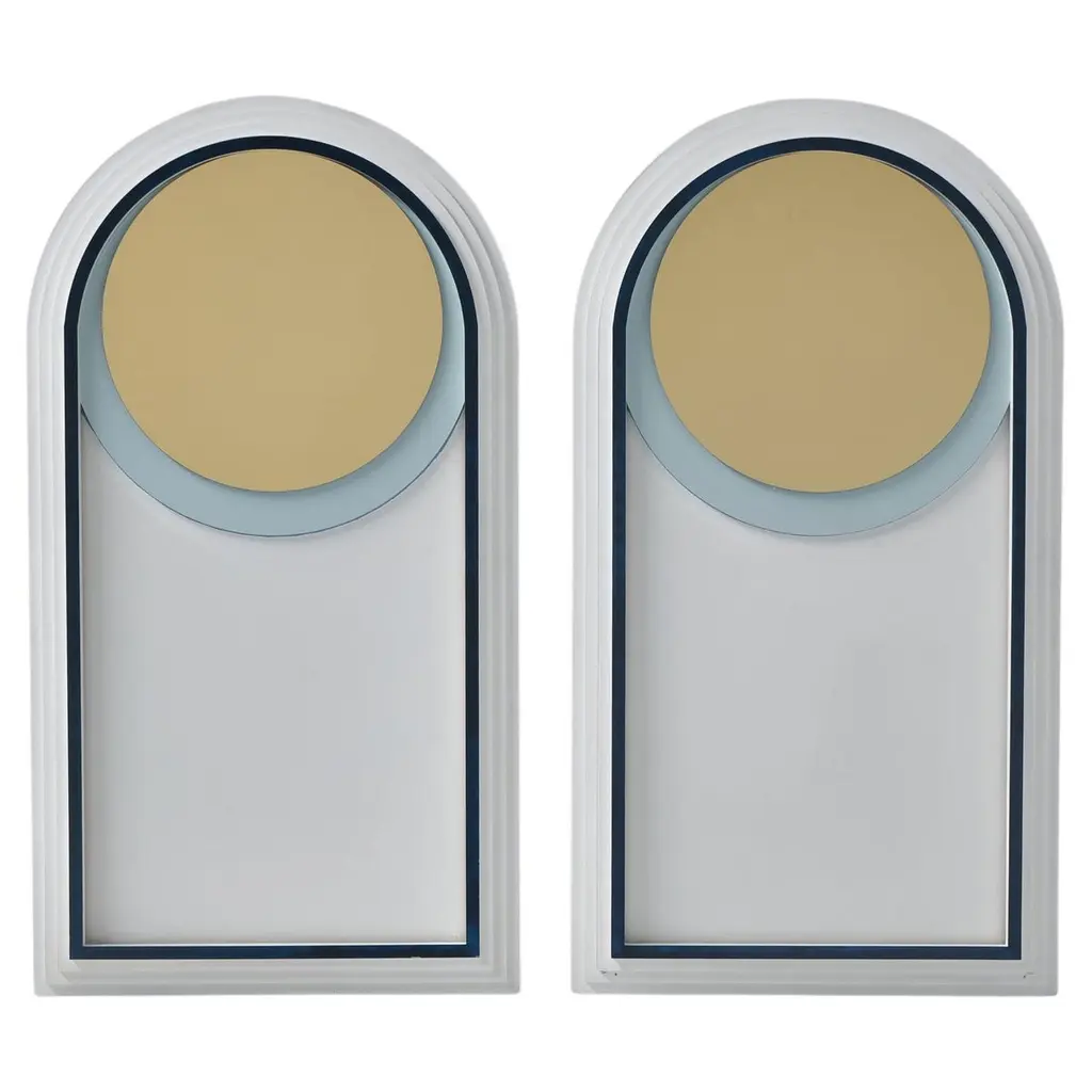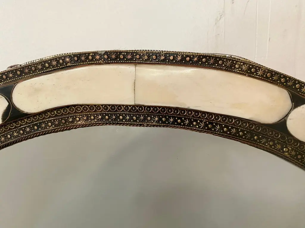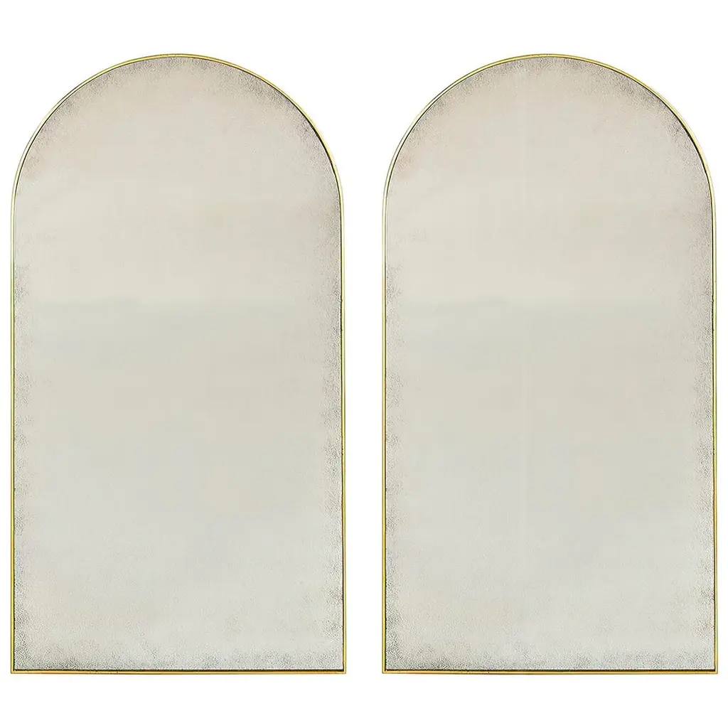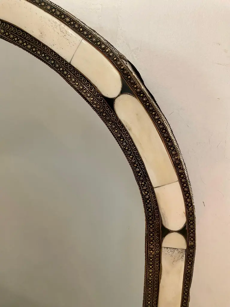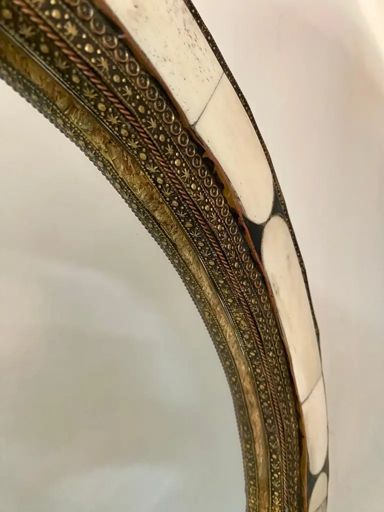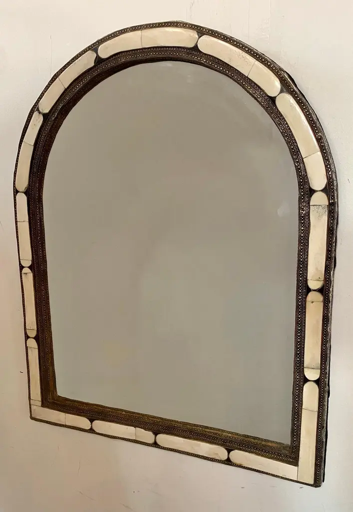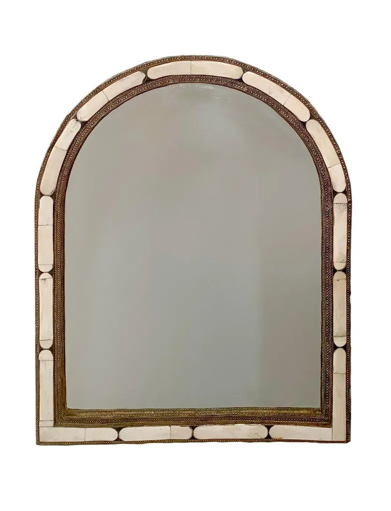 Arched Hollywood Regency White Camel Bone Mirror, a Pair A pair of arched white camel bone mirrors. With white camel bones inlaid into an elegant brass frame, this pair of handmade Hollywood Regency mirrors will complement any room and interior design.Dimensions: 29.5" H x 24" W x 0.75" D
