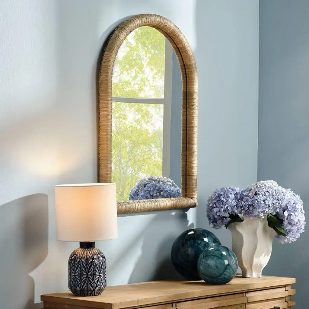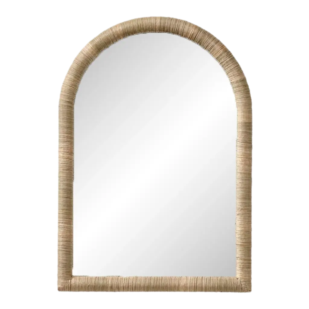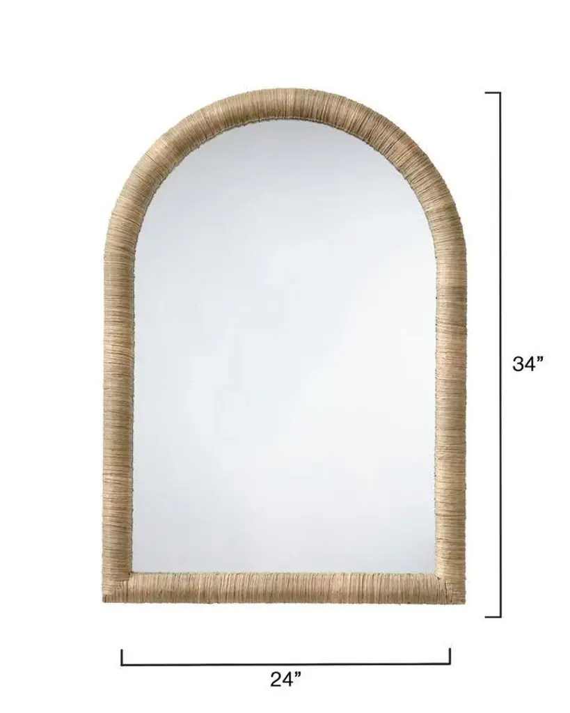 Hand-wrapped in sea grass, this arched mirror effortlessly enhances any casually refined décor with its light and bright presence. The unfinished natural material showcases a beautiful array of colors, adding unexpected depth to its neutral palette. The result is a charmingly refined piece that embodies tropical elegance. Hand-woven of 100% Natural Seagrass Non beveled glass mirror Hangs vertical only Natural Tone Will Vary Wall Mounted The inherent variations in tone and texture of natural Seagrass are preserved, to create pieces rich in detail and natural beauty. These unique imperfections give our products character and individuality, with each piece having its own personality. Mirror Surface: 31.5"H x 21.25"W 2 D- ring Hangers Frame: 2" W MDF Backing, Black Not Damp Rated Care Instructions: Wipe frame with a soft, dry, lint free cloth. Wipe glass with standard glass cleaner. Do not use cleaners or abrasives on mirror frame. Do not get frame wet or damp.