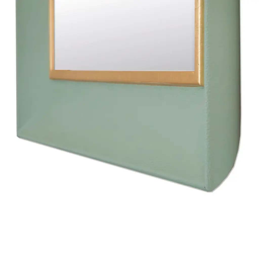 Showcasing a gorgeous pastel green shade enhanced with an inner rim coated with precious gold leaf, this stunning mirror will make a modern accent to a living room, bedroom, or entryway decor. Boasting a minimalist frame, it is dressed in fine and soft genuine grain leather rendered. Available in 13 colors, please check the Artemest catalog for details.