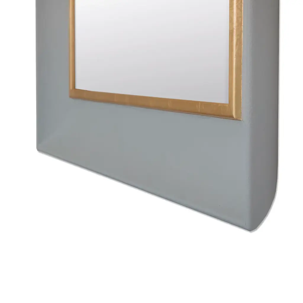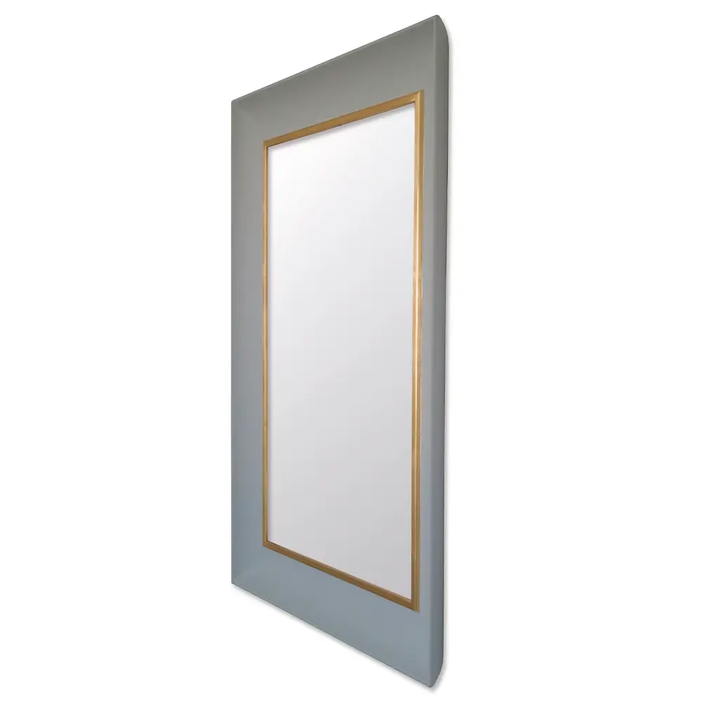 The different, splendid textures of metal and leather exquisitely merge in this contemporary mirror, a stunning modern accent to a living room, bedroom, or entryway. Its clean and minimalist frame is dressed in fine and soft genuine grain leather colored in light blue, and the internal frame is embellished with a gold-leaf trim. Available in 13 colors, please check the Artemest catalog for details.
