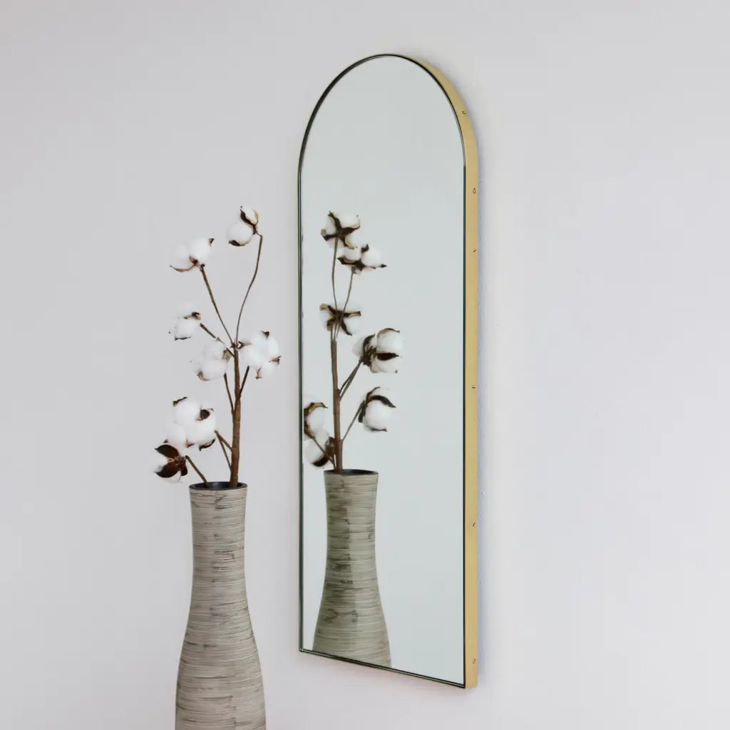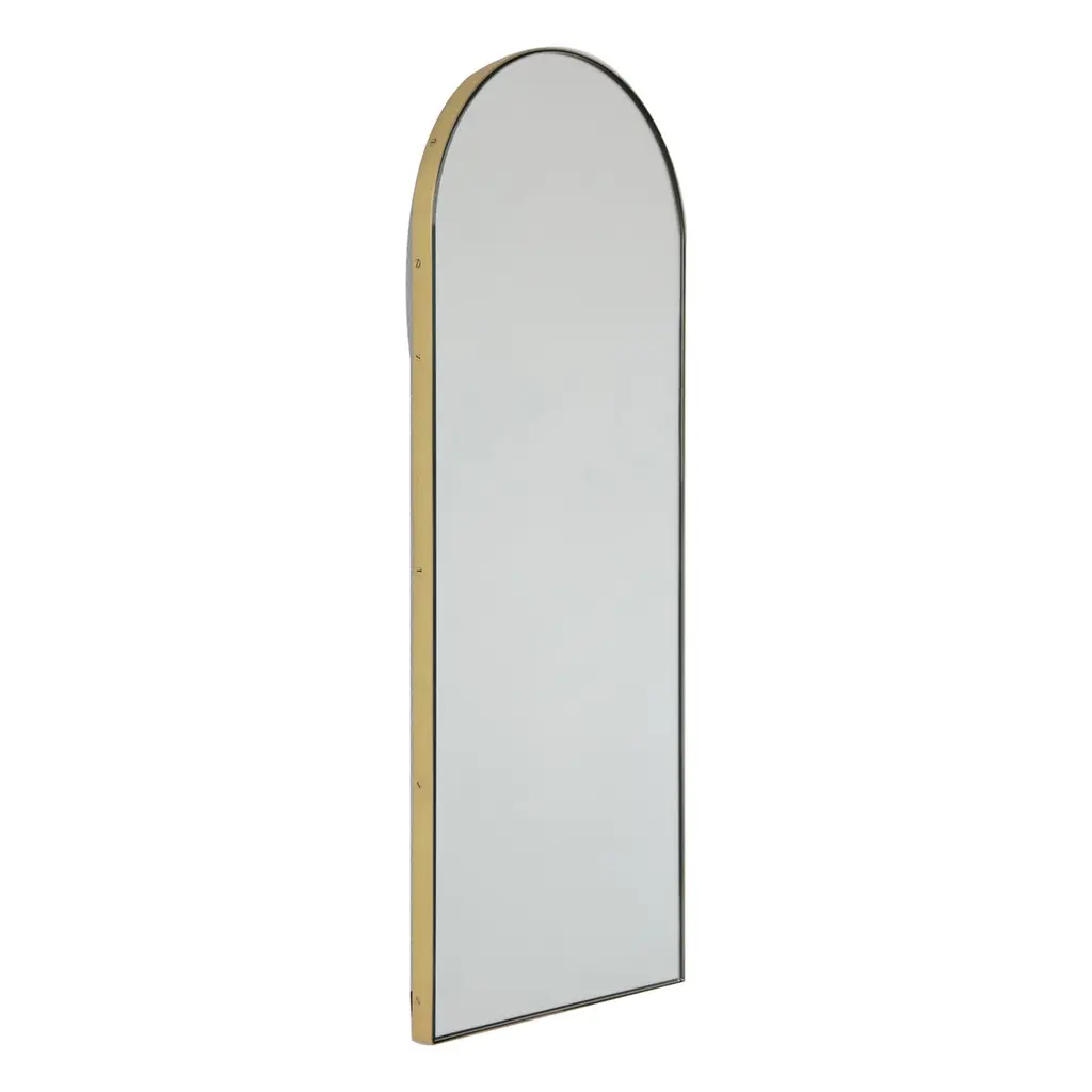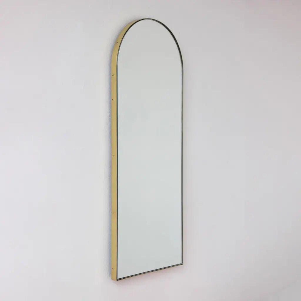 Modern Arcus™ arch shaped mirror with a minimalist solid brushed brass frame. Designed and handcrafted in London, UK.Our mirrors are designed with an integrated French cleat (split batten) system that ensures the mirror is securely mounted flush with the wall. An alternative hanging hook or a Z-bar (depending on the size of the mirror) is available on demand for mirrors that need to be installed allowing some separation from the wall.This mirror is fully customisable. The mirror in the images illustrates a small size, measuring 27cm x 68cm x 0.6cm / 26.8'' x 10.6'' x 0.24’’Shipped safely and insured worldwide. All our mirrors are made on demand. Fabrication lead time for this particular mirror is approximately 4 to 5 weeks. Our mirrors are always shipped by courier express. Shipping via courier express typically requires 1 to 2 days to the UK, or 2 to 7 days outside the UK depending on the destination. Available in the following sizes:Small: 27cm x 68cm x 1.8cm / 10.6" x 26.8" x 0.71"Medium: 37cm x 56cm x 1.8cm / 14.6" x 22" x 0.71"Large: 46cm x 71cm x 1.8cm / 18.1" x 28" x 0.71"Extra Large: 48cm x 97cm x 1.8cm / 18.9" x 38.2" x 0.71"or any bespoke dimension. Available options:- bevelling - back-illumination creating a halo effect - demister padPlease contact us for a quote for any bespoke specifications or added options.ORDERS OF MULTIPLE MIRRORS OF THE SAME TYPE: Please contact us to receive a Packing and Shipping quote when ordering multiple mirrors of the same type. An order for multiple mirrors of the same type may not be accepted without extra packing and shipping fees. Thank you.