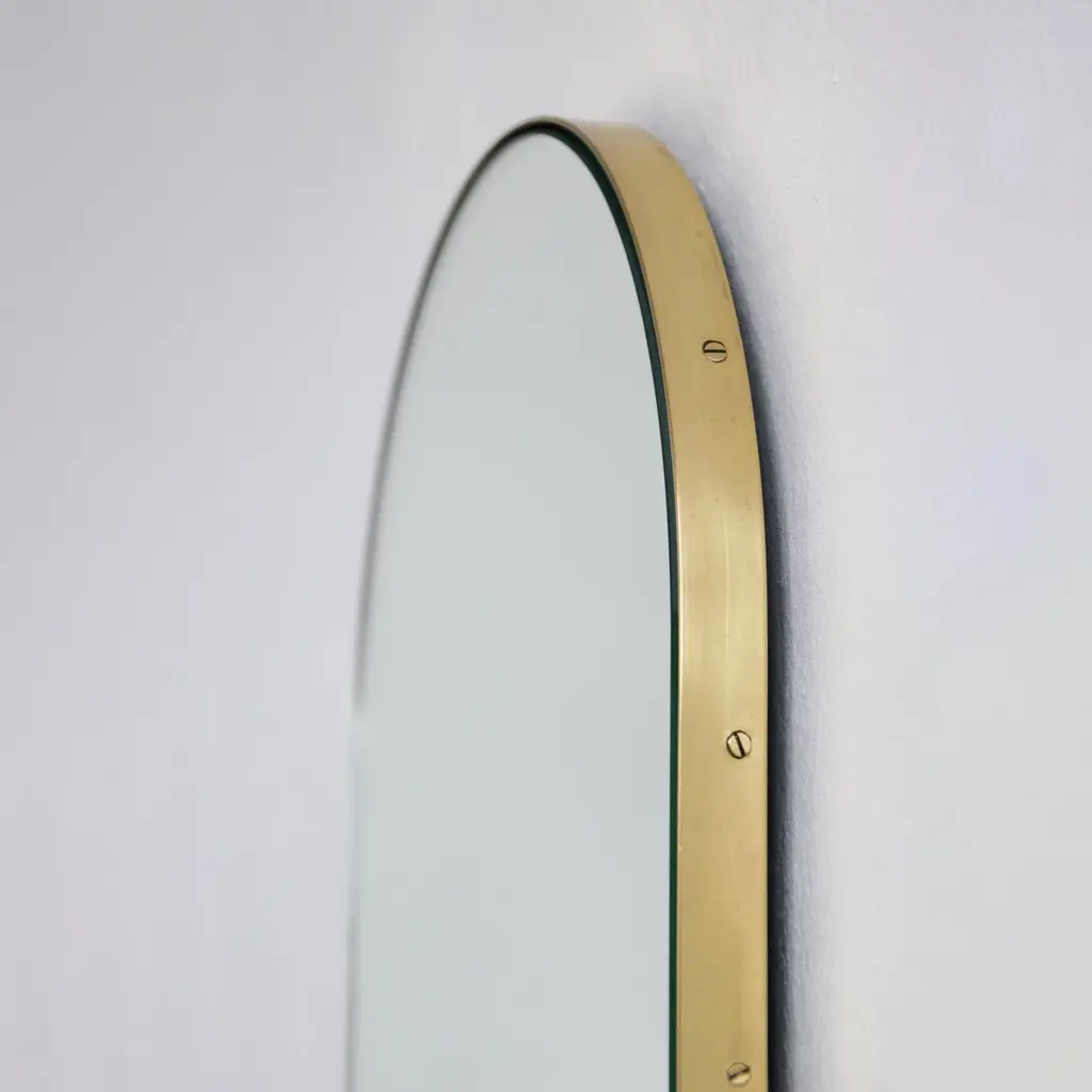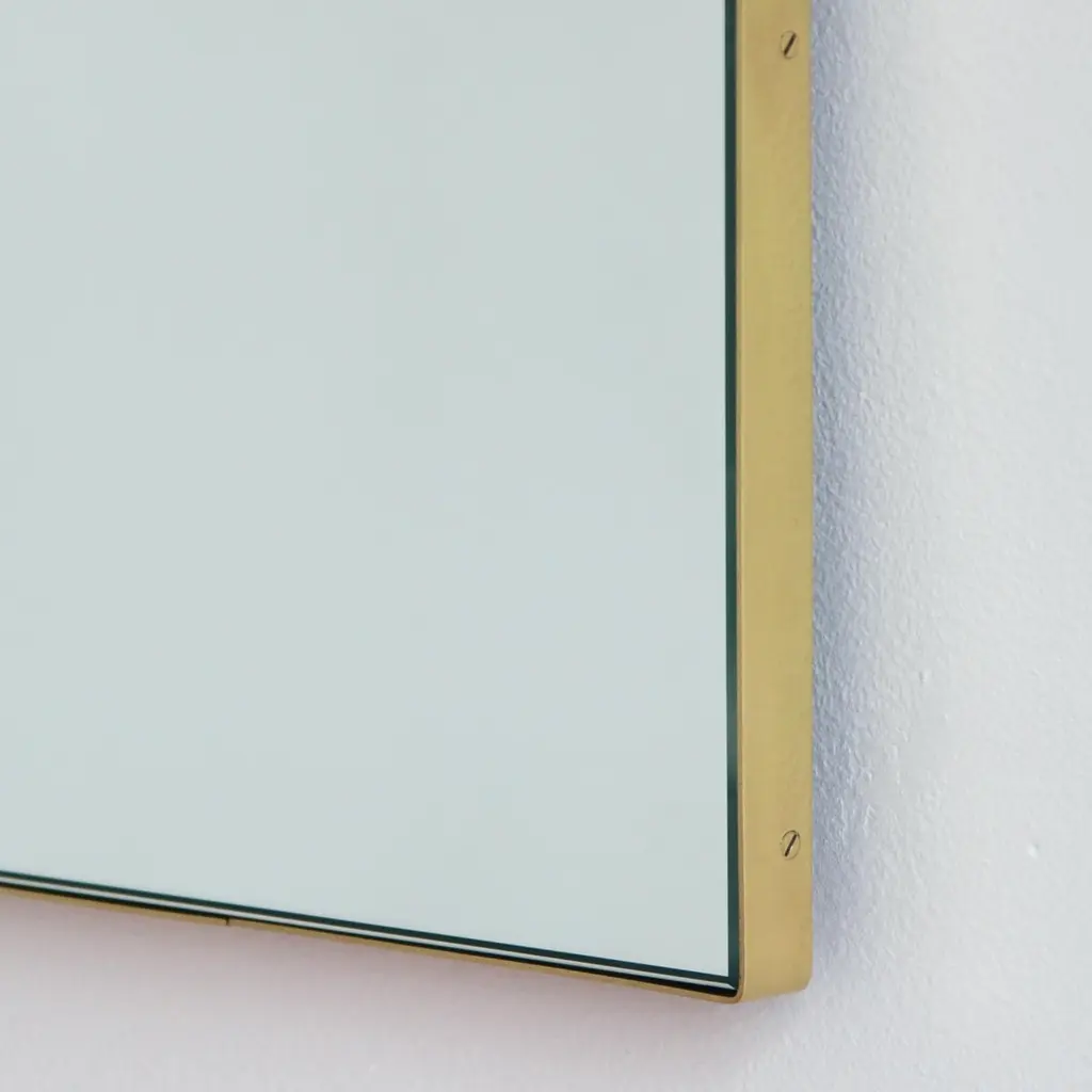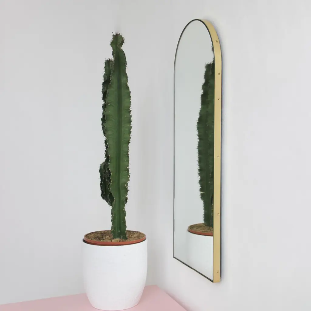 Modern Arcus™ arch shaped mirror with a minimalist solid brushed brass frame. Designed and handcrafted in London, UK.Our mirrors are designed with an integrated French cleat (split batten) system that ensures the mirror is securely mounted flush with the wall. An alternative hanging hook or a Z-bar (depending on the size of the mirror) is available on demand for mirrors that need to be installed allowing some separation from the wall.This mirror is fully customisable. The mirror in the images illustrates a small size, measuring 27cm x 68cm x 0.6cm / 26.8'' x 10.6'' x 0.24’’Shipped safely and insured worldwide. All our mirrors are made on demand. Fabrication lead time for this particular mirror is approximately 4 to 5 weeks. Our mirrors are always shipped by courier express. Shipping via courier express typically requires 1 to 2 days to the UK, or 2 to 7 days outside the UK depending on the destination. Available in the following sizes:Small: 27cm x 68cm x 1.8cm / 10.6" x 26.8" x 0.71"Medium: 37cm x 56cm x 1.8cm / 14.6" x 22" x 0.71"Large: 46cm x 71cm x 1.8cm / 18.1" x 28" x 0.71"Extra Large: 48cm x 97cm x 1.8cm / 18.9" x 38.2" x 0.71"or any bespoke dimension. Available options:- bevelling - back-illumination creating a halo effect - demister padPlease contact us for a quote for any bespoke specifications or added options.ORDERS OF MULTIPLE MIRRORS OF THE SAME TYPE: Please contact us to receive a Packing and Shipping quote when ordering multiple mirrors of the same type. An order for multiple mirrors of the same type may not be accepted without extra packing and shipping fees. Thank you.