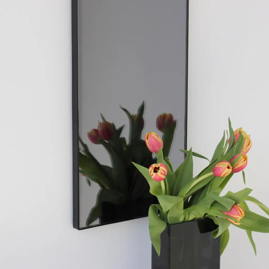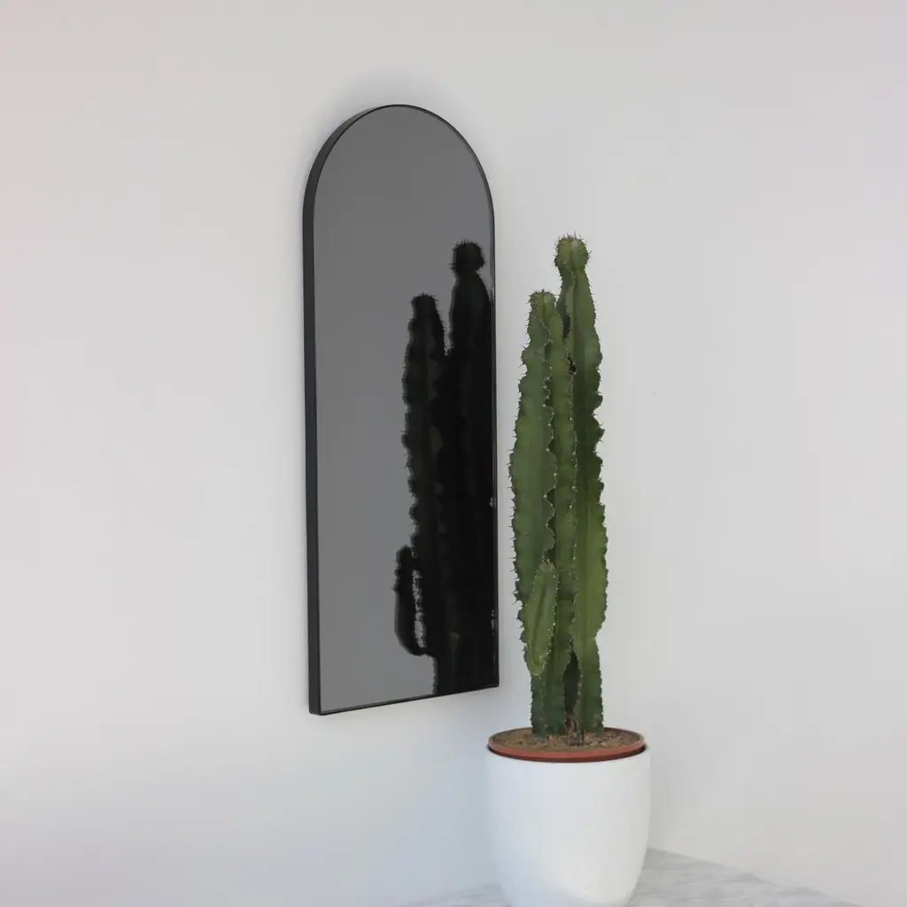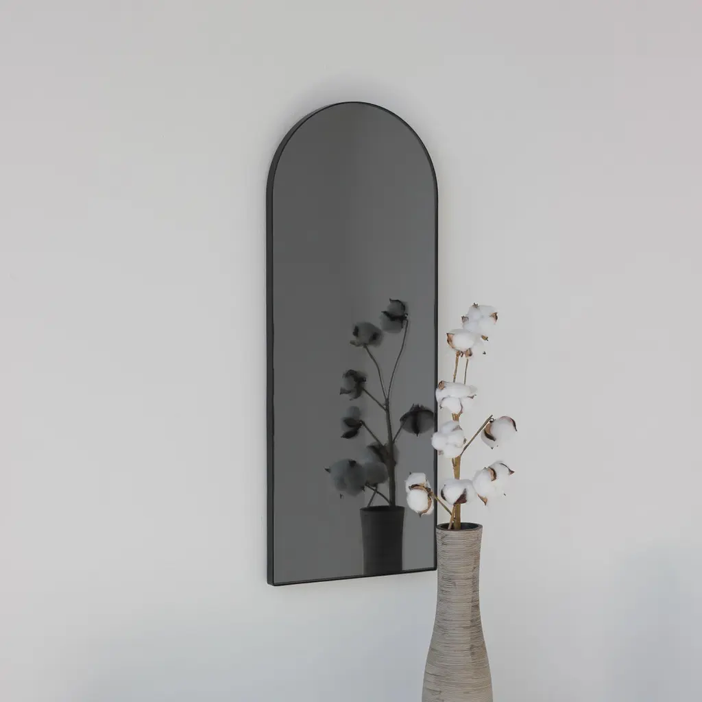 Contemporary arch shaped black tinted mirror with an elegant black frame. Designed and handcrafted in London, UK.Our mirrors are designed with an integrated French cleat (split batten) system that ensures the mirror is securely mounted flush with the wall. An alternative hanging hook or a Z-bar (depending on the size of the mirror) is available on demand for mirrors that need to be installed allowing some separation from the wall.This mirror is fully customisable.The mirror in the images illustrates a small size, measuring 27cm x 68cm x 1.8cm / 10.6in x 26.8in x 0.71inShipped safely and insured worldwide. All our mirrors are made on demand. Fabrication lead time for this particular mirror is approximately 4 to 5 weeks. Our mirrors are always shipped by courier express. Shipping via courier express typically requires 1 to 2 days to the UK, or 2 to 7 days outside the UK depending on the destination.Available in the following sizes:Small: 27cm x 68cm x 1.8cm / 10.6'' x 26.8'' x 0.71’’Medium: 37cm x 56cm x 1.8cm / 14.6'' x 22" x 0.71’’Large: 46cm x 71cm x 1.8cm / 18.1'' x 28" x 0.71’’Extra Large: 48cm x 97cm x 1.8cm / 18.9" x 38.2" x 0.71’’or any bespoke dimensions.Available options:- frame depth: 18mm / 0.71’’, 24mm / 0.94’’ and 30mm / 1.18’’- frame finish: brass (brushed, polished or with a bronze patina), copper, stainless steel, blackened stainless steel, or in a variety of colours- mirror tint: silver, bronze, black, rose gold / peach, blue or green- bevelling- back-illumination creating a halo effect- demister padPlease contact us for a quote for any bespoke specification or added options.ORDERS OF MULTIPLE MIRRORS OF THE SAME TYPE: Please contact us to receive a Packing and Shipping quote when ordering multiple mirrors of the same type. An order for multiple mirrors of the same type may not be accepted without extra packing and shipping fees. Thank you.