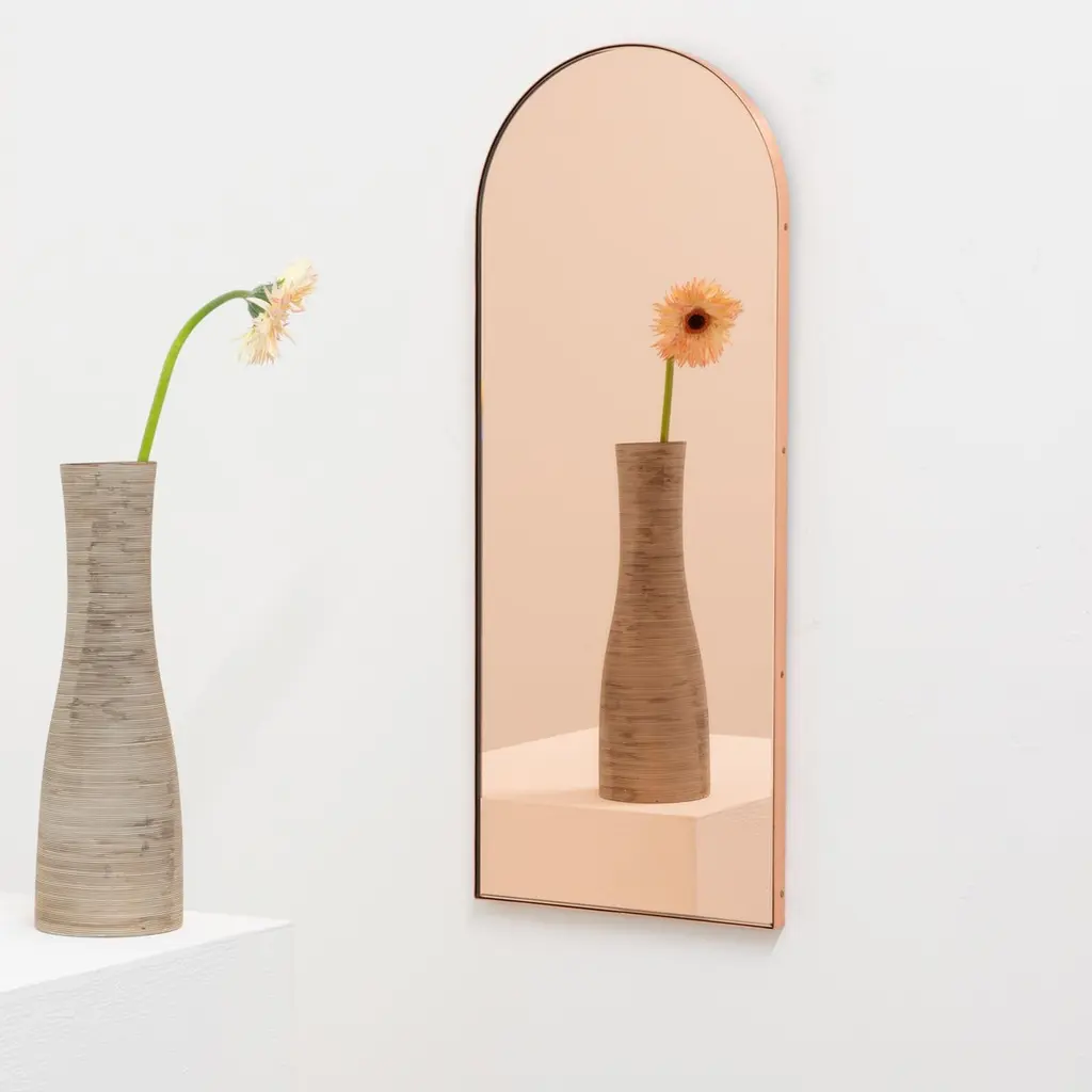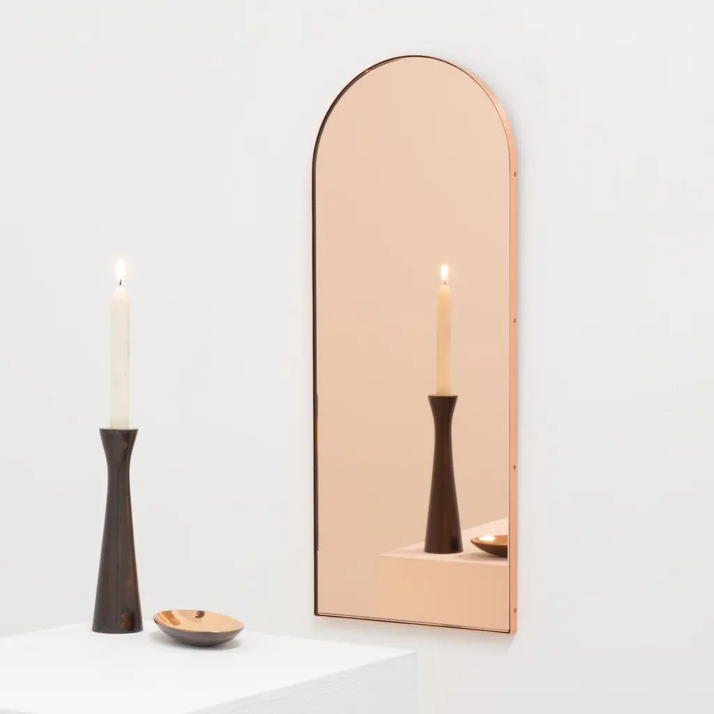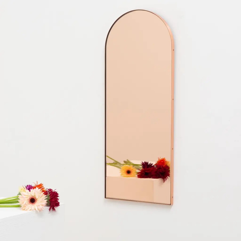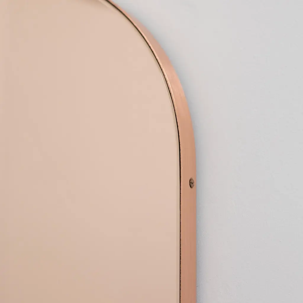Contemporary arch shaped rose gold / peach mirror with an elegant solid brushed copper frame. Designed and handcrafted in London, UK.Our mirrors are designed with an integrated French cleat (split batten) system that ensures the mirror is securely mounted flush with the wall. An alternative hanging hook or a Z-bar (depending on the size of the mirror) is available on demand for mirrors that need to be installed allowing some separation from the wall.This mirror is fully customisable. The mirror in the images illustrates a small size, measuring 27cm x 68cm x 1.8cm / 10.6" x 26.8" x 0.71"Shipped safely and insured worldwide. All our mirrors are made on demand. Fabrication lead time for this particular mirror is approximately 4 to 5 weeks. Our mirrors are always shipped by courier express. Shipping via courier express typically requires 1 to 2 days to the UK, or 2 to 7 days outside the UK depending on the destination.Available in the following sizes:Small: 27cm x 68cm x 1.8cm / 10.6" x 26.8" x 0.71"Medium: 37cm x 56cm x 1.8cm / 14.6" x 22" x 0.71"Large: 46cm x 71cm x 1.8cm / 18.1" x 28" x 0.71"Extra Large: 48cm x 97cm x 1.8cm / 18.9" x 38.2" x 0.71"or any bespoke dimension. Available options:- bevelling- back-illumination creating a halo effect- demister pad Please contact us for a quote for any bespoke specifications or added options.ORDERS OF MULTIPLE MIRRORS OF THE SAME TYPE: Please contact us to receive a Packing and Shipping quote when ordering multiple mirrors of the same type. An order for multiple mirrors of the same type may not be accepted without extra packing and shipping fees. Thank you.