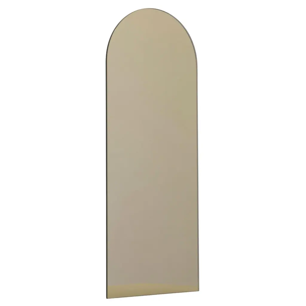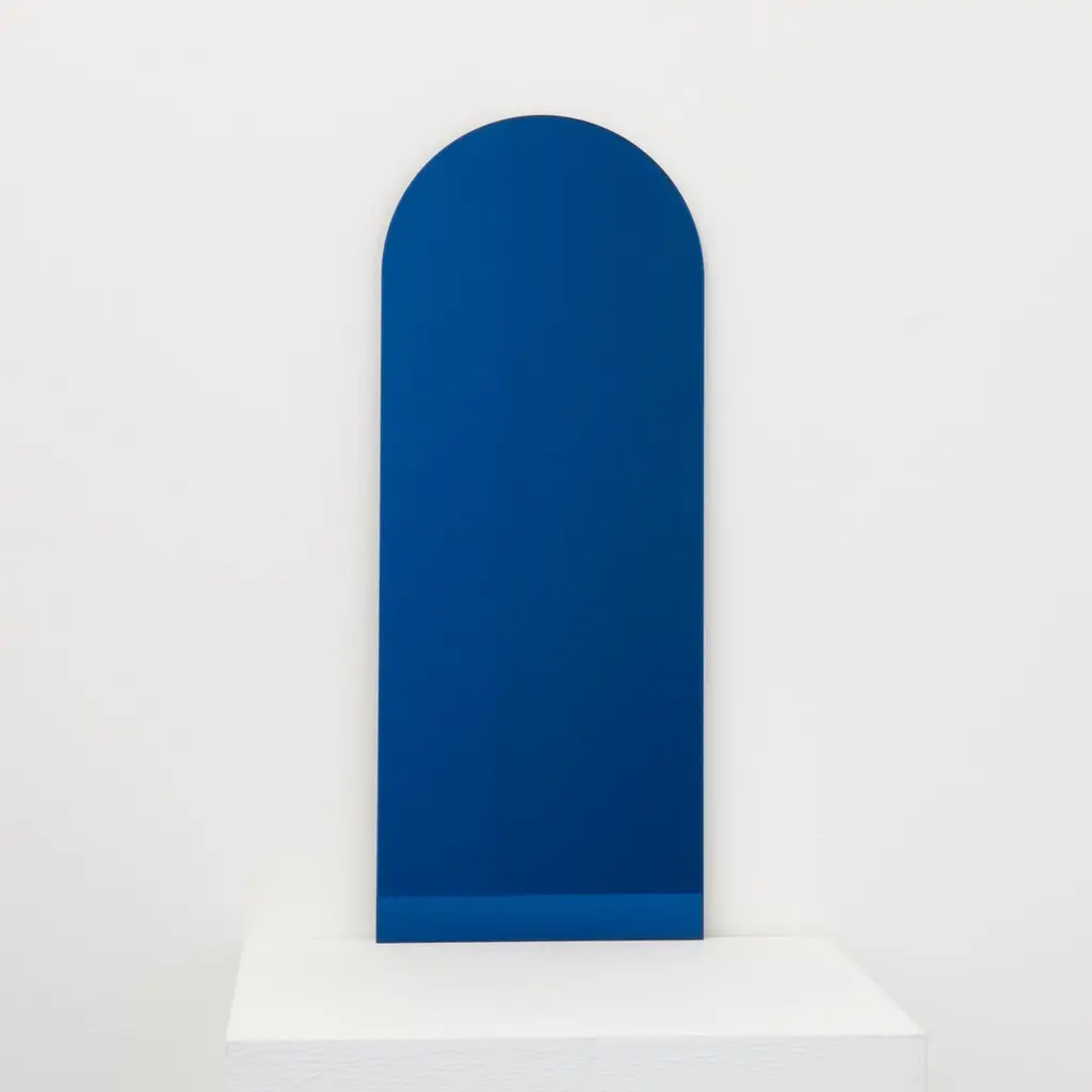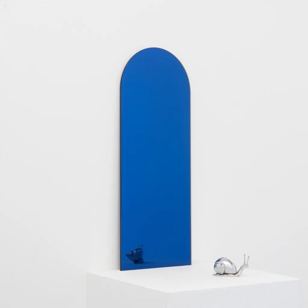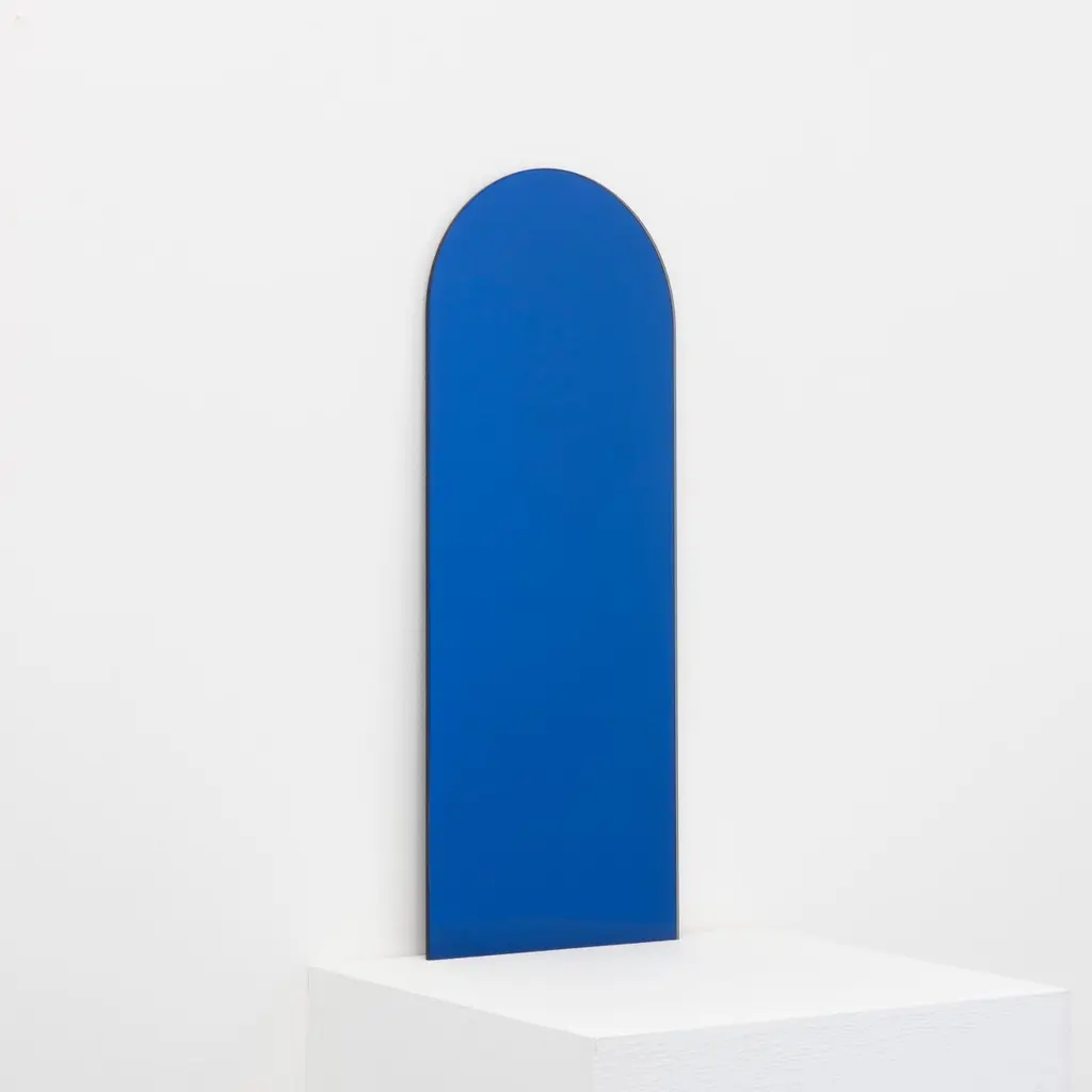 Minimalist blue tinted arch shaped frameless mirror with a floating effect. Quality design that ensures the mirror sits perfectly parallel to the wall. Designed and made in London, UK.Fitted with professional plates not visible once installed for an easy and safe installation. Lined at the back with a quality protective film. Supplied with all accessories, including screws and wall plugs.This mirror is fully customisable. Shipped safely worldwide.The images show a small size, measuring 27cm x 68cm x 0.6cm / 26.8'' x 10.6'' x 0.24’’.Note that the standard hanging position for this mirror is vertical. If you wish for the mirror to be hanged horizontally, please let our team know and we may adapt the hanging system accordingly.ORDERS OF MULTIPLE MIRRORS OF THE SAME TYPE: Please contact us to receive a Packing and Shipping quote when ordering multiple mirrors of the same type. An order for multiple mirrors of the same type may not be accepted without extra packing and shipping fees. Thank you.
