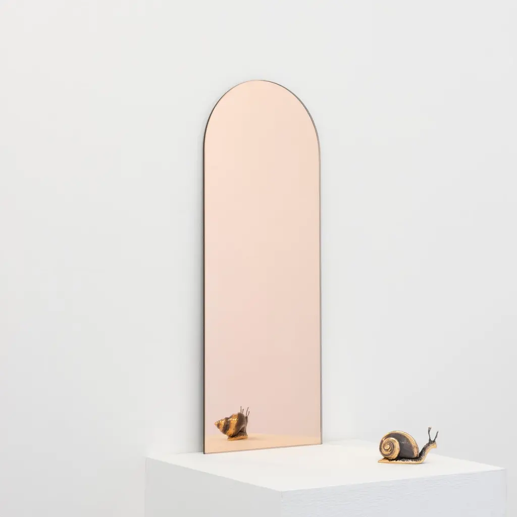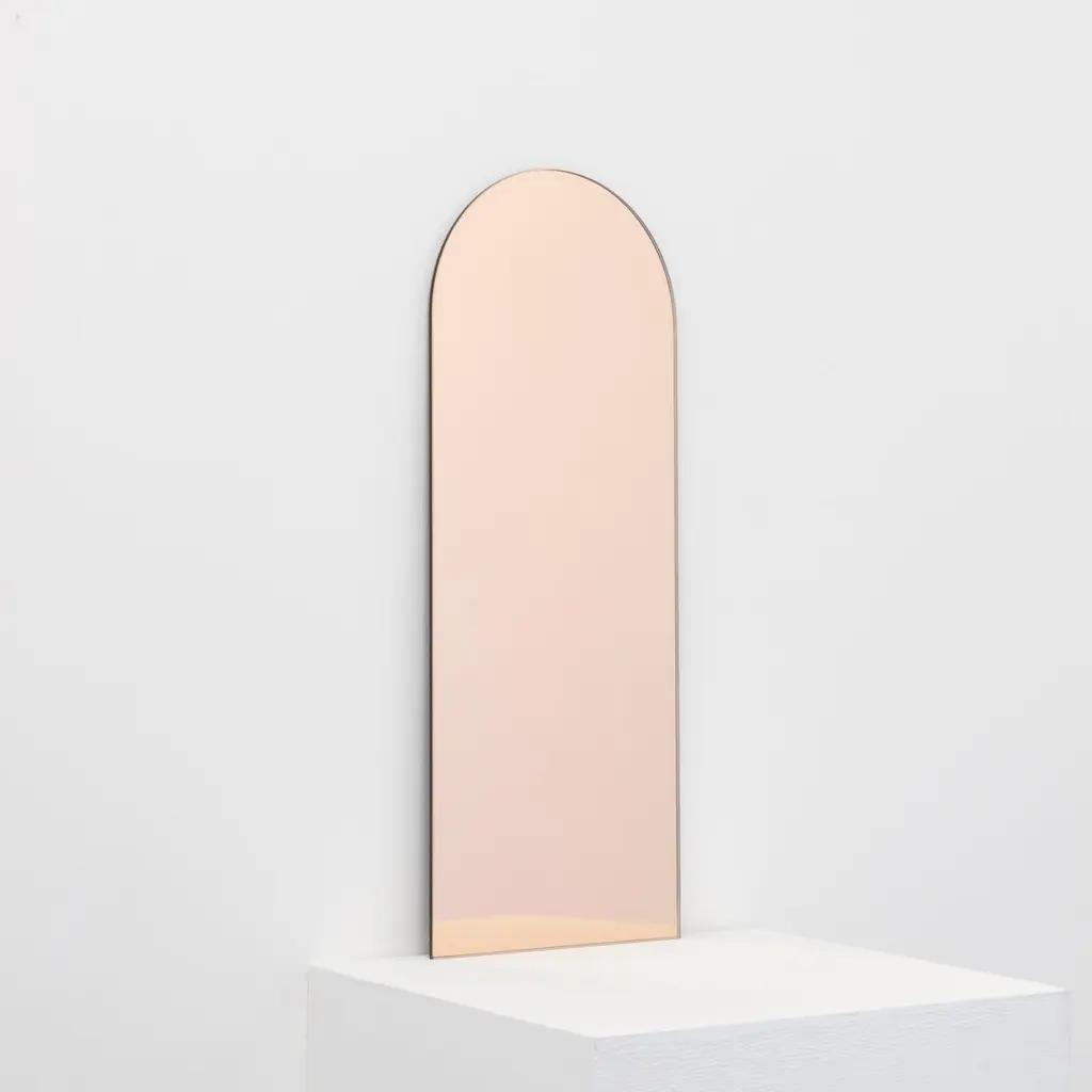 Minimalist arch shaped frameless rose gold tinted mirror with a floating effect. Quality design that ensures the mirror sits perfectly parallel to the wall. Designed and made in London, UK.Fitted with professional plates not visible once installed for an easy and safe installation. Lined at the back with a quality protective film. Supplied with all accessories, including screws and wall plugs.This mirror is fully customisable. Shipped safely worldwide.The images show a small size, measuring 27cm x 68cm x 0.6cm / 26.8'' x 10.6'' x 0.24’’.Note that the standard hanging position for this mirror is vertical. If you wish for the mirror to be hanged horizontally, please let our team know and we may adapt the hanging system accordingly.ORDERS OF MULTIPLE MIRRORS OF THE SAME TYPE: Please contact us to receive a Packing and Shipping quote when ordering multiple mirrors of the same type. An order for multiple mirrors of the same type may not be accepted without extra packing and shipping fees. Thank you.