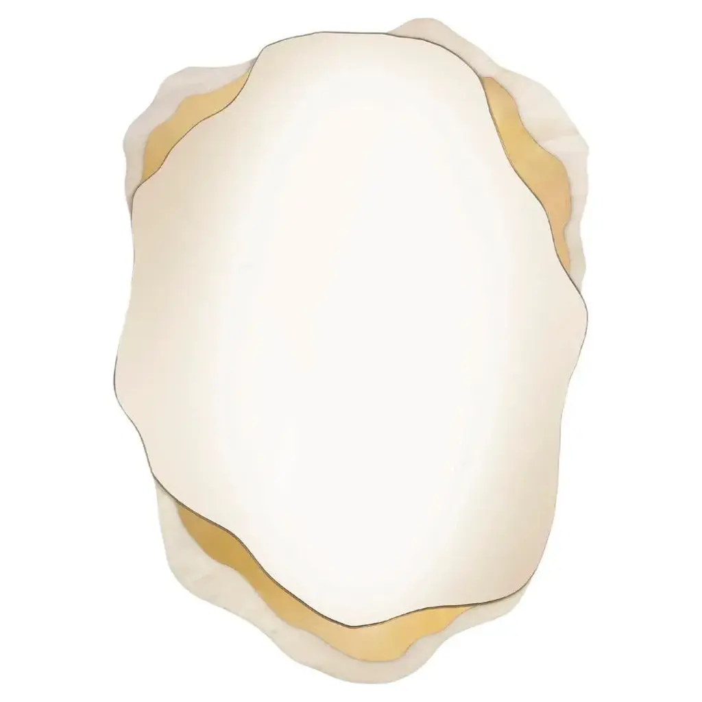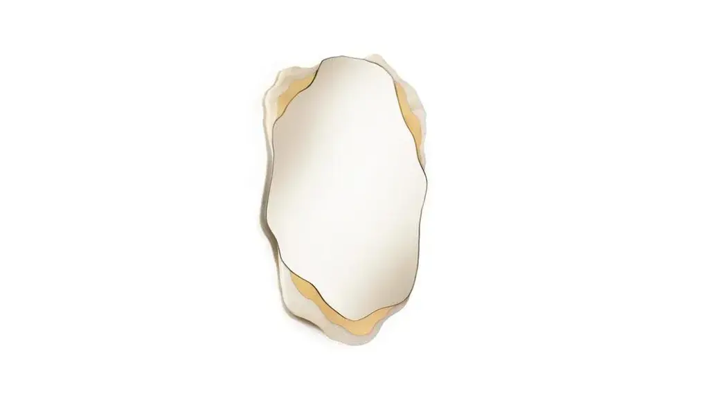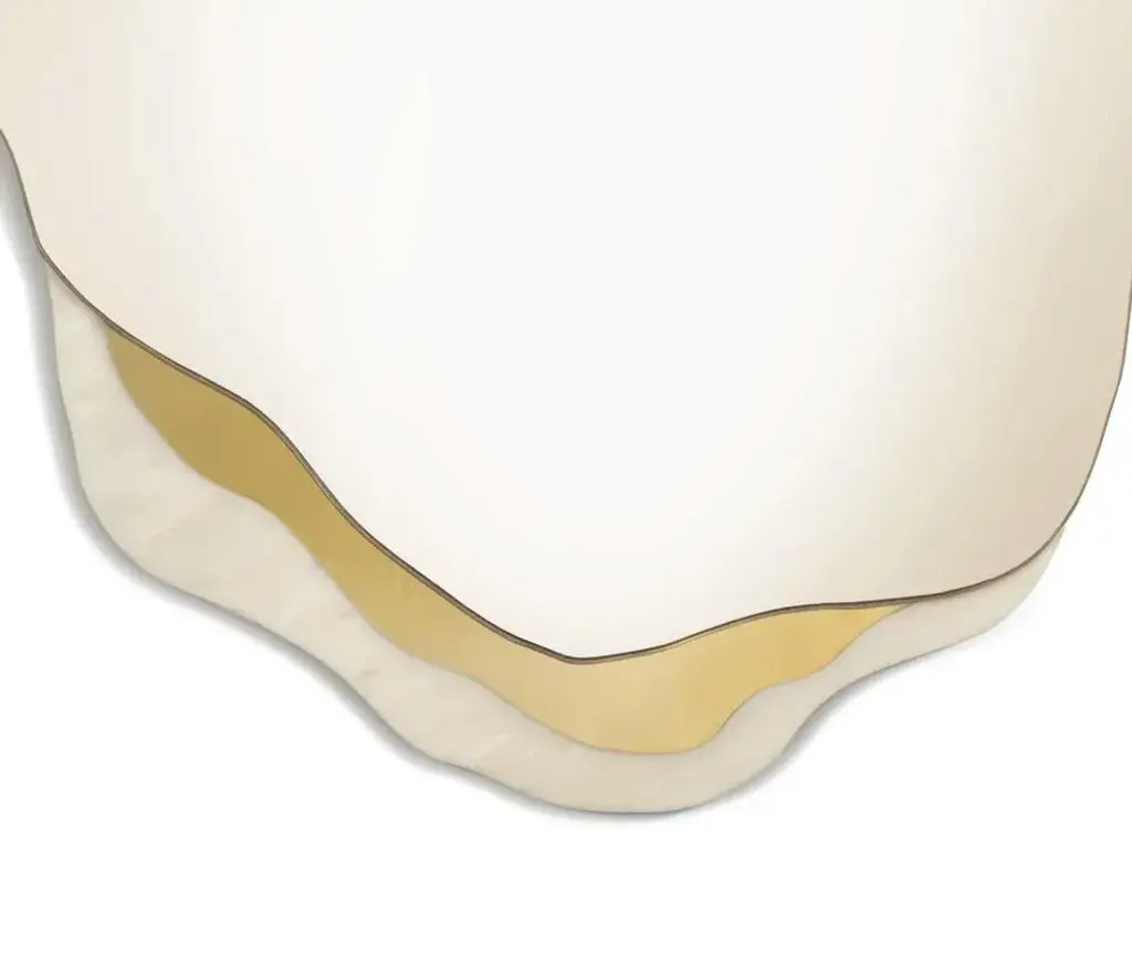 Arizona Estremoz Marble Mirror by InsidherLand Dimensions: D 4 x W 84 x H 115 cm. Materials: Estremoz marble, polished brass, bronze mirror. 46 kg. Available in other finishes. In the remote location of Coyote Buttes lies one of Arizona’s treasures. The Wave is a remarkable rock formation made of eroded sandstone in colour patterns ranging from earth tones to white. The wavy layers result from the slow wind and rain erosion and are comprised of Navajo Sandstone dunes that have calcified, turning into hardened rocks over time. The Wave is absolutely surreal with its undulating patterns and inspired the creation of the Arizona mirror. Formed by layers of noble materials such as marble, brass and bronze mirror that resemble the sandy shades of the rocky formation, Arizona is a piece that recreates the natural forces of the place through the materials layering and the sensuality of its infinite curves.