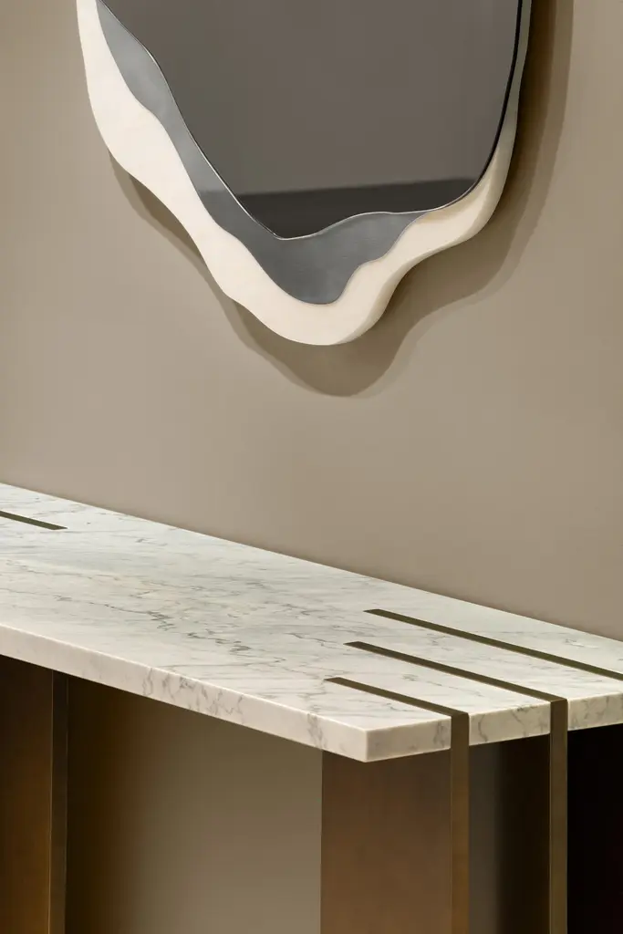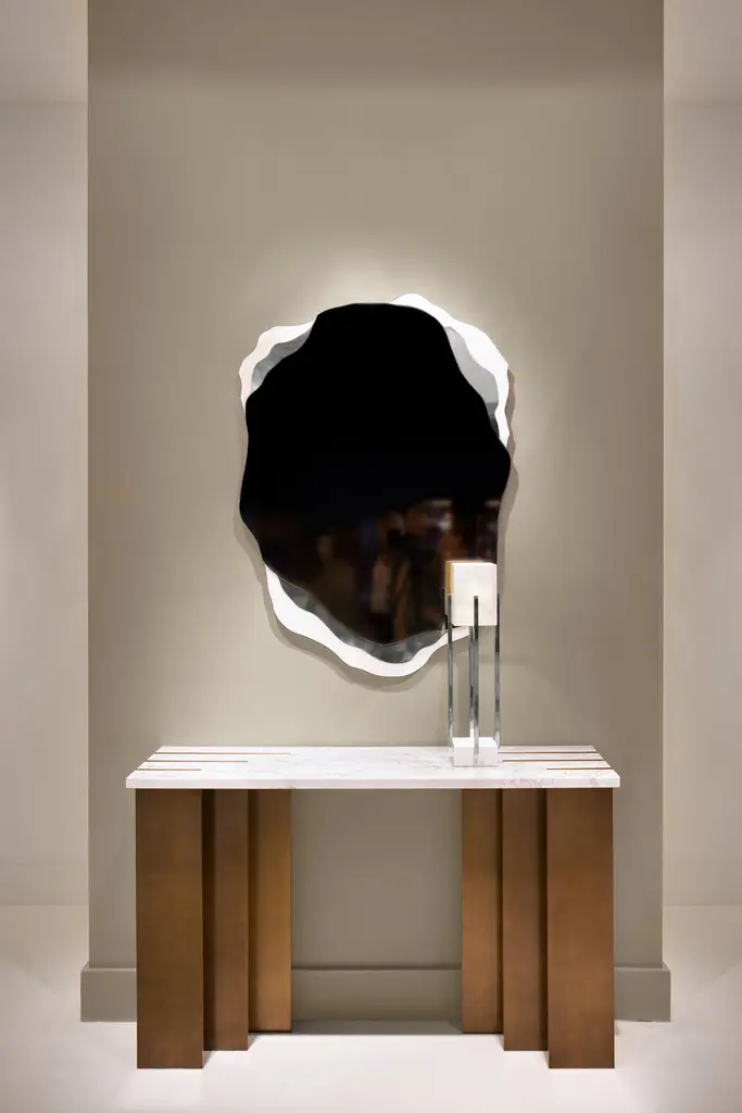 Best furniture design at the iluxury awards 2021.In the remote location of Coyote Buttes lies one of Arizona’s treasures.The absolutely surreal undulating patterns of ‘The Wave’ inspired the creation of the Arizona mirror. Formed by layers of noble materials such as marble,nickel and clear mirror that resemble the sandy shades of the rocky formation,Arizona is a piece that recreates the natural forces of the place through the materials layering and the sensuality of its infinite curves.Arizona mirror is a decorative sculpture and a state of art.Product details:Clear mirror, polished nickel and Estremoz marble.Product options:Other metals, marbles, wood veneers or lacquered in any Ral Classic color finished in matt, half gloss or high gloss varnish.Measures: weight 46kg 101,5 lbsMade to order. Custom sizes and other finishes are available under request.Designed by Joana Santos Barbosa, 2019. Handmade in Portugal.