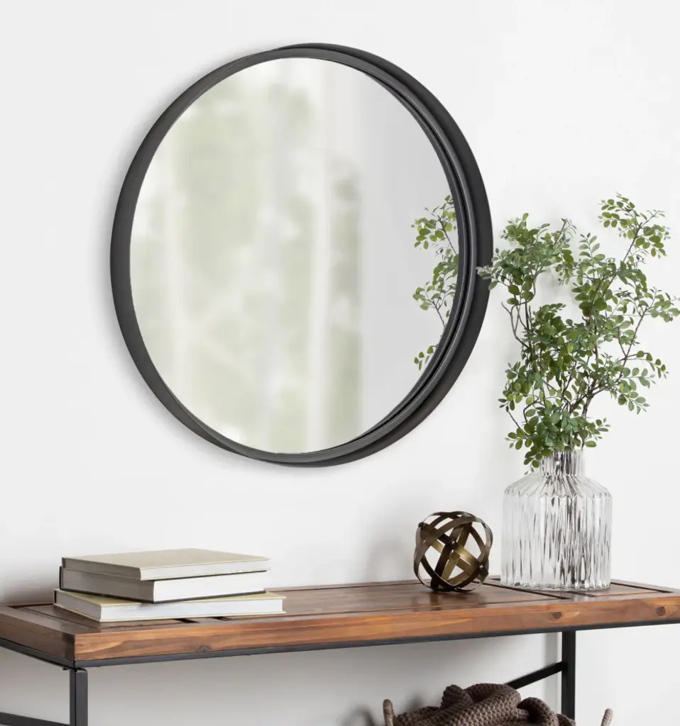 This beautiful, sophisticated round mirror is an excellent addition to your industrial living space or rustic wall display. It features a 22 inch diameter with a heavy-gauge, 2mm frame for a robust, ultra-resilient look. It even has a charcoal powder-coat finish that is both elegant and resistant to years of wear and tear. Its round, minimalist shape is the perfect symmetrical detail that provides your home with a practical, eye-catching statement piece. Bringing a mirror into your home elevates your space by spreading light and bringing dimension to any room. Hang the sophisticated Armenta mirror in any modern or industrial-inspired living room, bedroom, entryway, or dining room. If you want a contemporary single or double vanity, the Armenta also looks beautiful as a bathroom mirror. Its 22 inch diameter gives it the perfect stature to showcase on its own or in multiples for a themed wall display. Hang it in only a matter of seconds with the convenient metal keyhole hangers securely attached to the back.• QUALITY MATERIALS: The Armenta round wall mirror features a premium heavy-gauge 2mm metal frame with a powder-coat charcoal gray finish to protect against wear and tear• TRENDY SHAPE: This mirror has a modern, round shape that brings an artful symmetry to any wall in your home• EXCELLENT SIZE: The Armenta Round Wall Mirror has a 22 inch diameter, giving you plenty of room to showcase it on its own or in multiples• READY FOR ANY ROOM: This mirror fits into any minimalist or industrial decor theme: hang it above the mantle, over a console, or above a sink as a bathroom vanity• EASY TO HANG: Hang the Armenta in a matter of seconds with metal keyhole hangers