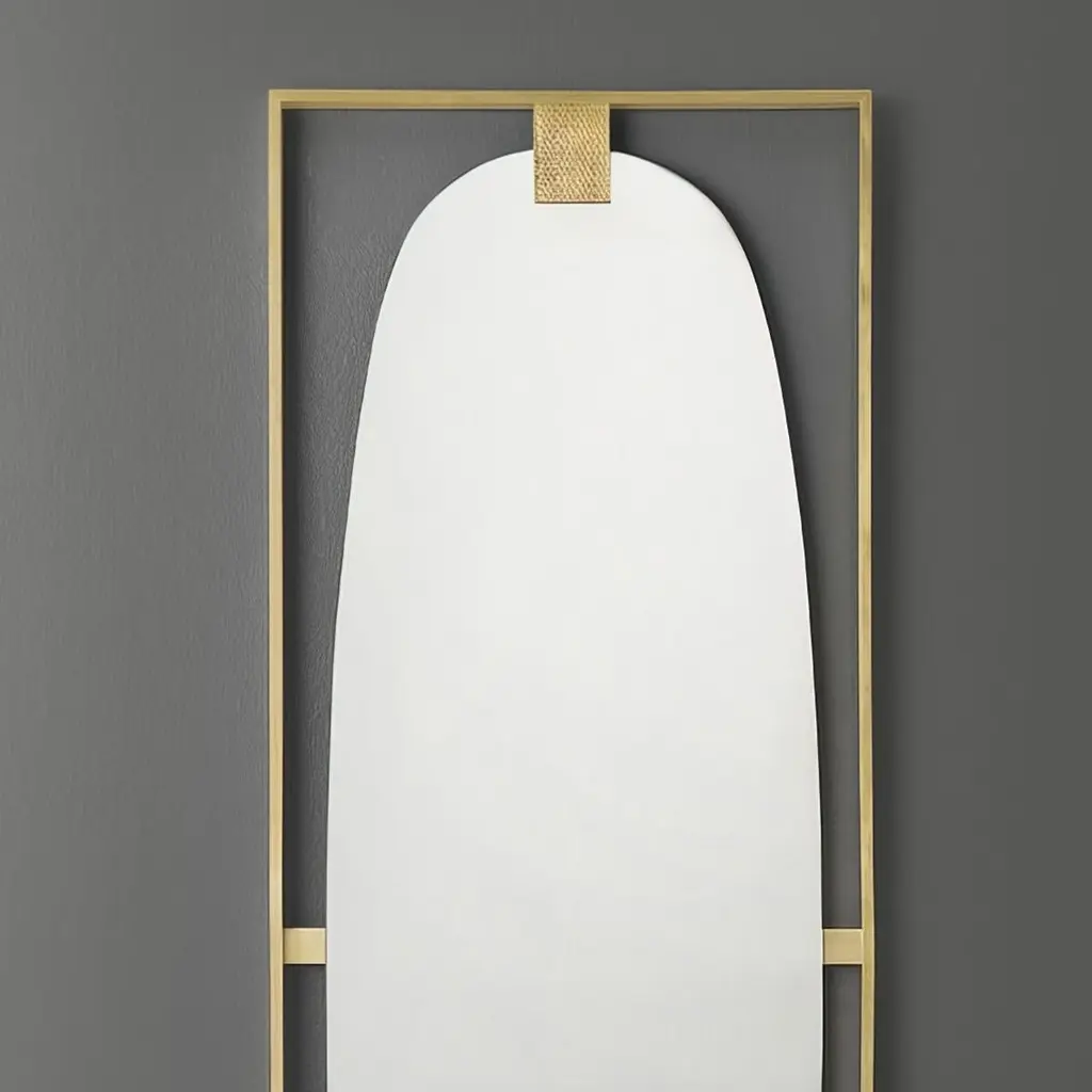 Art Deco Brass Wall Mirror, a tall rectangular form wall mirror with a polished satin brass frame centered with an oval mirror plate.Dimensions: 19.5" W x 1.75" D x 56" H.