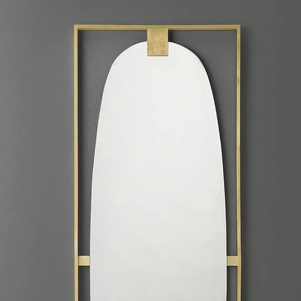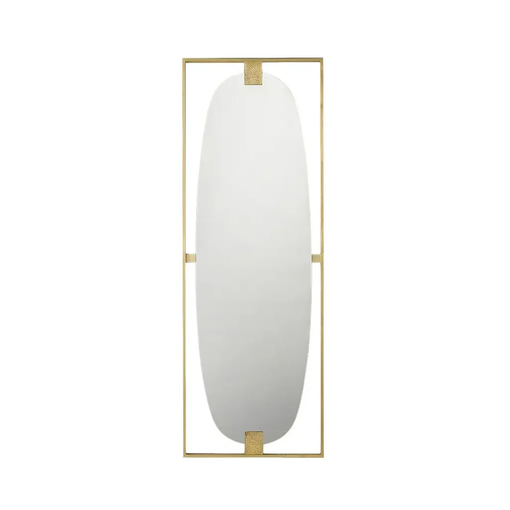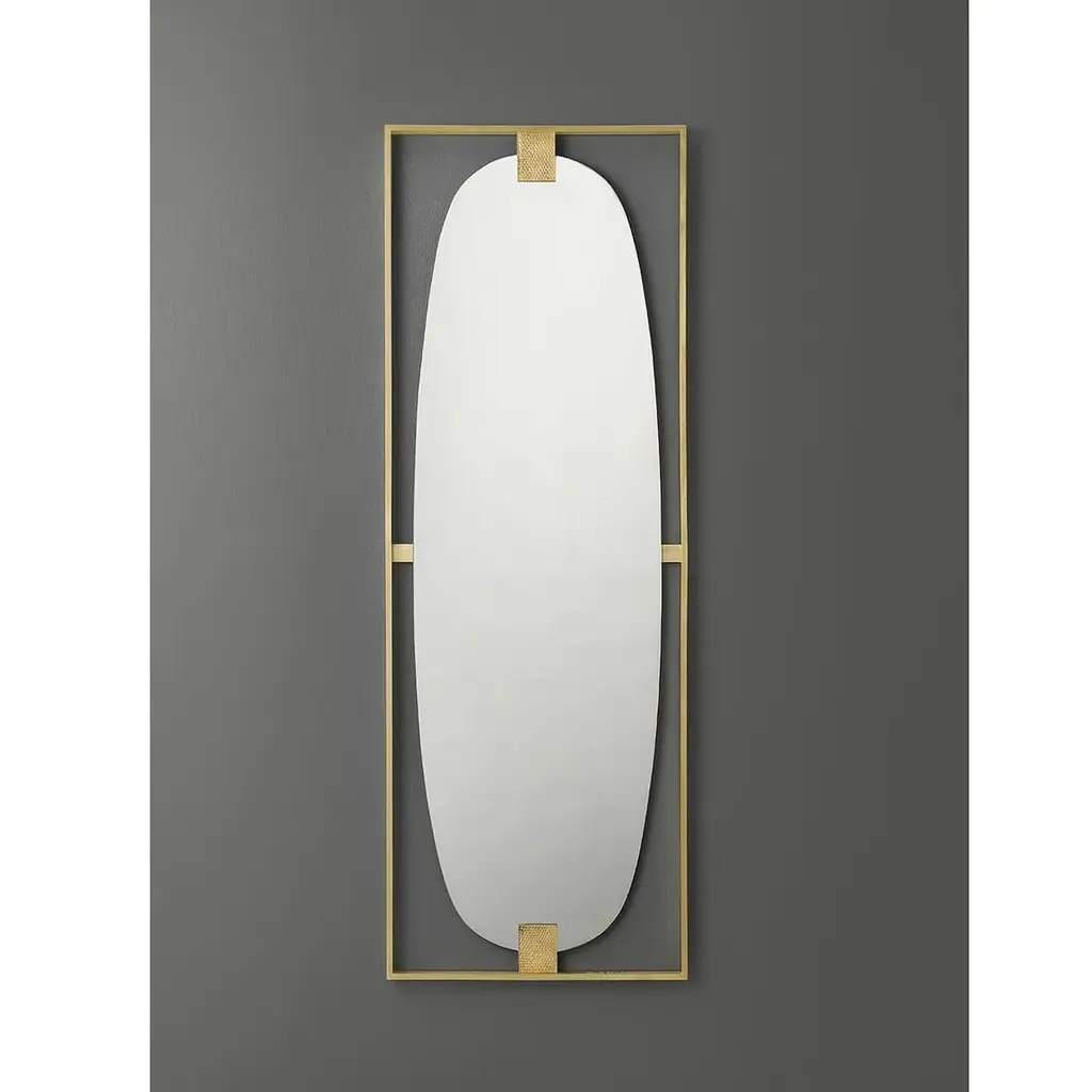 Art Deco Brass Wall Mirror, a tall rectangular form wall mirror with a polished satin brass frame centered with an oval mirror plate. Dimensions: 19.5" W x 1.75" D x 56" H