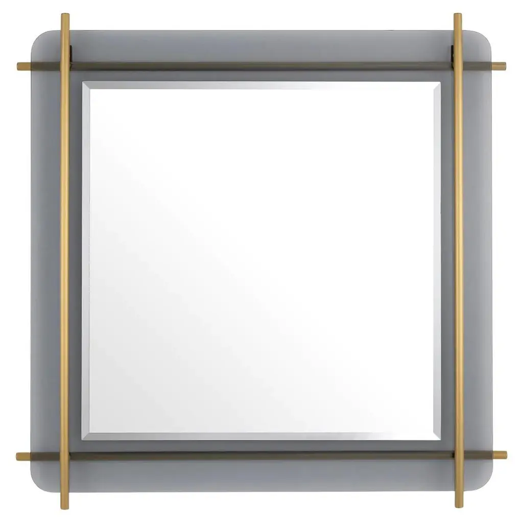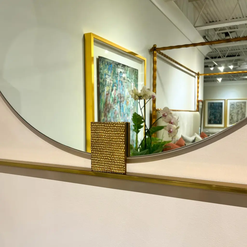 This exquisite piece features a sleek circular mirror framed and floating within a bold square structure, creating a striking contrast that embodies modern elegance. Textured brass accents introduce a touch of artisanal craftsmanship, making this mirror a statement piece for discerning interiors.Whether placed in a grand entryway, above a console, or as the focal point in a living area, the mirror transforms its surroundings with its bold yet refined presence. A testament to timeless design, this mirror blends seamlessly with both contemporary and classic decor, bringing a sense of depth, luxury, and artistry to your home.Dimensions: 40" W x 40" H