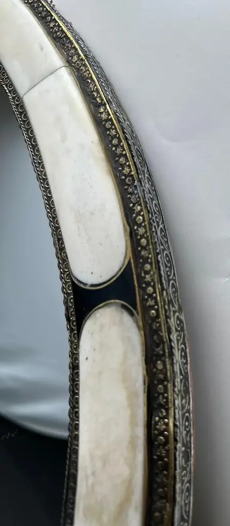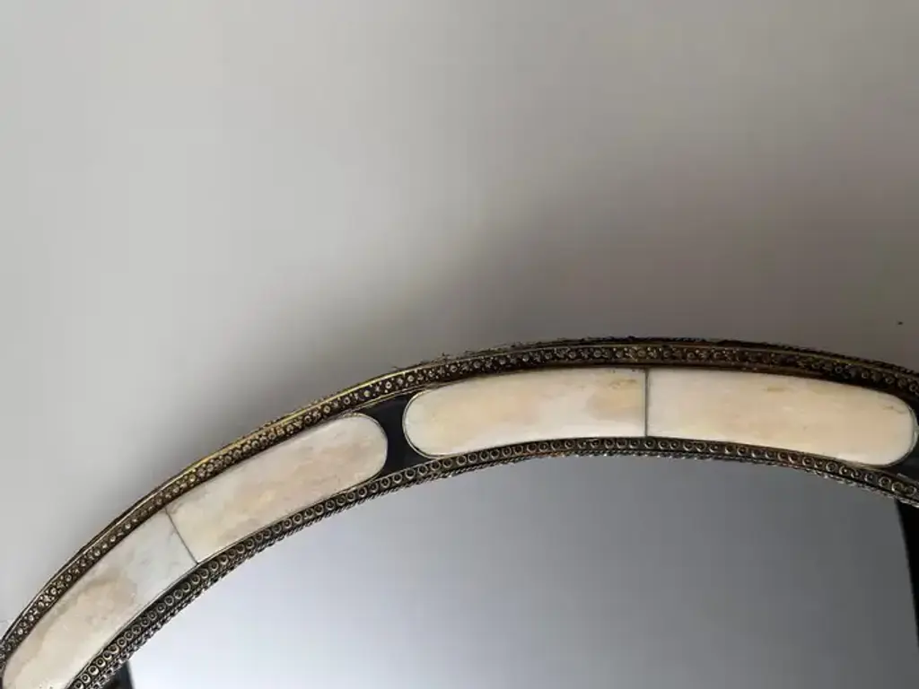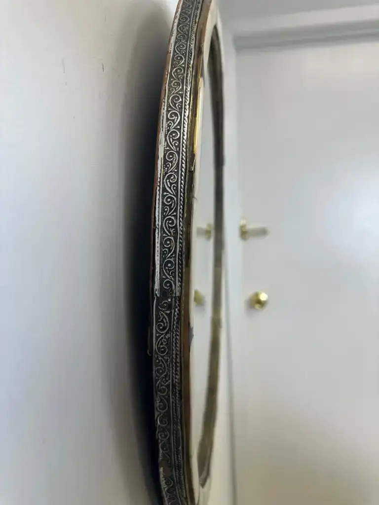 An exquisite pair of Art Deco-style round mirrors exuding timeless sophistication and featuring a harmonious blend of materials and craftsmanship. The frame is meticulously handcrafted, incorporating a striking contrast of black and white elements, further elevated by elegant brass filigree inlays that add a touch of refined opulence. The geometric symmetry, a hallmark of the Art Deco movement, is subtly expressed in the segmented design encircling the mirror, creating a visually balanced and luxurious aesthetic. Adding to its artisanal charm, the mirrors are backed with genuine leather, ensuring not only durability but also a refined finish that speaks to their bespoke nature. The pair of Art Deco style mirrors are perfect for enhancing interiors with a sense of vintage glamour and understated elegance. Dimensions : 26 inch Diameter 1 inch D