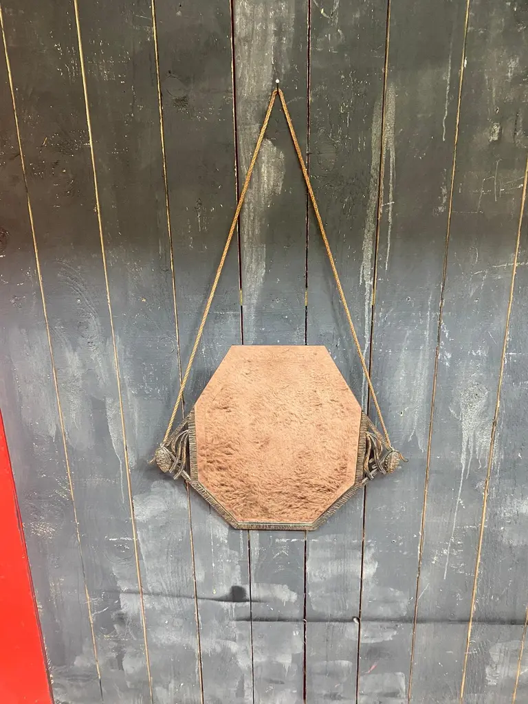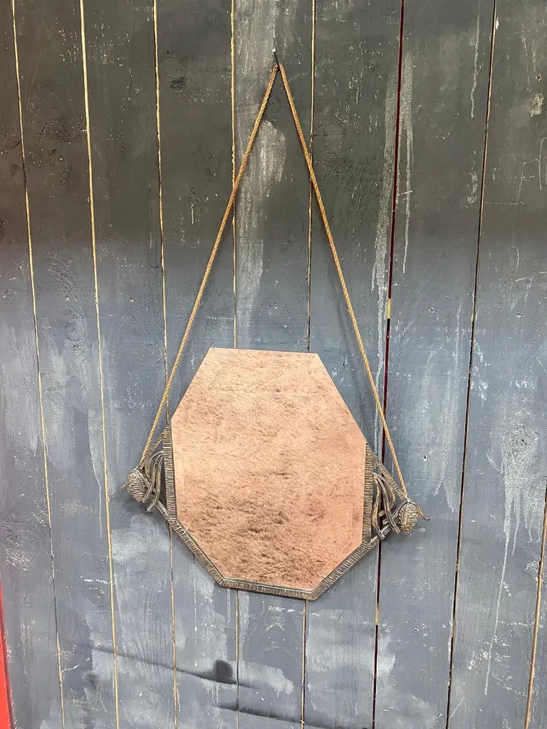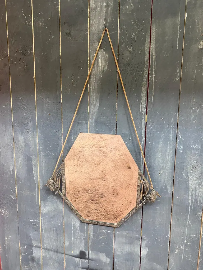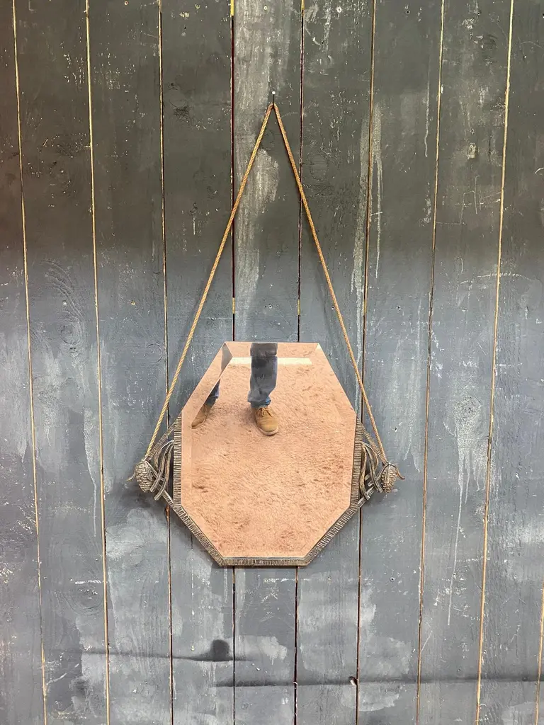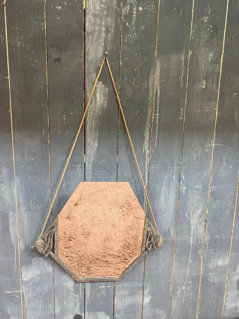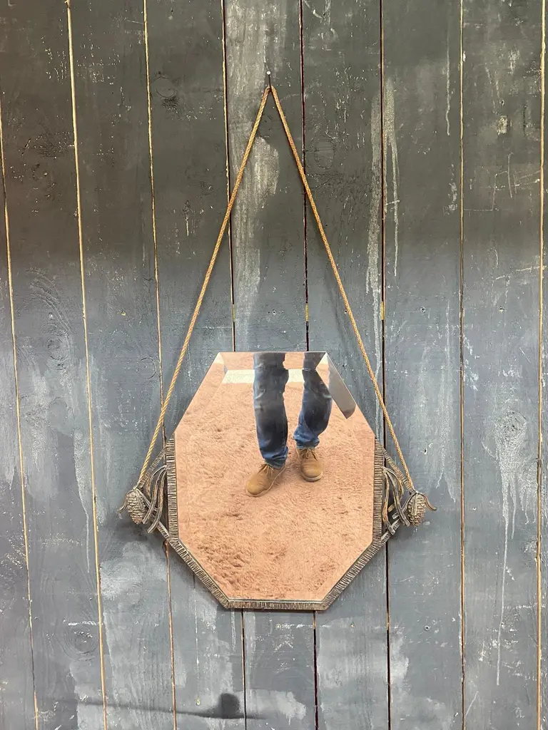 Art Deco wrought iron mirror decorated with pine cones, beveled mirror circa 1930the mirror is white, the brown color is the reflection of a carpettotal height with rope is 41.34" (105 cm)POSSIBILITY OF HAVING A SECOND IDENTICAL ONECurrently with the crashed mirror.