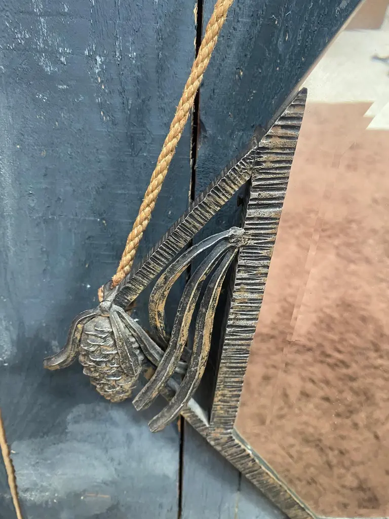 Art Deco Wrought Iron Mirror Decorated With Pine Cones, Beveled Mirror, 1930