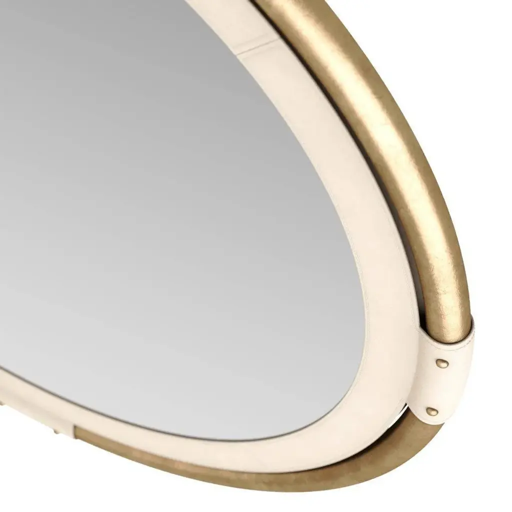 A traditional round of beveled glass is elegantly framed with antiqued brass bullnose. An inset and wrapped detail in topstitched ivory leather accented with brass bolts for visual interest. Fitted with a security cleat, this classical style was designed to be hung vertically. Finish will vary.