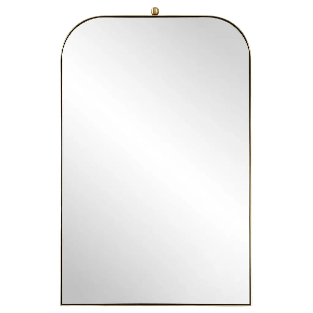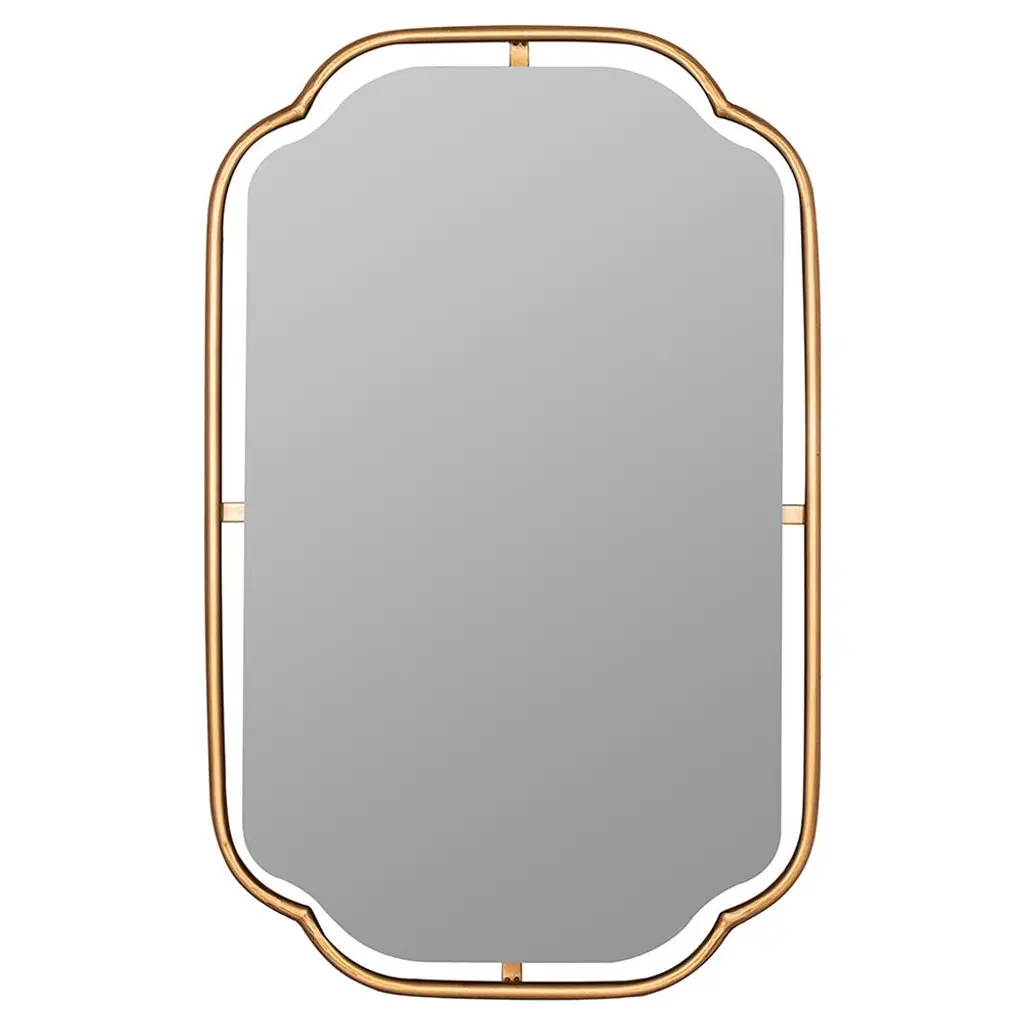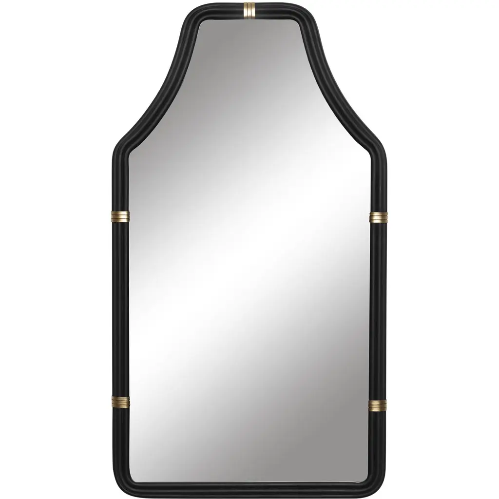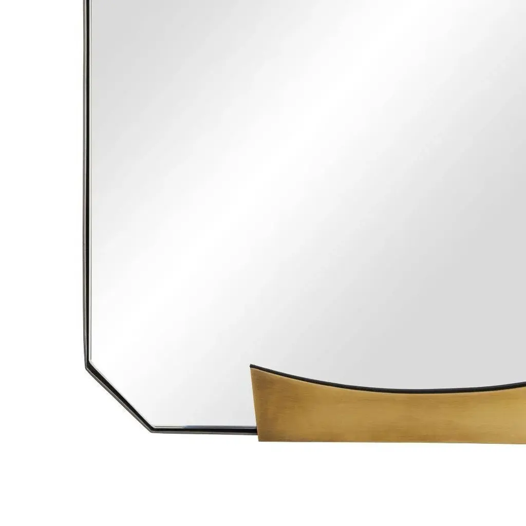 Elegantly modern, the Kris Rectangular Mirror displays a refined geometric design. Gracefully formed brass clasps hold this mirror top and bottom, all in an antique brass finish over a blackened iron frame. The raised design creates depth and adds chic sophistication. Security cleat hanging hardware included and allows for vertical or horizontal display.