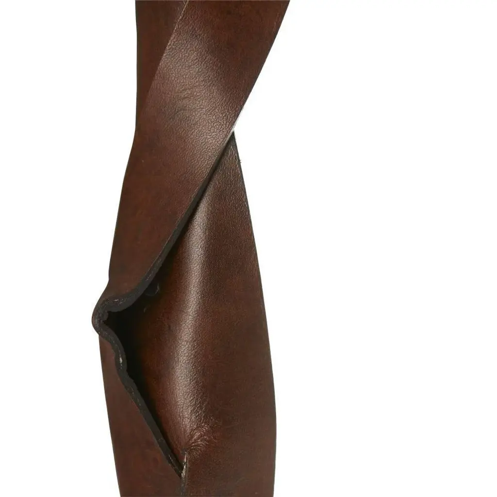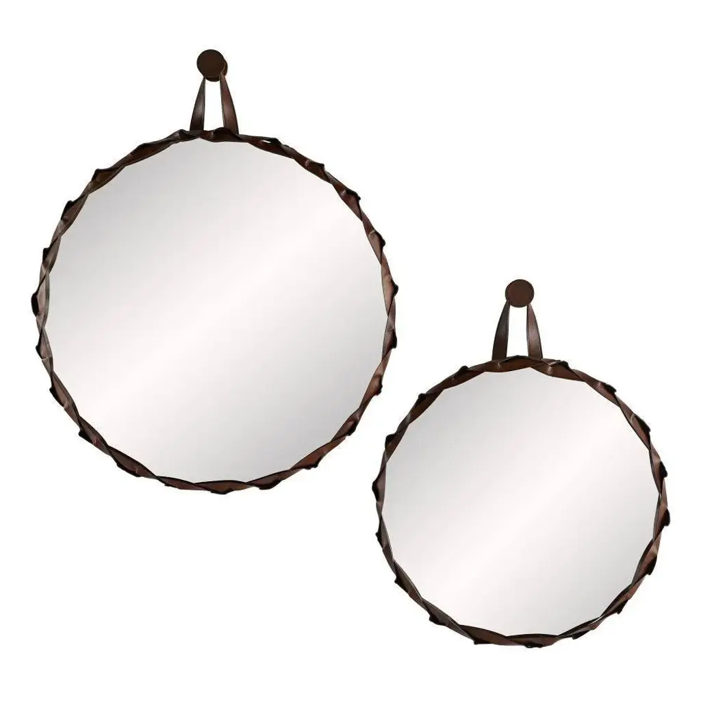 Equal parts classic and masculine, this mirror is a simple design with a twist. literally! Bands of tobacco-hued leather surround the plain glass mirror and is topped with a brass- plated knob and matching leather loop, so it has an almost equestrian feel. The knob is purely decorative, though, because the base is mounted with a security cleat. It is also available in a smaller version (4712).