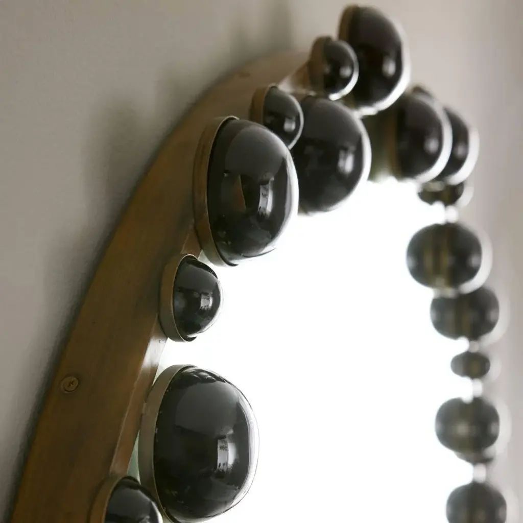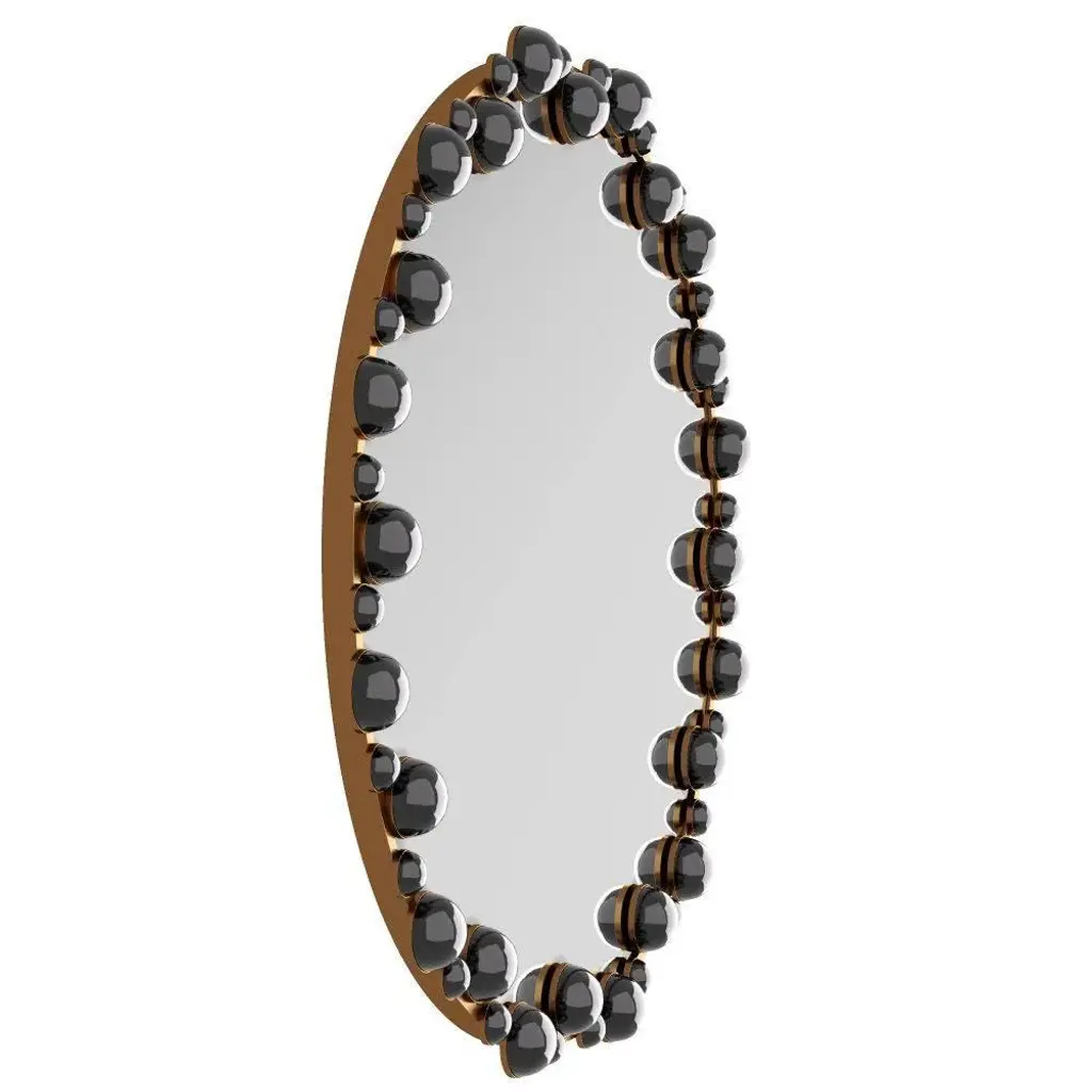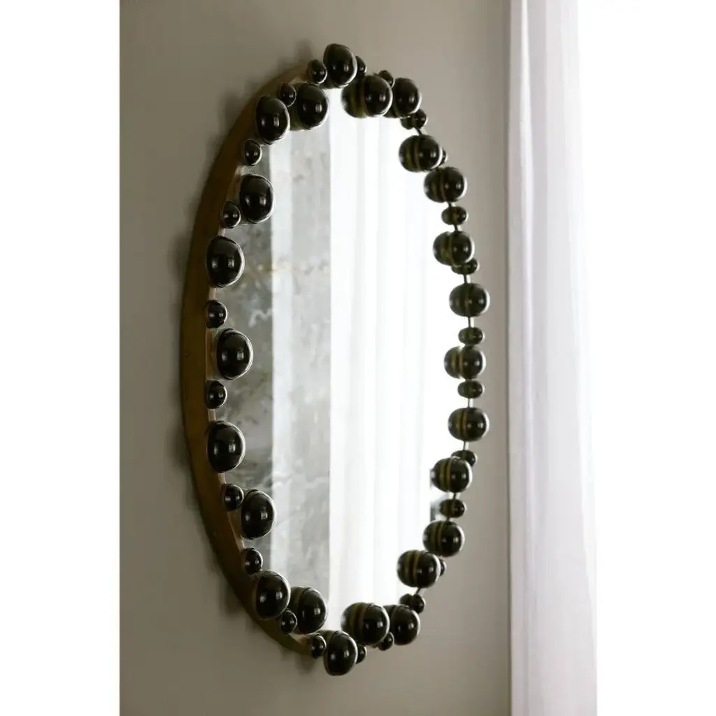 A playful mix of sophisticated materials and organic forms. Inspired by a jewelry setting, a roundel of black glass is encircled with effervescent dome-shaped spheres of varying sizes. Encased in an antique brass iron, it is fitted with a cleat for secure hanging. Finish will vary. Vertical only.