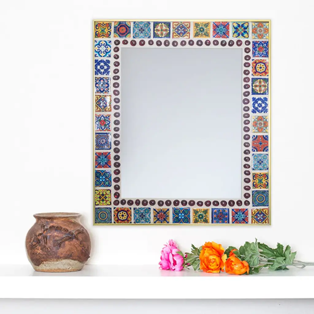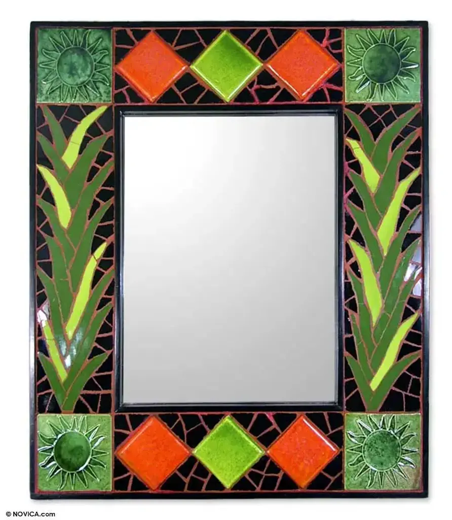 Green sunflowers cast a spell of magical elegance in a design by India's Lalit Sakhuja. The frame is flanked by verdant ferns, while the top and bottom feature a trio of colorful rhombuses each. Sakhuja crafts the mirror frame of ceramic tiles and mango wood. Features a copper wire at the back for hanging.