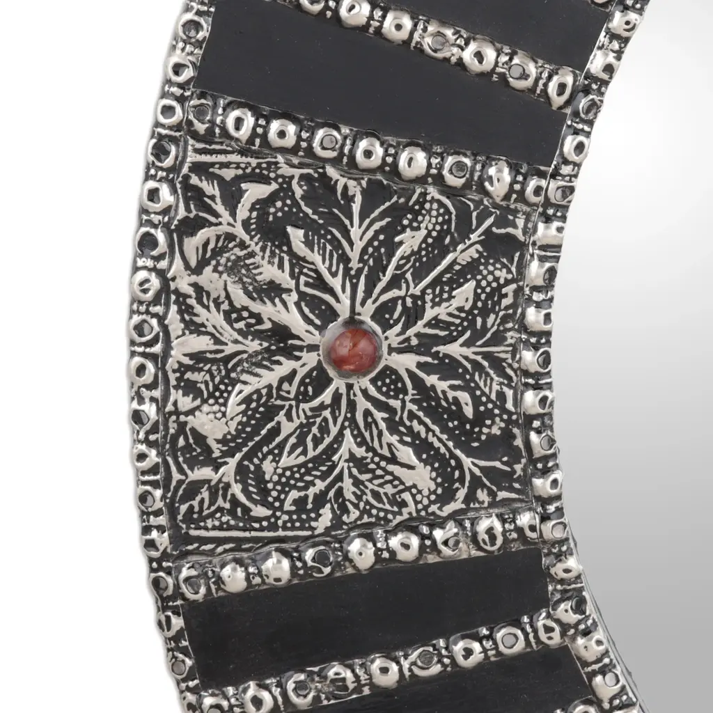 Crafted from mango wood, this round wall mirror is decorated with embossed nickel-plated brass with floral motifs. Khalid Ali in India presents the mirror, which is accented by gem-like cabochons of colorful glass.