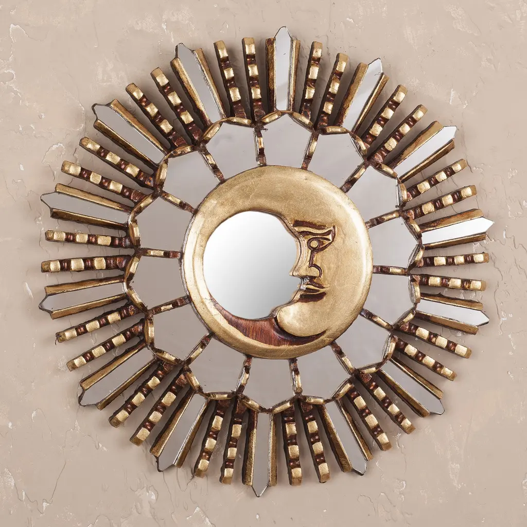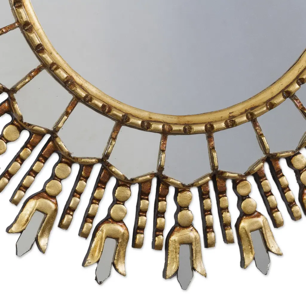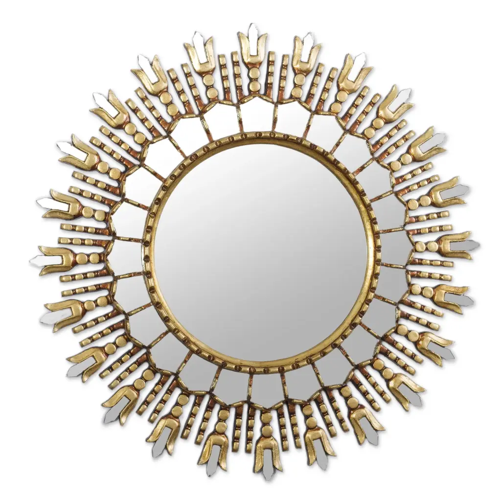 Handcrafted from mohena wood with mirrored accents, elegant rays evoke the sun. Peruvian artisan Gliseria Soto creates this wall mirror, which is crafted in the style of colonial handicrafts. Bronze leaf is applied over the wood for a gleaming gold-tone finish.