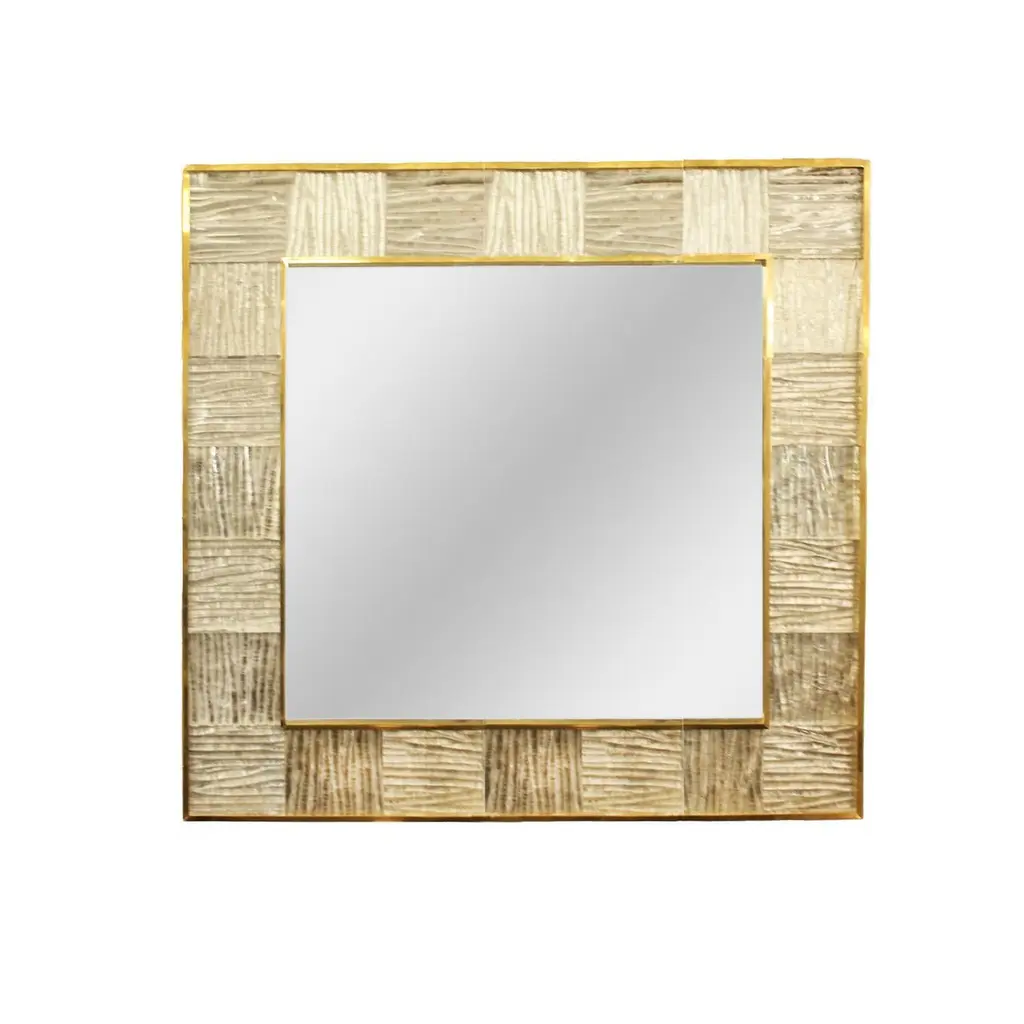 Hand-crafted Murano glass square tile and brass framed mirror, Italy.This mirror is currently available as shown in our NYC showroom.Custom dimensions available. Art glass available in additional colors. Lead time is 7-8 weeks. Please inquire with Venfield.