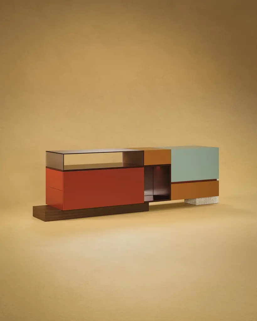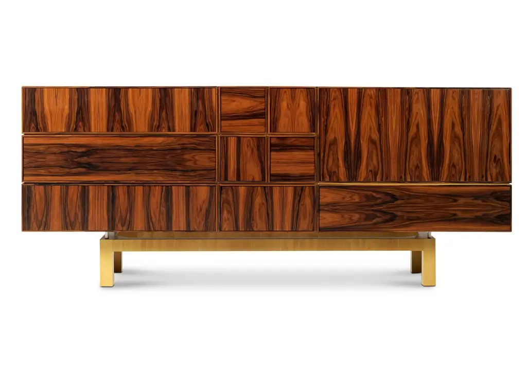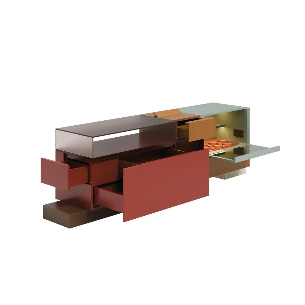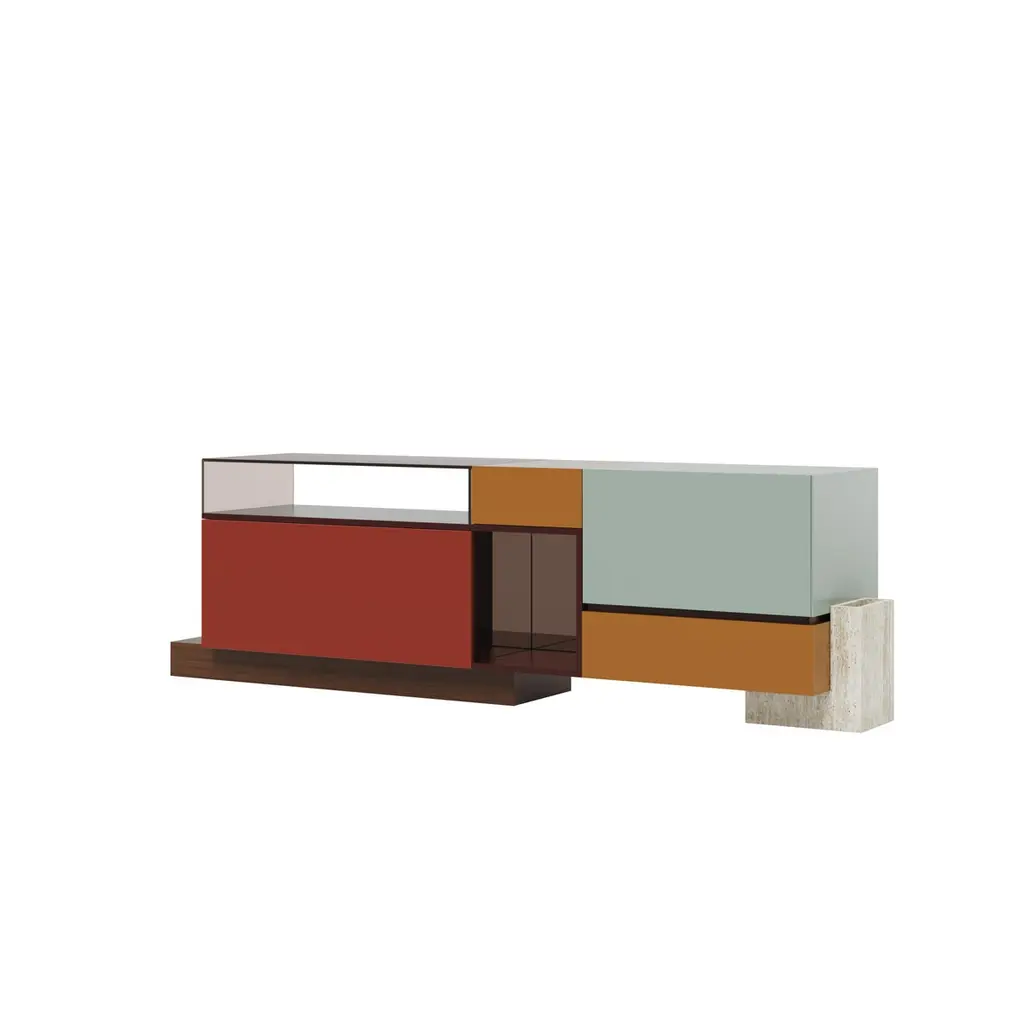 "God is in the details," proclaimed Mies van der Rohe, and the Moduler Sideboard embodies this belief through its exquisite details and exceptional craftsmanship. Reflecting the precision and sophistication of iconic modernists, this piece inspires awe.With its bold geometric silhouette, the Moduler Modern Sideboard is crafted from exotic woods, resting on a walnut and travertine base. Its lacquered finish comes in distinctive tones, each bringing a contemporary flair.Inside, elegance unfolds with a stunning contrast of leather, polished brass accents, and bronze mirrors. Frosted bronze glass and a mirrored top surface enrich the overall design, showcasing a profound appreciation for modern aesthetics.More than just furniture, this sideboard serves as a statement piece, infusing architectural elegance and artistic presence into any sophisticated living space.