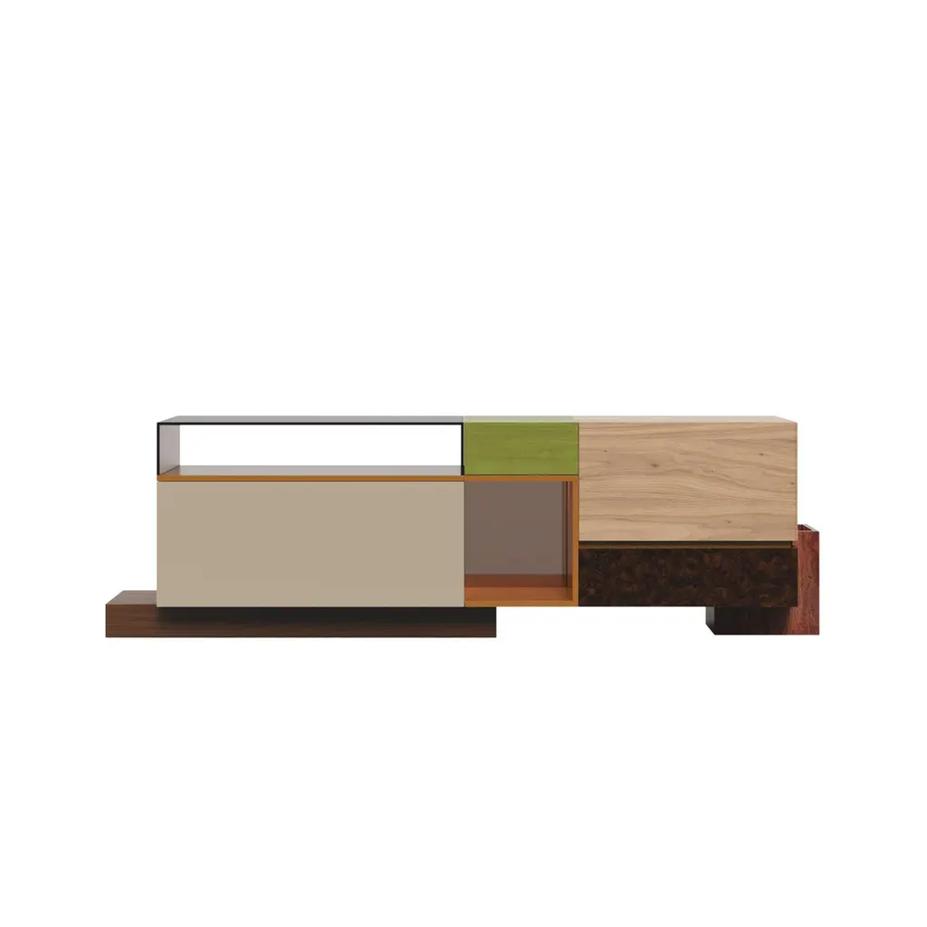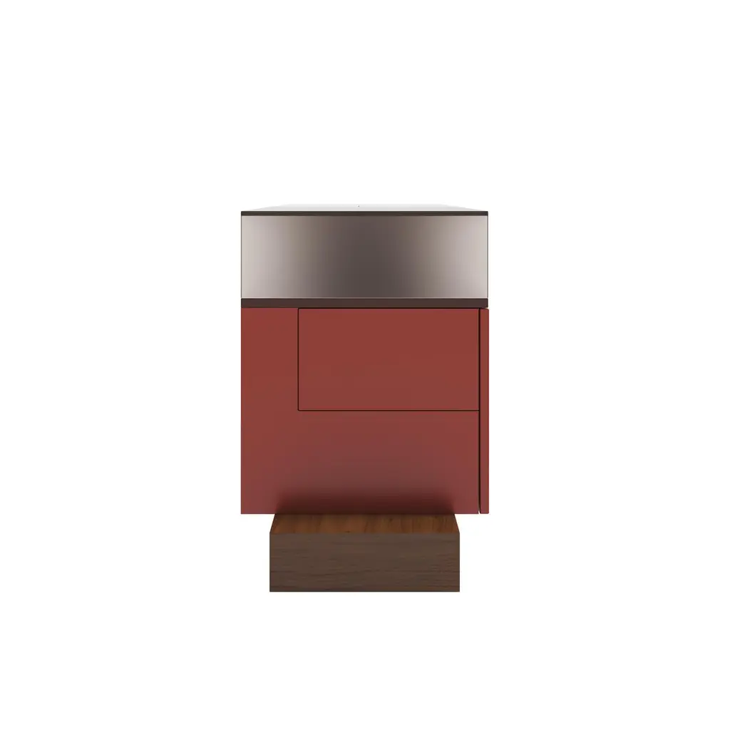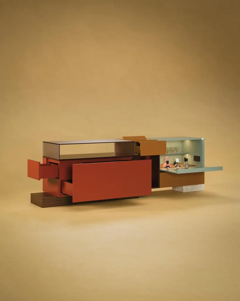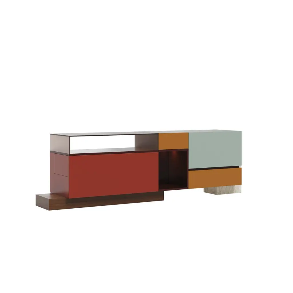 "God is in the details," proclaimed Mies van der Rohe, and the Moduler Sideboard embodies this belief through its exquisite details and exceptional craftsmanship. Reflecting the precision and sophistication of iconic modernists, this piece inspires awe.With its bold geometric silhouette, the Moduler Modern Sideboard is crafted from exotic woods, resting on a walnut and travertine base. Its lacquered finish comes in distinctive tones, each bringing a contemporary flair.Inside, elegance unfolds with a stunning contrast of leather, polished brass accents, and bronze mirrors. Frosted bronze glass and a mirrored top surface enrich the overall design, showcasing a profound appreciation for modern aesthetics.More than just furniture, this sideboard serves as a statement piece, infusing architectural elegance and artistic presence into any sophisticated living space.