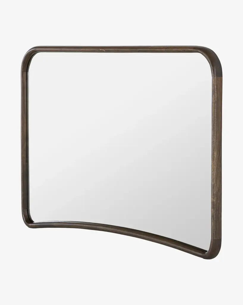 The Arvid Wall Mirror features a gracefully curved solid mango frame in an aged brown finish. Its timeless design and playful shape bring depth and character to any entryway, bedroom, or living space.