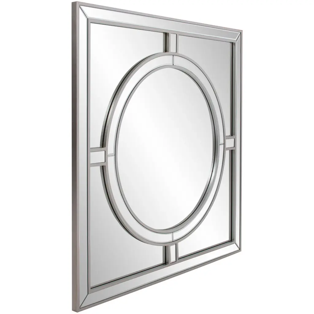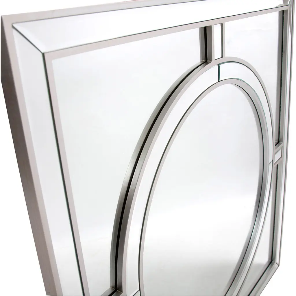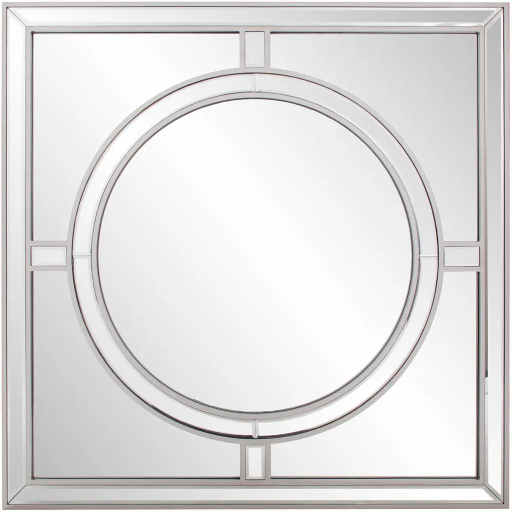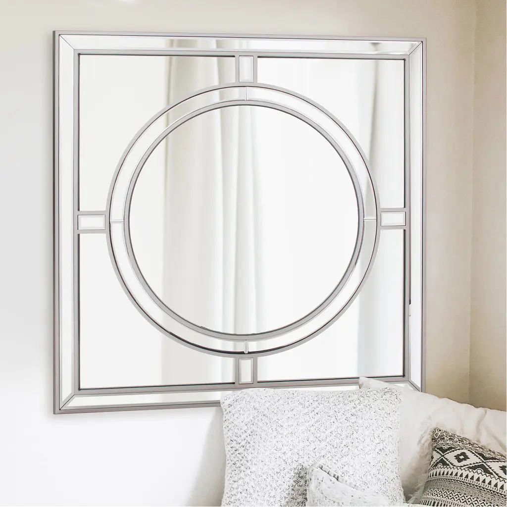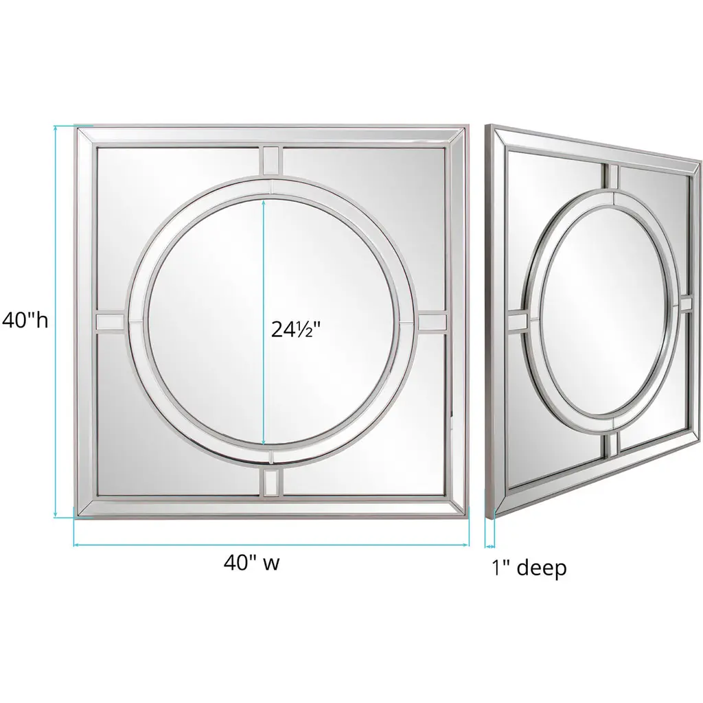 Our Arwen Mirror is a gorgeous piece. It is composed of a simple square shape with a round central design creating a windowpane look. The frame is then trimmed in champagne silver leaf. The end result is a striking piece perfect (but not limited) for your Modern, Art Deco or Traditional look. Alone or in a group on the wall, it is a perfect focal point for an entryway, bathroom, bedroom or any room in your home. D-rings are affixed to the back of the mirror so it is ready to hang right out of the box!